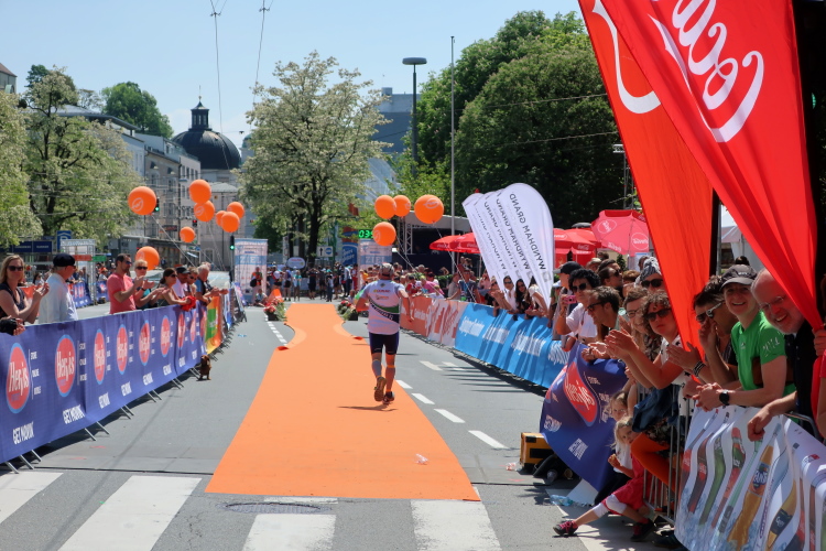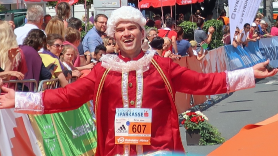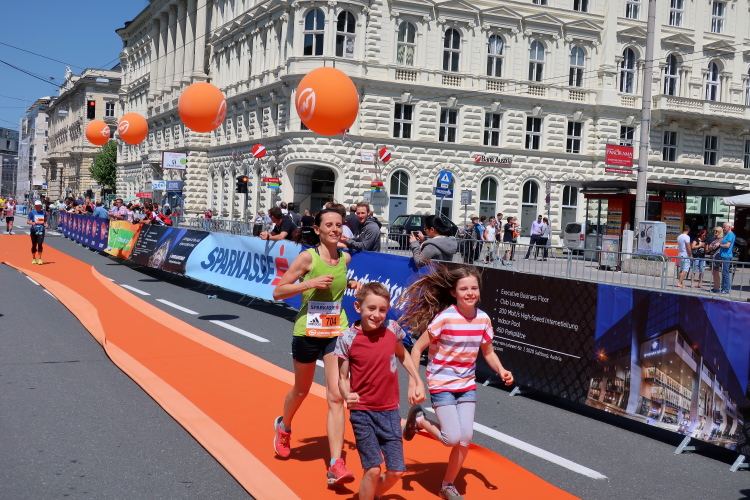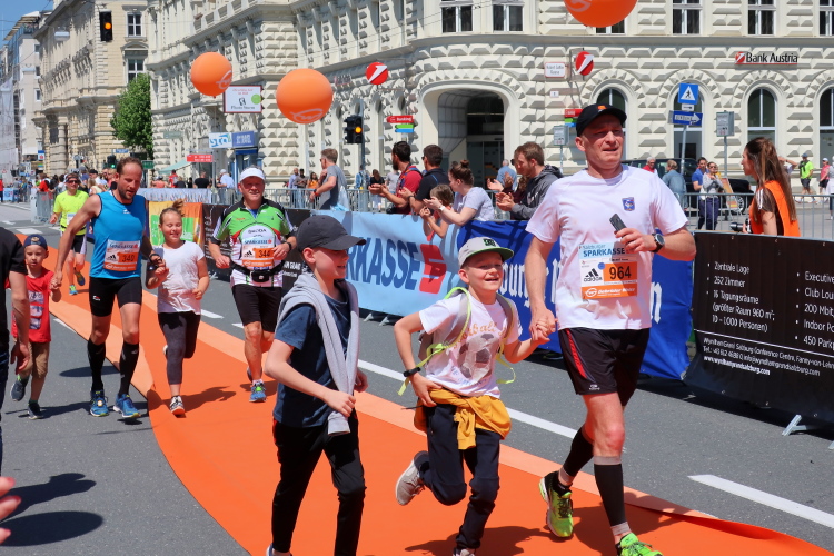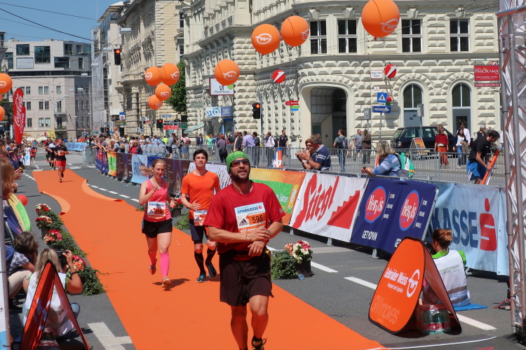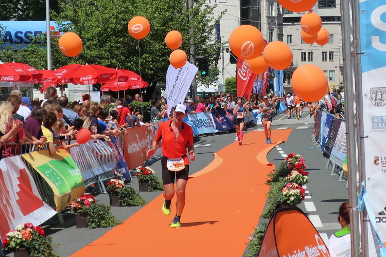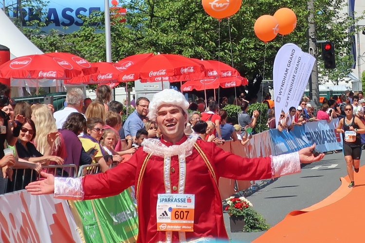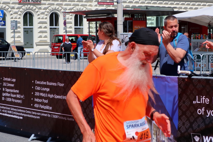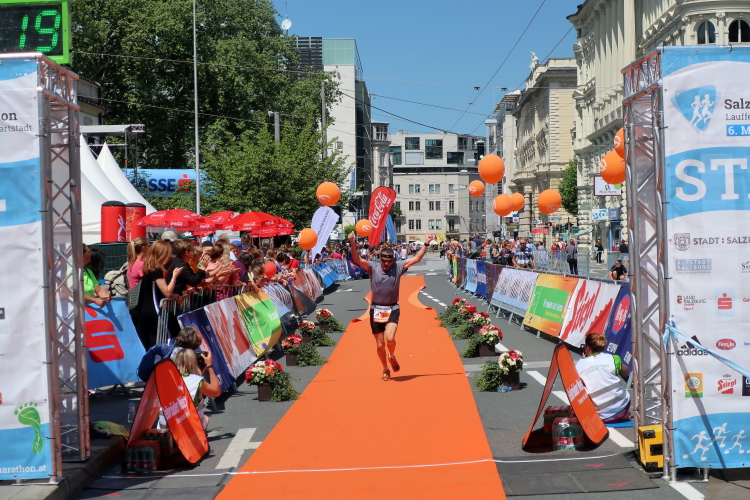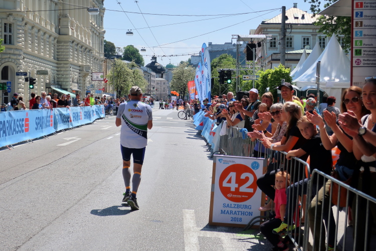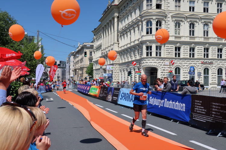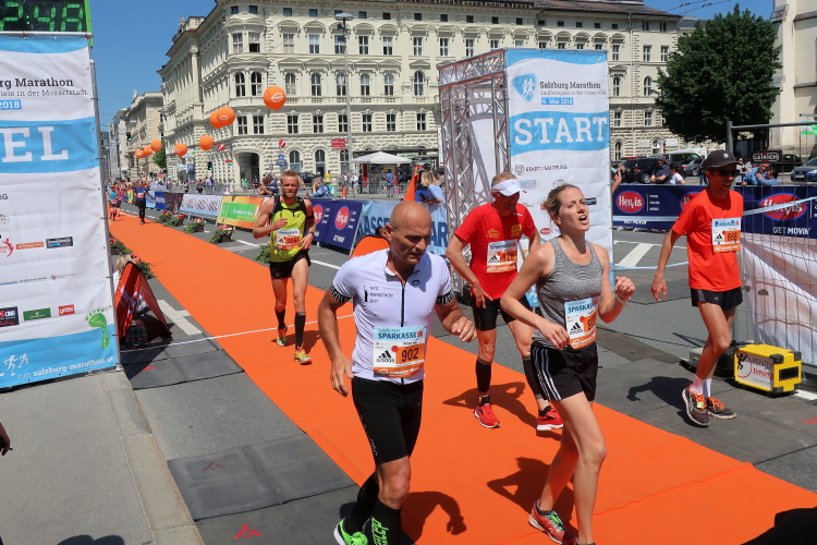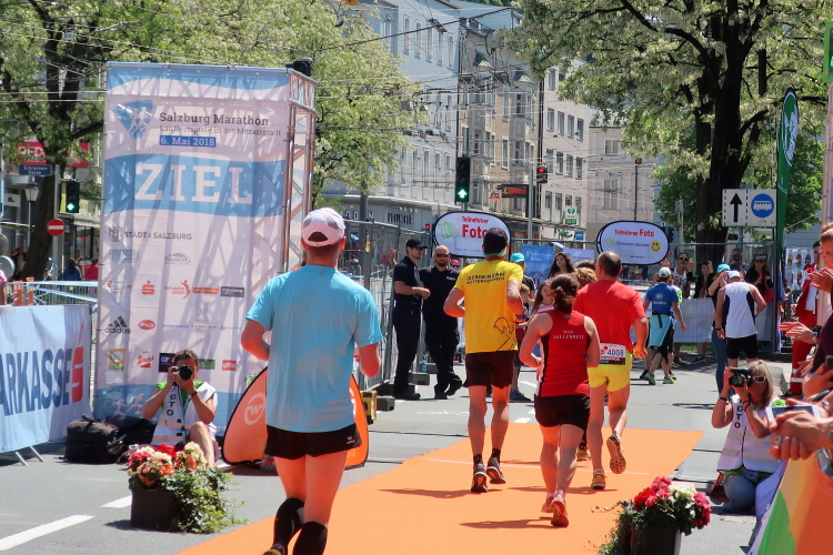 Auch wenn es nicht mehr ganz so viele Zuschauer wie nach der ersten Runde sind: Zurück am Mirabellplatz erwartet auch die Marathonläufer ein großartiger Empfang. Über einen roten Teppich, begleitet von Musik und über Lautsprecher begrüßt, durchlaufen wir den Zielbogen.