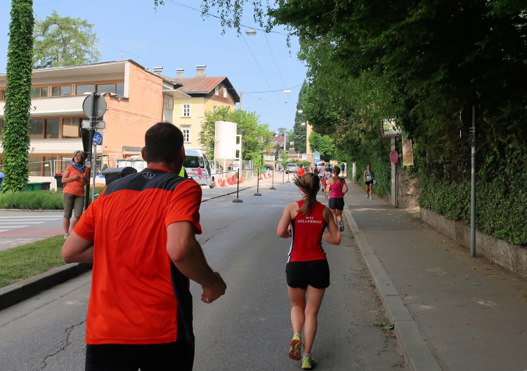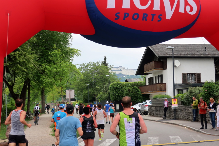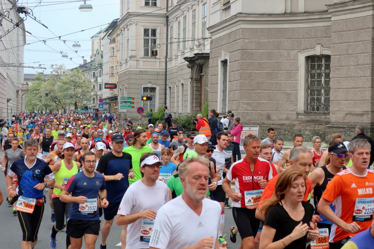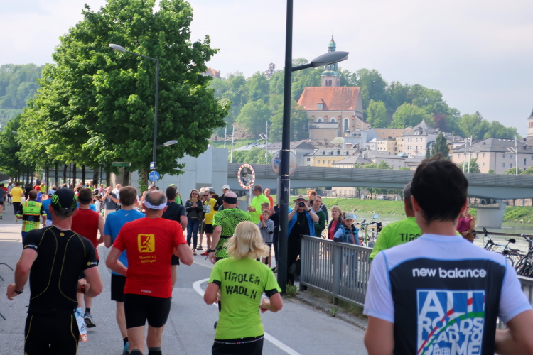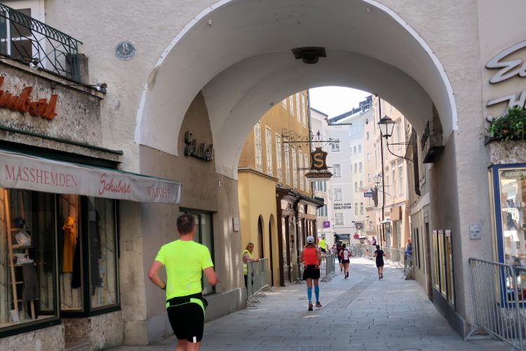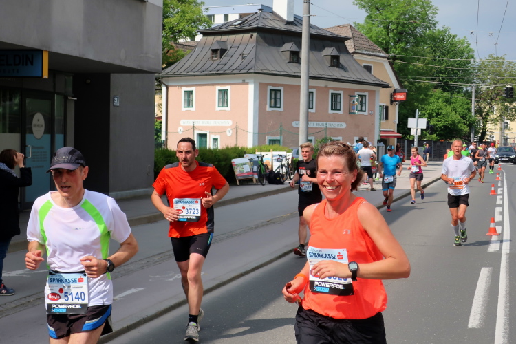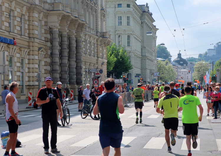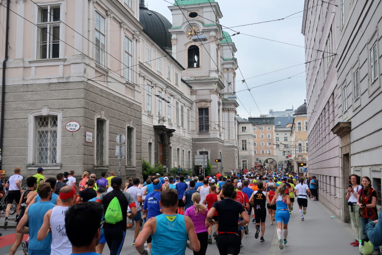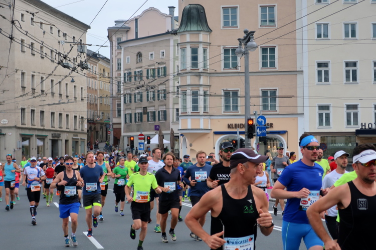 Es ist kurz vor neun. Der Startmoderator heizt die Stimmung an, Hands Up heißt es. Und schon ertönt der Startschuss. Gen Süden über die Rainerstraße setzt sich der Tross in Bewegung. Einen kleinen Stau gibt es, als sich die Dreifaltigkeitsgasse doch als ein wenig zu eng für den anstürmenden Läuferstrom erweist. Dafür ist ab dem Platzl und der sich anschließenden, die Salzach querenden Staatsbrücke kurz darauf umso mehr Luft und Raum.