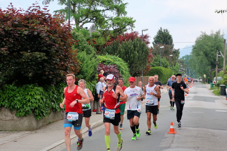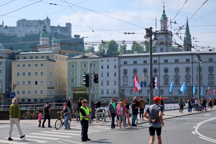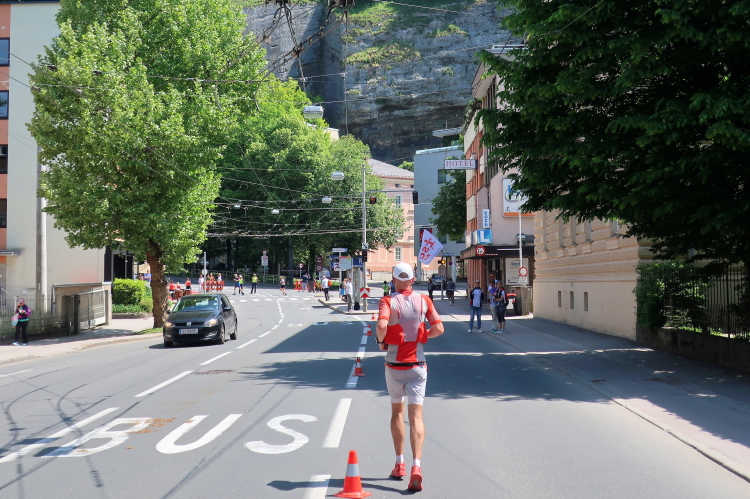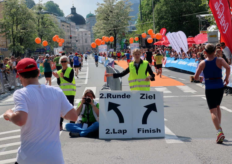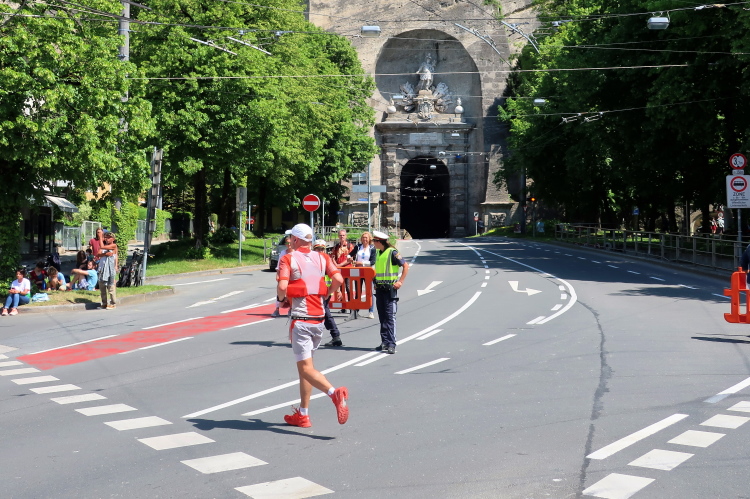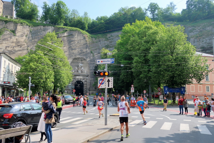 Hatte der Salzburg Marathon bislang weitgehend den Charakter eines Naturlaufs, so ist am Südende des Leopoldskroner Weihers damit Schluss. Was nicht heißt, dass wir ab sofort mitten ins Stadtgeschehen treten. Vielmehr lernen wir nun erst einmal die südwestlichen Vororte Salzburgs kennen. Des Öfteren wechselt die Streckenrichtung und ich verliere, auch mangels markanter Anhaltspunkte, auf den nächsten Kilometern jegliche Orientierung. Dank Absperrungen, Streckenposten und Polizei werden wir aber immer auf dem rechten Pfad gehalten. Ab und an müssen wir uns mit einer Straßenhälfte begnügen, während die andere dem regulären Verkehr vorbehalten ist, auch müssen wir bisweilen eine befahrene Straße queren. Aber das ist alles kein Problem: Wir haben stets Vorfahrt und so müssen alle anderen warten, was an manchen Stellen zum völligen Verkehrsstillstand führt.