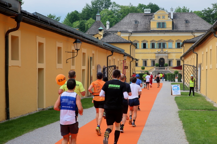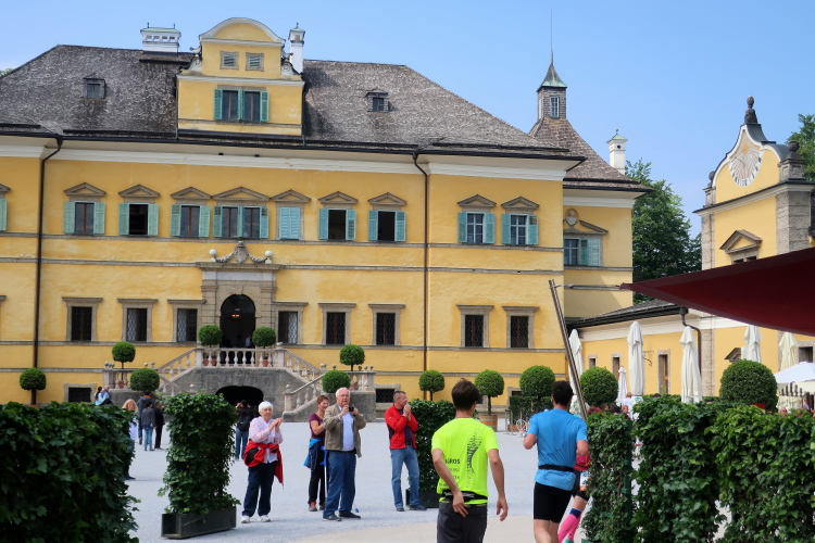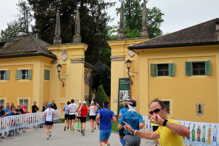 Den Höhepunkt und das vorläufige Finale des Schlösserparcours bildet das Schloss Hellbrunn bei km 6. Berühmt ist das 1615 unter Erzbischof Markus Sittikus nach italienischem Vorbild erbaute Landschloss vor allem durch seinen aufwändig angelegten Park und seine Gärten mit fantasievollen Wasserspielen, skulpturenreichen Grotten, und Naturtheatern. Ein Teil des Parks beherbergt den Salzburger Zoo. Auch wenn wir von den gartenarchitektonischen Highlights allenfalls am Rande etwas mit bekommen: Der Einzug in das Schlossgelände ist ein absolutes Highlight der Laufstrecke. Durch ein prunkvolles Eingangstor gelangen wir über die langgezogene, mit einem orangeroten Teppich ausgelegte Schlossauffahrt direkt hin zum gelb strahlenden Ensemble der Schlossgebäude. Viel zu schnell queren wir den idyllischen Schlosshof und verlassen diesen wieder über einen Seitenausgang.