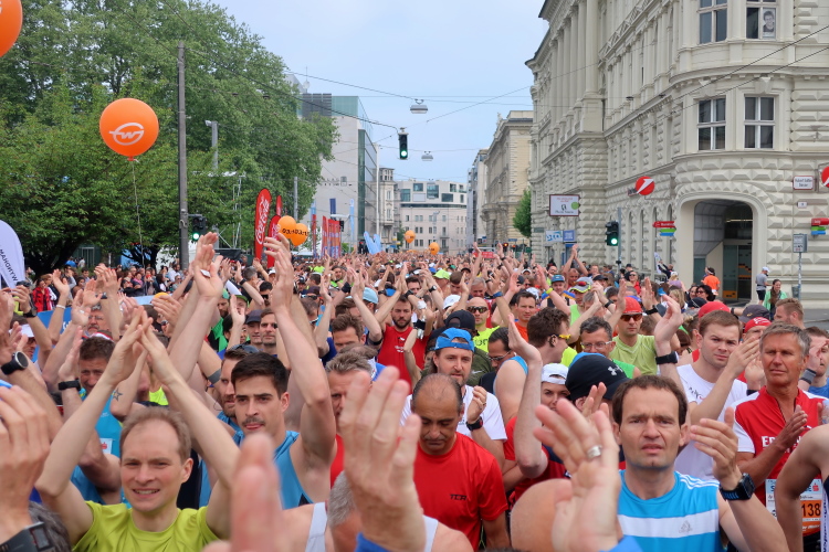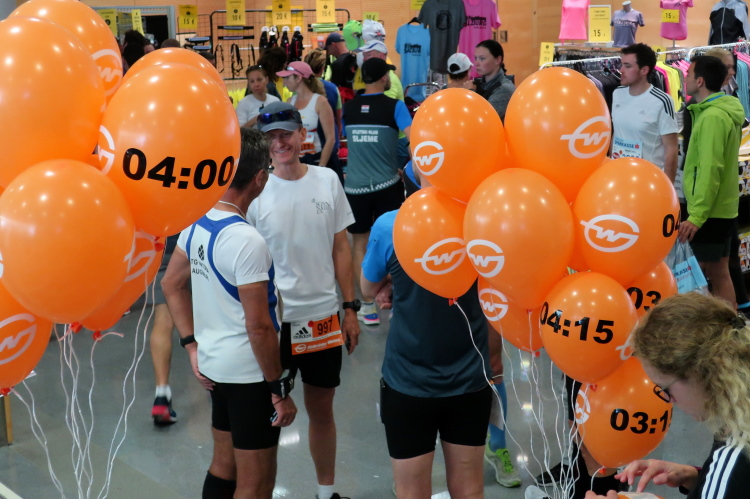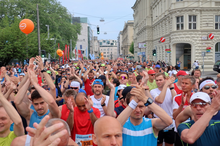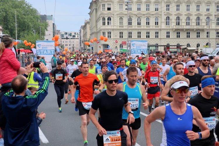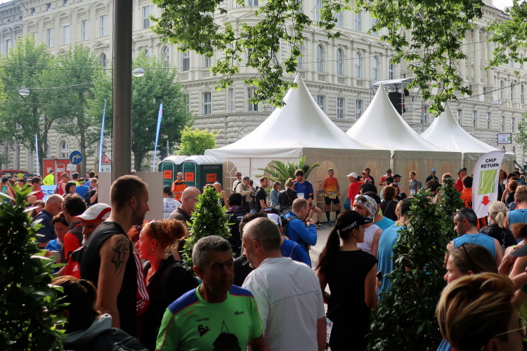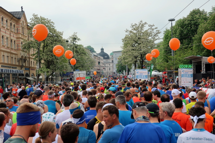 Aus allen Himmelsrichtungen strömen die Läufer am Sonntagmorgen durch die noch ruhigen Straßen und Gassen, alle demselben Ziel entgegen: dem Mirabellplatz. Hier und im Kurgarten nebenan pulsiert das Leben, Musik tönt aus Lautsprechern. Die Stimmung ist relaxt: keine Hektik, kein Gedränge – außer vor den WC-Häuschen. Ein kleiner Ratsch hier, gute Wünsche dort. So mancher läuft sich im Schlossgarten Mirabell ein oder sucht dort einfach nur Ruhe und innere Sammlung. Erst in den letzten zwanzig Minuten vor dem Start füllt sich der eingezäunte Startkorridor. Marathon- und Halbmarathonläufer starten hier gemeinsam, unterscheidbar nur durch die Startnummerngestaltung. Der Zugang zu den zielzeitabhängigen Startblöcken wird nicht kontrolliert. Doch mit einer Zeitstrafe von drei Minuten wird „bestraft“, wer sich in einen zu schnellen Block einreiht. Ich bin gespannt, ob das auch bei anderen Veranstaltungen Schule machen wird.