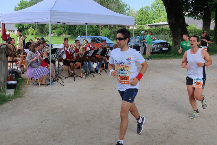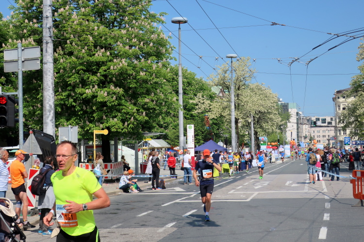 Erneut geht es via Dreifaltigkeitsgasse und Platzl auf die Staatsbrücke. Wie anders ist jetzt die Atmosphäre, was aber auch daran liegt, dass der Hochnebel gewichen ist und sich die Sonne durchgekämpft hat. Das lässt auf der zweiten Streckenhälfte ein schöneres Landschaftsbild, aber auch deutlich mehr Schweißperlen erwarten. Die Dudelsackbläser auf der anderen Brückenseite blasen für uns quasi das Halali, bevor wir uns dem Gefühl der Einsamkeit des Langstreckenläufers auf den vor uns liegenden langen Geraden hingeben dürfen.