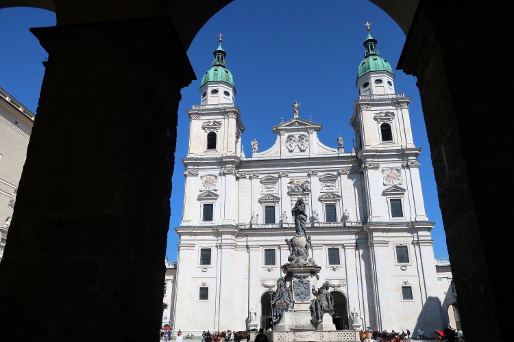 Vom Platzl und der Staatsbrücke aus dürfen wir am jenseitigen Ufer sogleich das ohne Zweifel schönste Altstadtpanorama entlang der Strecke genießen. Ein wahres Postkartenmotiv bilden die geschlossene Kette der Uferfassaden, die vielen daraus empor ragenden Türme und Kuppeln der Kirchen sowie der jäh dahinter ansteigende Festungsberg mit der Burg und dem sich daran anschließenden Mönchsberg. Es waren vor allem die italophilen Fürst-Erzbischöfe des 17. Jahrhunderts, die durch ihre baulichen Aktivitäten der Altstadt und deren zentralen Plätzen ihren barocken Stempel aufdrückten. Die seinerzeit beauftragten italienischen Baumeister schufen zahlreiche Kirchen und „Palazzi“, die der Stadt auch heute noch einen Flair verleihen, wie man ihn eigentlich nur jenseits der Alpen vermuten würde. Schade ist, dass wir auf unserem Laufkurs nicht ein wenig mehr Altstadtluft schnuppern dürfen.