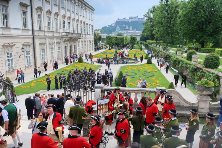 Der erste Gang führt ins Salzburg Congress gleich hinter dem Schloss. Mit seinen lichten Glasfassaden und klaren Linien steht das Kongresszentrum in deutlichem optischen Kontrast zum benachbarten Schloss. Startnummer und Startersackerl bekomme ich dort im Rahmen der „SportMall“. Schnell und unkompliziert läuft alles ab. Draußen, im Kurgarten zwischen Congress und Schloss, ist es allerdings deutlich lauschiger, vor allem dort, wo die Gastrozelte des „Bio Dorfs“ und mobilen Schänken zum Verweilen im Schatten der Bäume locken. Im Mirabellgarten nebenan geht es einstweilen hoch her: Trachtenblaskapellen aus der Region sammeln und formieren sich, um dann mit großem Tamtam und Täterätä gen Domplatz zu ziehen.