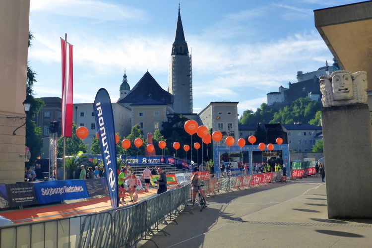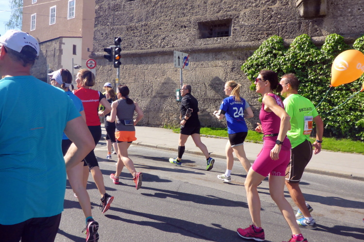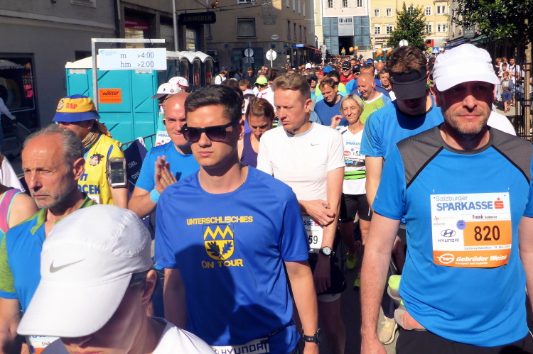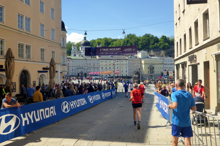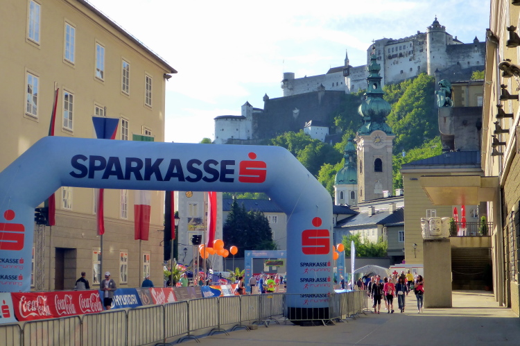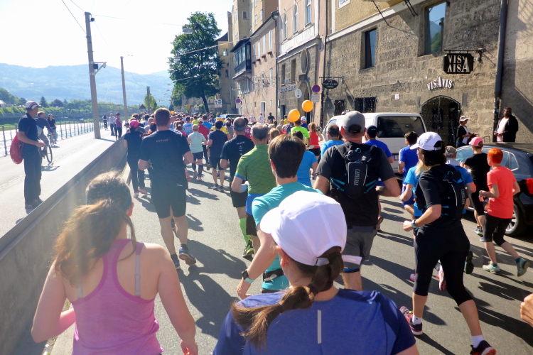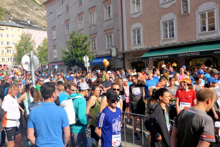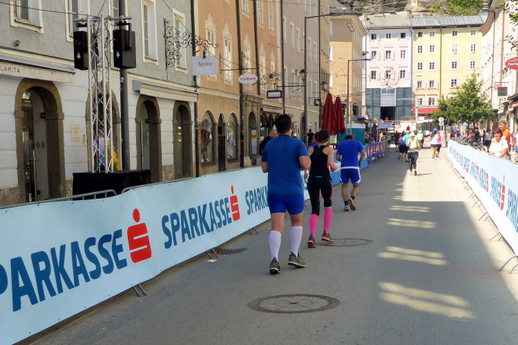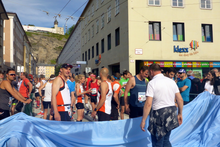 Nach einem guten Sonntagsfrühstück im Hotel freue mich auf den Lauf durch Salzburg. Am Himmel ist keine Wolke zu sehen und es ist bereits angenehm warm. Die drei Kilometer bis zum Startbereich am Ferdinand-Hanusch-Platz erledige ich zu Fuß und kann mich dabei schon mal einlaufen. Es ist noch Zeit für einen Bummel durch die berühmte Getreidegasse. So entspannt wie jetzt um diese Zeit kann man das sonst nie. Besonders gefallen mir immer wieder die vielen schmiedeeisernen Firmenschilder, die teilweise mehrere hundert Jahre alt sind.