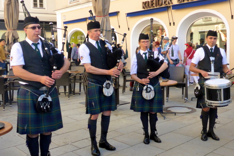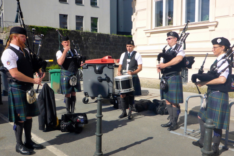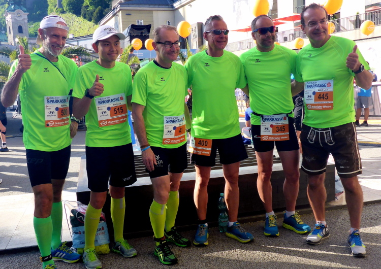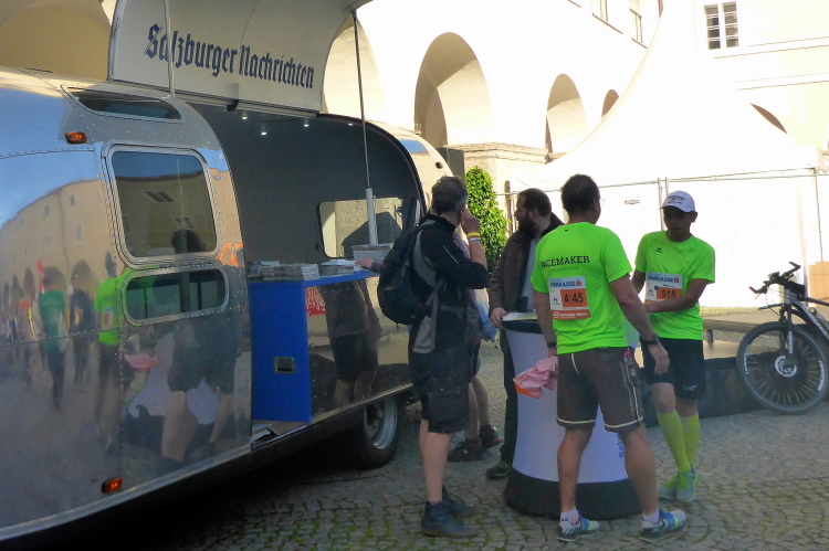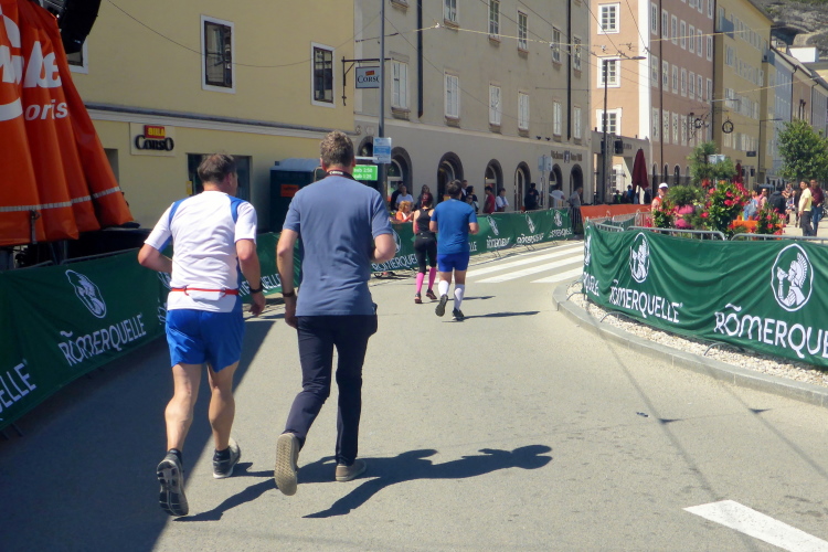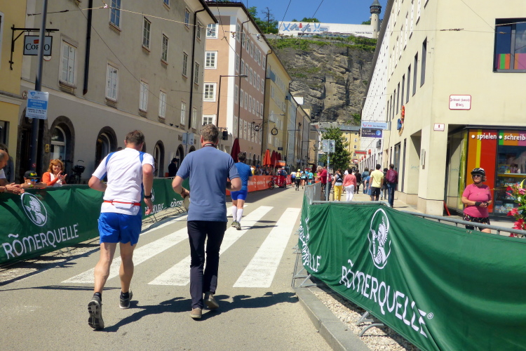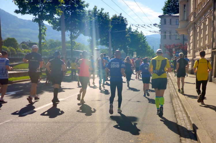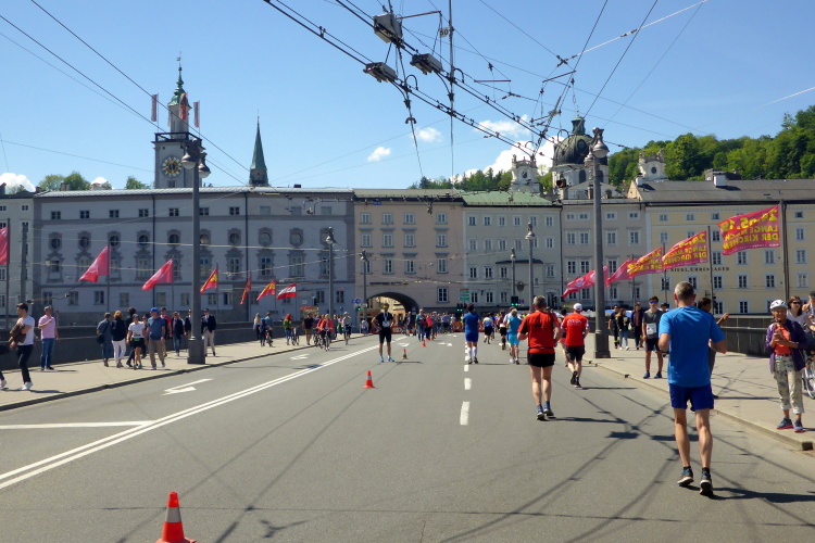 Nach einem guten Sonntagsfrühstück im Hotel freue mich auf den Lauf durch Salzburg. Am Himmel ist keine Wolke zu sehen und es ist bereits angenehm warm. Die drei Kilometer bis zum Startbereich am Ferdinand-Hanusch-Platz erledige ich zu Fuß und kann mich dabei schon mal einlaufen. Es ist noch Zeit für einen Bummel durch die berühmte Getreidegasse. So entspannt wie jetzt um diese Zeit kann man das sonst nie. Besonders gefallen mir immer wieder die vielen schmiedeeisernen Firmenschilder, die teilweise mehrere hundert Jahre alt sind.