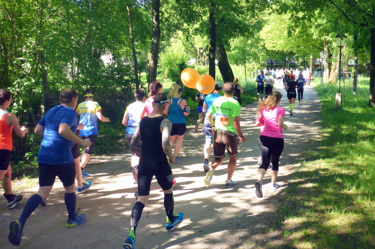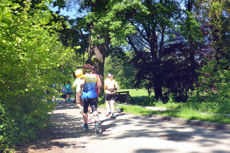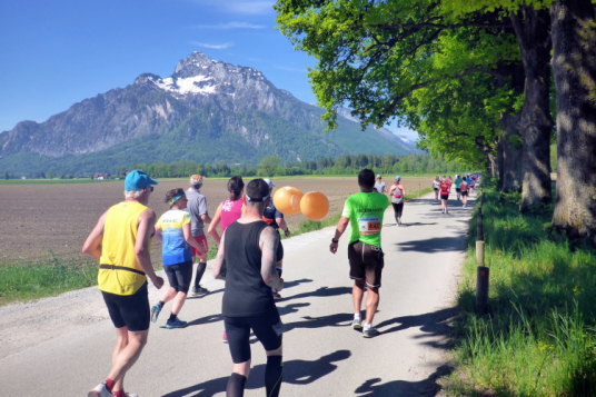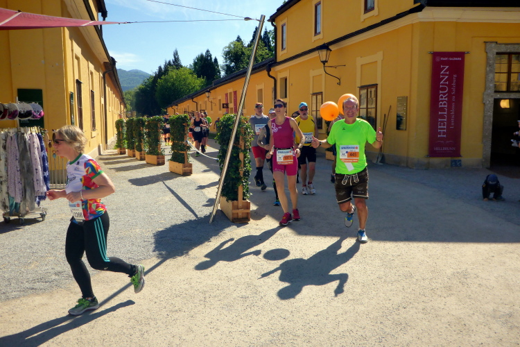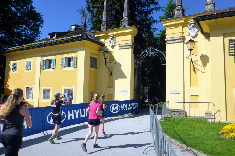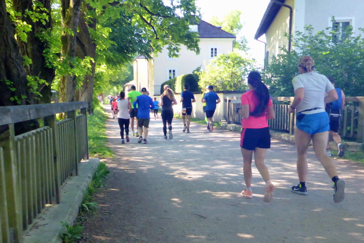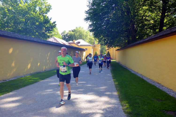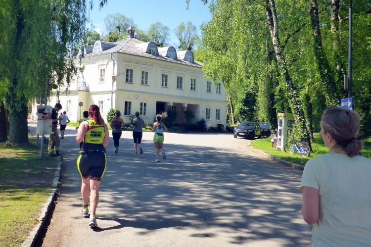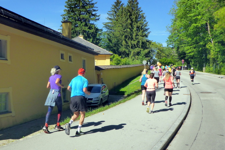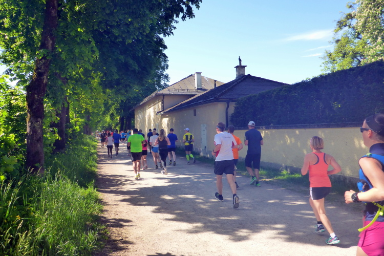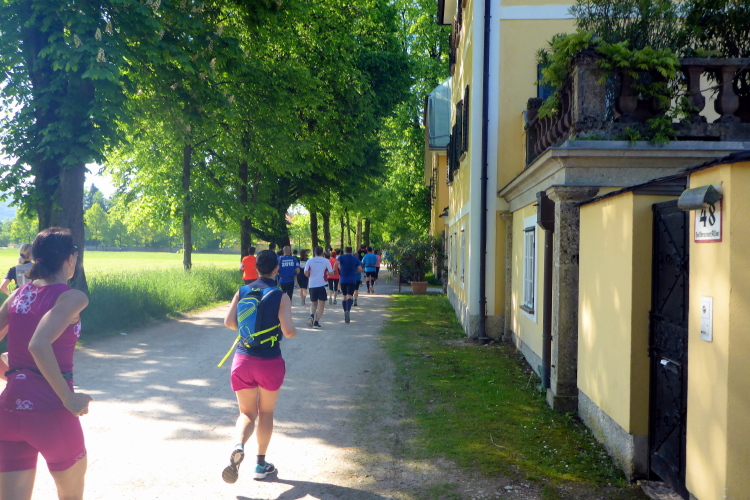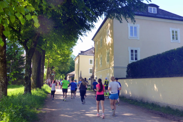 Die Hellbrunner Allee wurde Anfang des 17. Jahrhunderts durch Fürsterzbischof Markus Sittikus von Hohenems angelegt und ist heute die älteste erhaltene herrschaftliche Allee Mitteleuropas. Dank des herrlichen Wetters haben wir einen wunderschönen Blick auf die teils noch (oder schon wieder) schneebedeckten Salzburger Berge. Wir passieren imposante Herrensitze, wie Schloss Fronburg und Schloss Emsburg. Jürgen und ich sind schon jetzt begeistert, obwohl der Marathon noch gar nicht richtig begonnen hat.