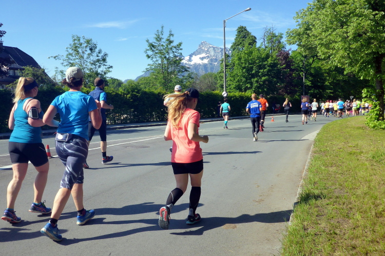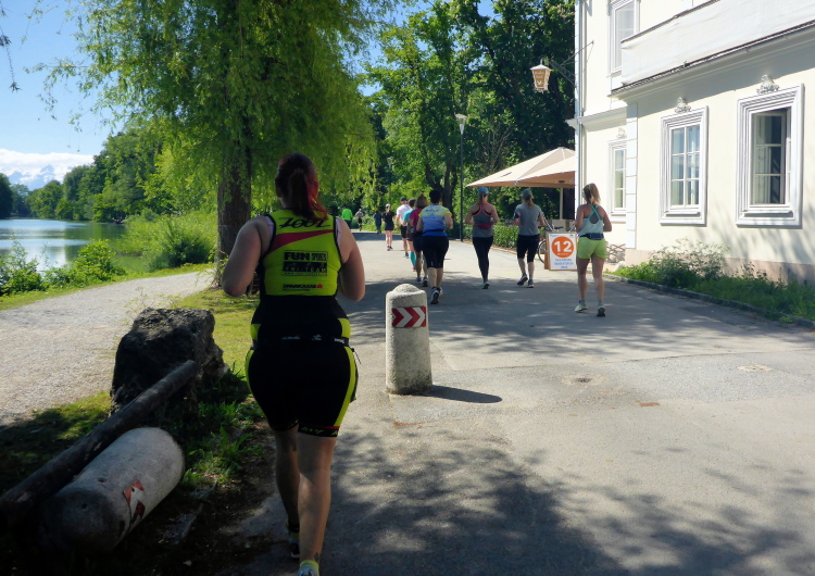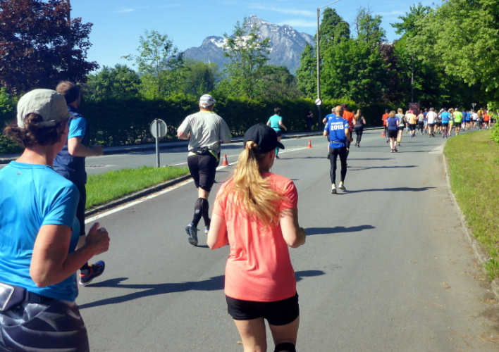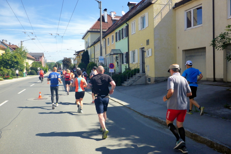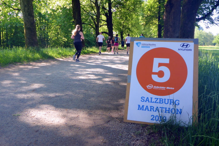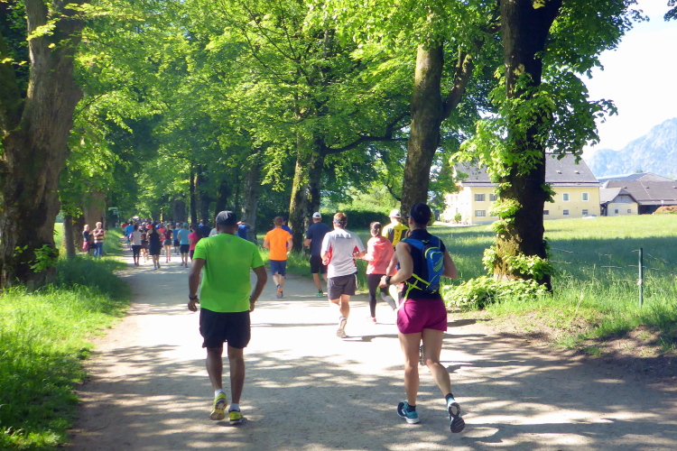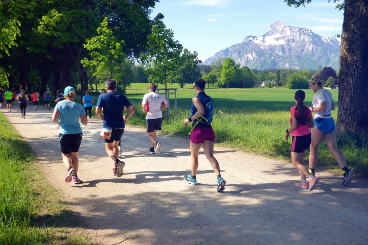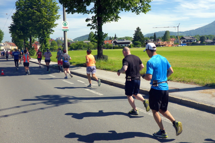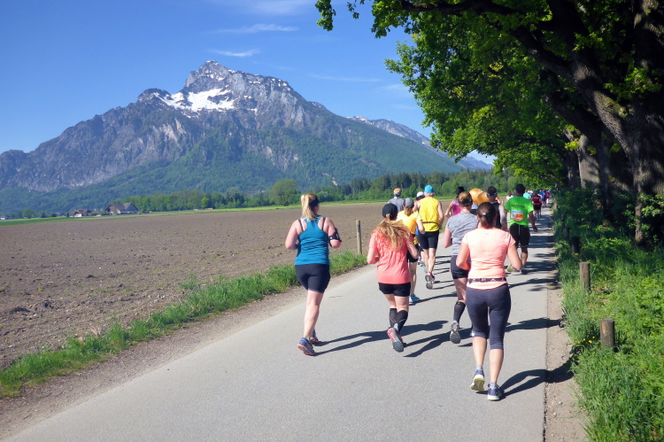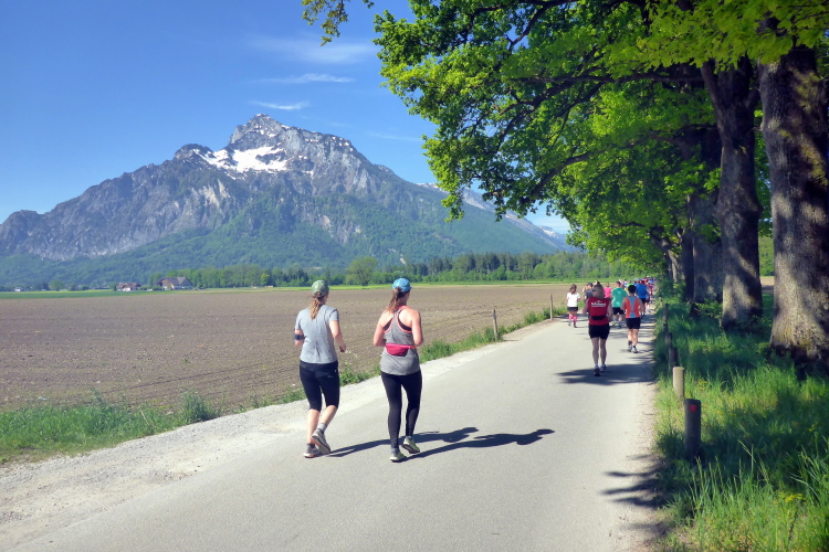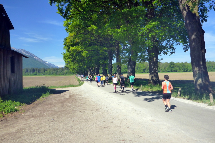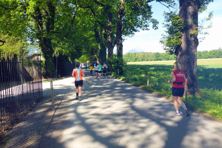 Ehe wir uns versehen, haben wir das Schloss auch schon wieder hinter uns gelassen und laufen kurze Zeit später auf der Keltenallee in Richtung Osten. Vor uns liegt wieder ein traumhaftes Bergpanorama mit dem 1972 m hohen Untersberg. Für ein paar Kilometer wird aus dem Salzburg Marathon ein herrlicher Landschaftslauf. Die Temperaturen haben inzwischen sicherlich schon die zwanzig Gradmarke geknackt und ich freue mich über den Schatten der Bäume. Es ist abzusehen, dass es heute kein einfacher Lauf werden wird, vor allem nicht für die Marathonläufer/innen.