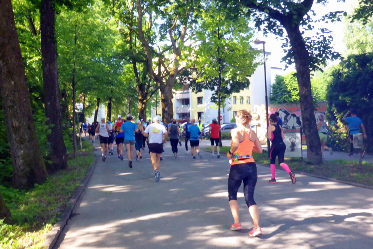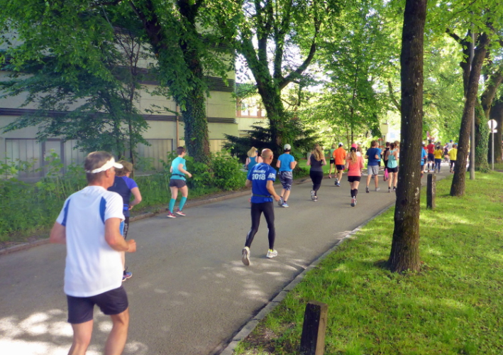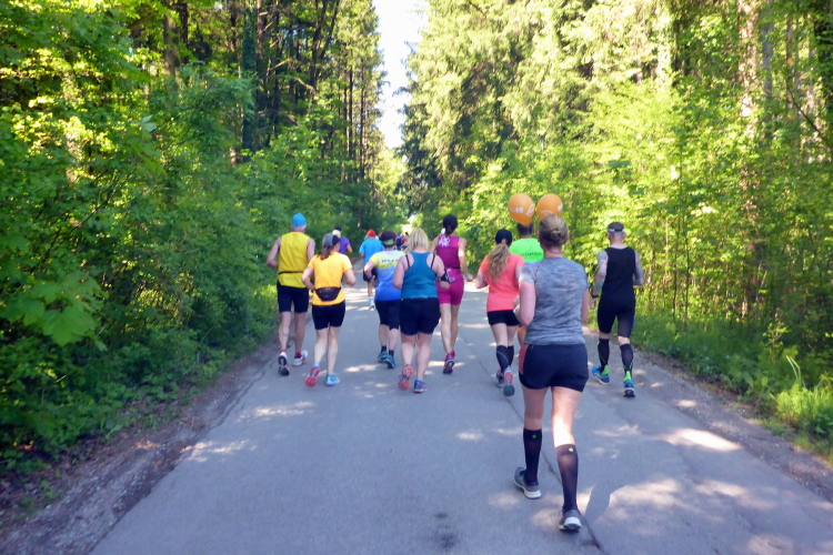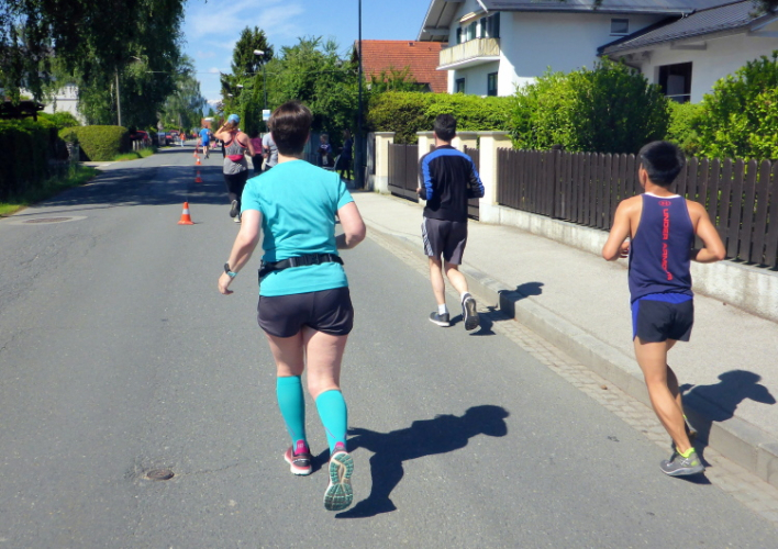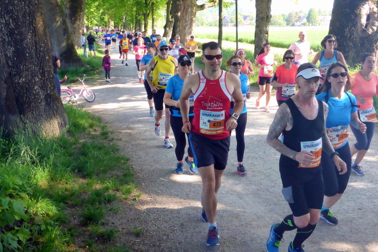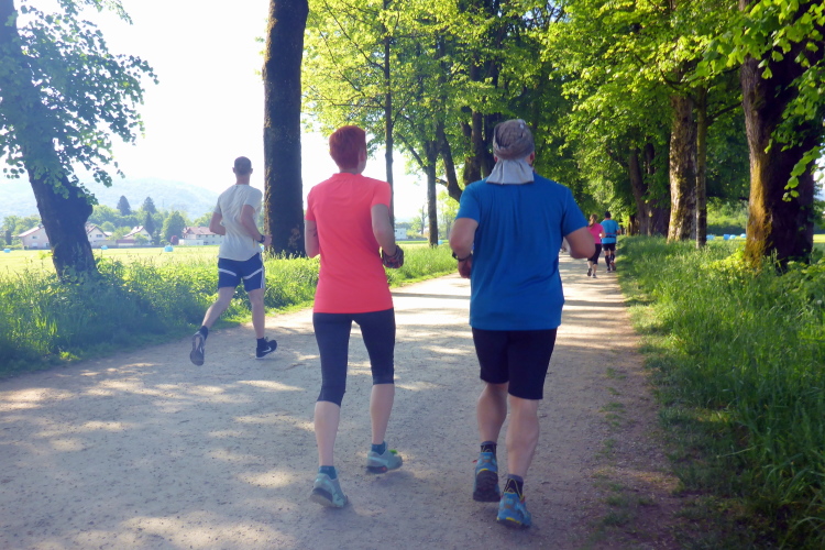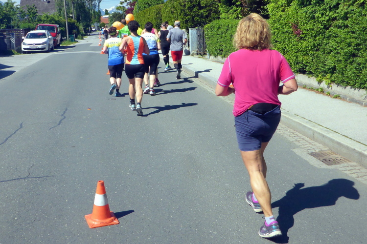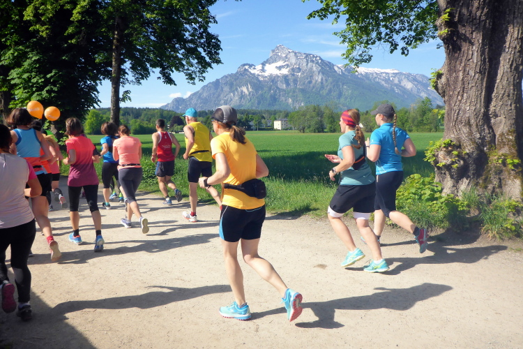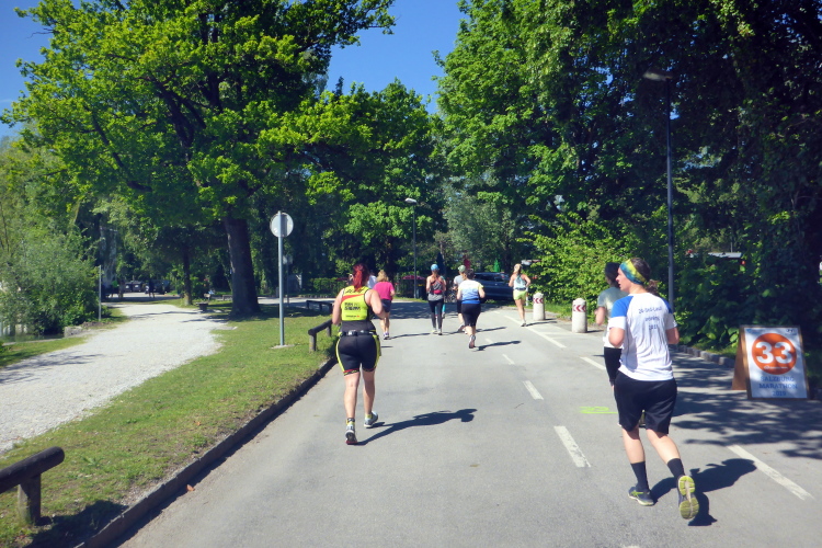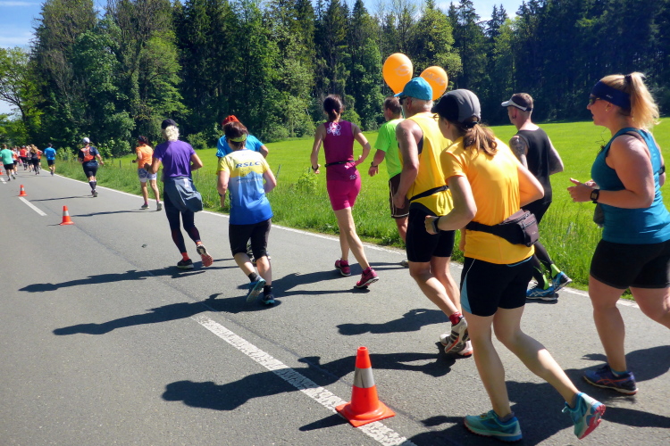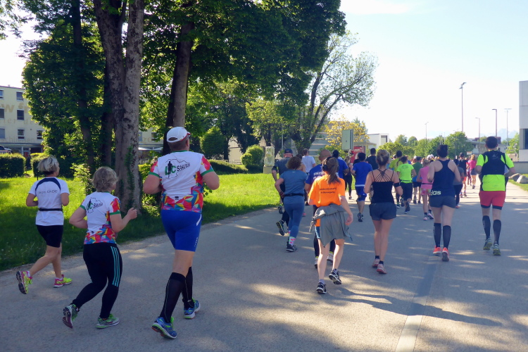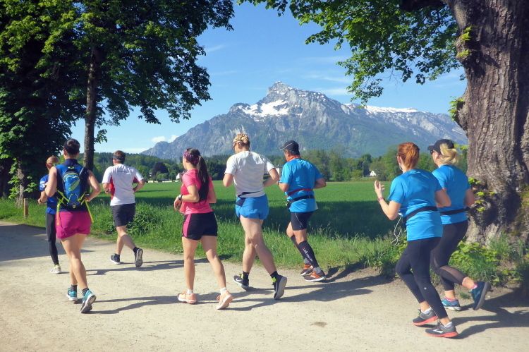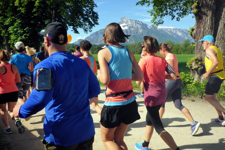 Ehe wir uns versehen, haben wir das Schloss auch schon wieder hinter uns gelassen und laufen kurze Zeit später auf der Keltenallee in Richtung Osten. Vor uns liegt wieder ein traumhaftes Bergpanorama mit dem 1972 m hohen Untersberg. Für ein paar Kilometer wird aus dem Salzburg Marathon ein herrlicher Landschaftslauf. Die Temperaturen haben inzwischen sicherlich schon die zwanzig Gradmarke geknackt und ich freue mich über den Schatten der Bäume. Es ist abzusehen, dass es heute kein einfacher Lauf werden wird, vor allem nicht für die Marathonläufer/innen.