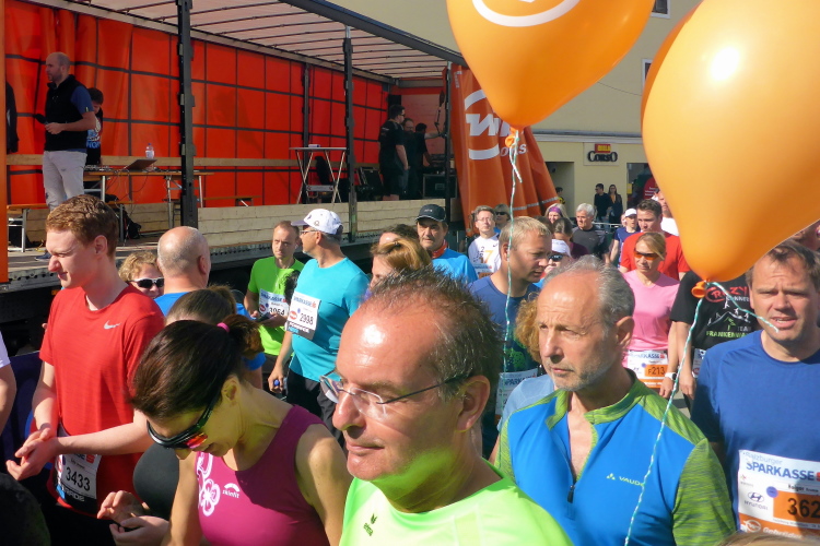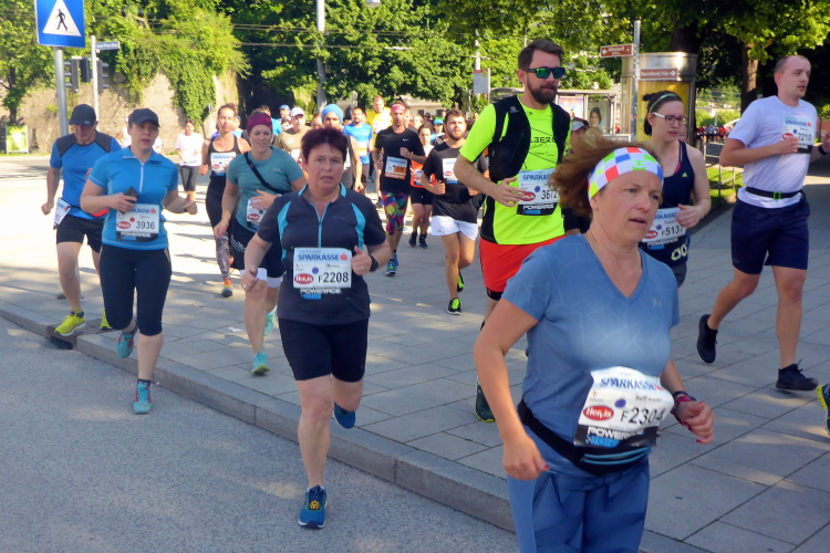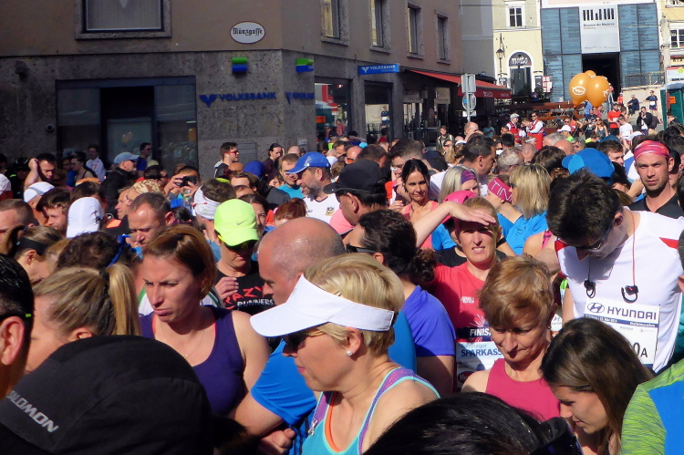 Rechtzeitig machen wir uns auf den Weg in die Griesgasse, wo die Startaufstellung ist. Wir sortieren uns in den blauen Startblock ein, der für Finisher mit einer Zielzeit von über vier bzw. zwei Stunden vorgesehen ist, also ziemlich am Ende des Feldes. Pünktlich um 9:00 Uhr erfolgt schließlich der Start für die Elite und des zweiten Blocks. Bis ich über die Startlinie laufe, vergehen gut 10 Minuten.