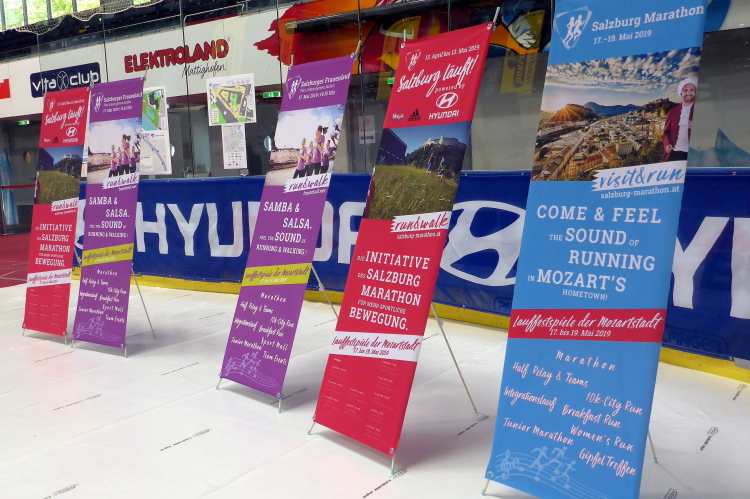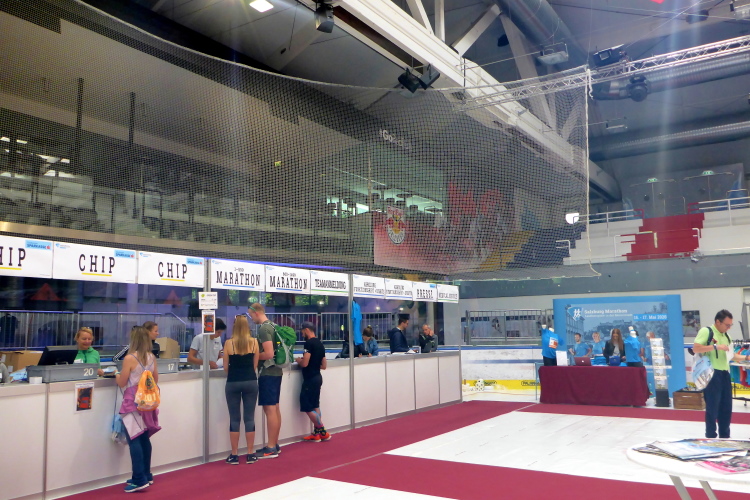 Am Samstagnachmittag führt uns der Weg von der Altstadt auch zum Volksgarten im Ortsteil Parsch hinaus. Dort befindet sich die Eis-Arena, das Zuhause von Red Bull Salzburg, die schon mehrfach österreichischer Eishockeymeister wurden. Da die Saison bereits beendet ist, wird die Halle erstmals für die Marathon-Messe, sowie für die Startnummernausgabe genutzt. Der Umzug in die geräumige Eis-Arena kommt zum rechten Zeitpunkt, denn in diesem Jahr müssen so viele Startnummern wie noch nie ausgegeben werden. Rund 8.500 Teilnehmer haben sich für die verschiedenen Wettbewerbe angemeldet. Neben dem neu ins Leben gerufenen Frauenlauf am Freitag über 5,5 Kilometer, gibt es am Samstag auch noch den Integrationslauf, einen Junior-Marathon und einen Frühstückslauf. Der 10 Kilometerlauf wird am Sonntag um 08:45 Uhr gestartet, Marathon und Halbmarathon eine viertel Stunde später. Alleine für den Marathon sind 1.014 Läuferinnen und Läufer gemeldet. Auf den Halbmarathon entfallen mit 2.537 Teilnehmern erwartungsgemäß die meisten Meldungen.