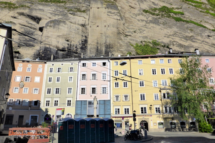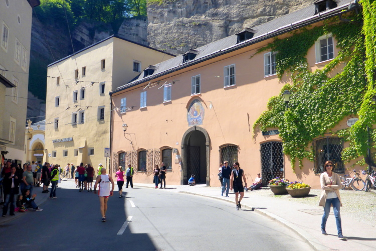 Gleich im Anschluss laufen wir am Großen Festspielhaus vorbei. Eigentlich hat Salzburg zwei Festspielhäuser, das Kleine Festspielhaus wurde aber nach einem Umbau zum „Haus für Mozart“, weshalb sich heute der Begriff Festspielhaus nur noch auf das Große Festspielhaus bezieht. Mit einem Ausmaß von 100 Metern Breite gehört es heute zu den größten Konzertsälen der Welt. Es wurde im Juli 1960 mit Richard Strauss` „Rosenkavalier“ unter der Leitung von Herbert von Karajan feierlich eröffnet. Heute locken die Salzburger Festspiele jährlich nicht nur internationale Topstars, sondern auch gut eine viertel Million Besucher in die Stadt.