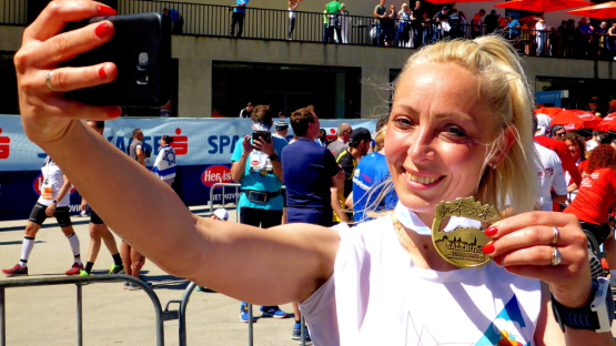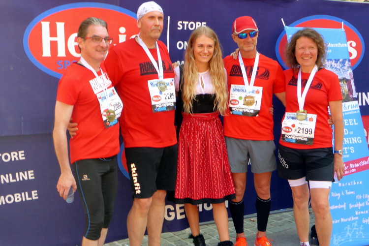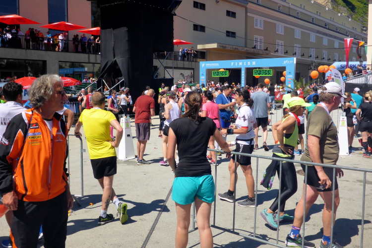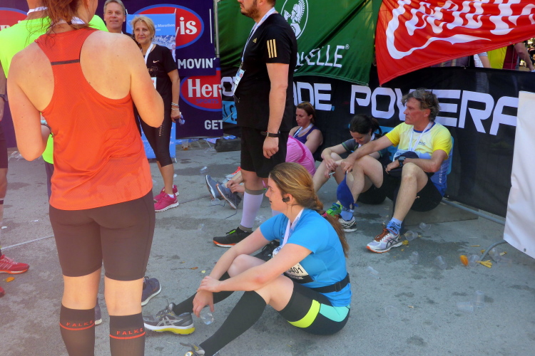 Ich nehme meine Medaille in Empfang und überhöre die Glückwünsche zu meiner Leistung heute einfach einmal. Der Zielbereich ist es rappelvoll. Nicht nur die Halbmarathonis laben sich am reichhaltigen Angebot, ich erkenne an den Startnummern auch einige Marathonis, die wegen der sommerlichen Temperaturen auf eine zweite Runde verzichten. Auch dem Marathonsieger Victor Kipchirchir wurde es auf der zweiten Hälfte zu heiß, er musste seinen Plan, neuen Streckenrekord zu laufen, aufgeben. Mit 2:17:02 Stunden blieb er etwas unter seinen Erwartungen.