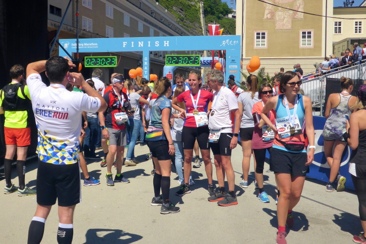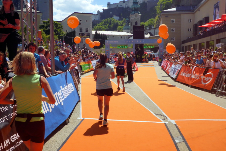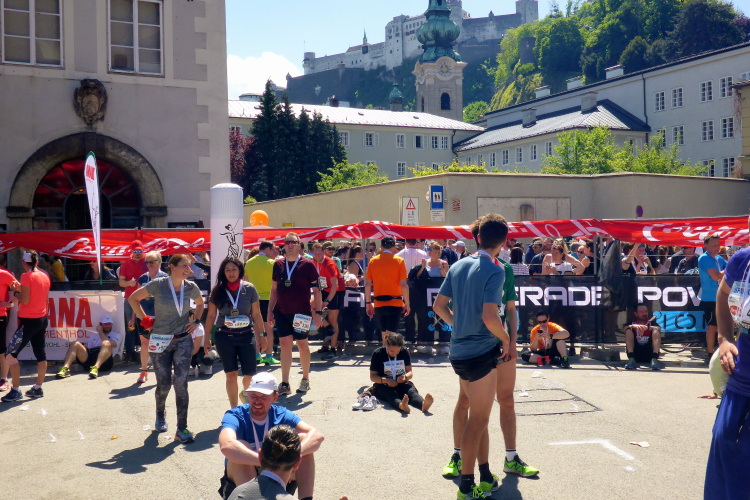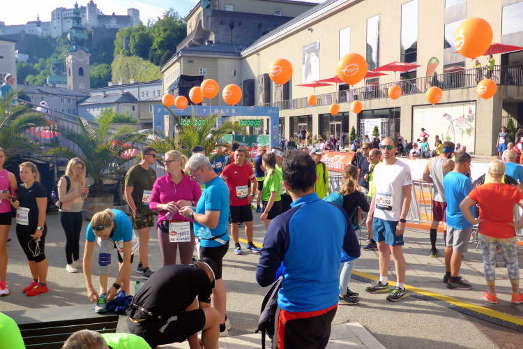 Und damit liegt der Salzburg Marathon eigentlich auch schon wieder hinter mir. Für die Marathonis geht es in diesem Moment nach links auf die zweite Runde, ich laufe geradeaus ins Ziel in der Hofstallgasse vor dem Festspielhaus. Über einen blauen Teppich geht es durch den Zielbogen. Die Kulisse mit der alten Universität, dem Ritzerbogen und der Kollegienkirche, überragt von der Festung Hohensalzburg ist mehr als eindruchsvoll.