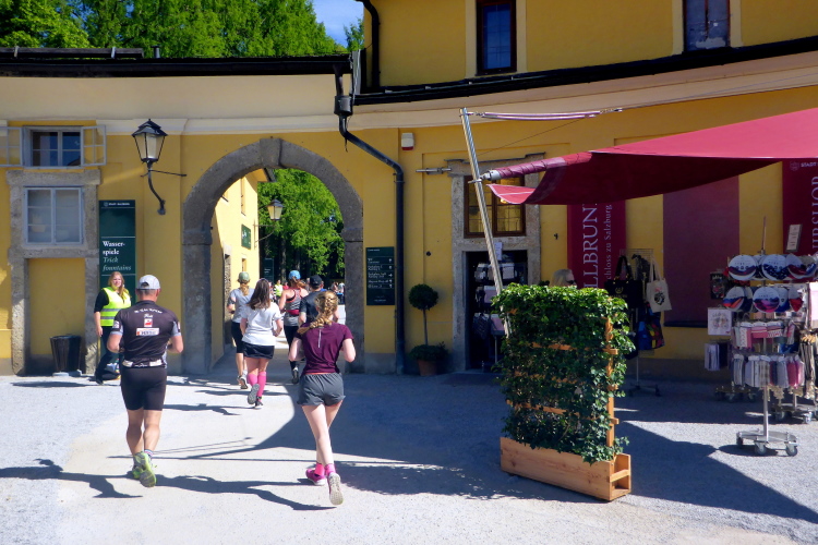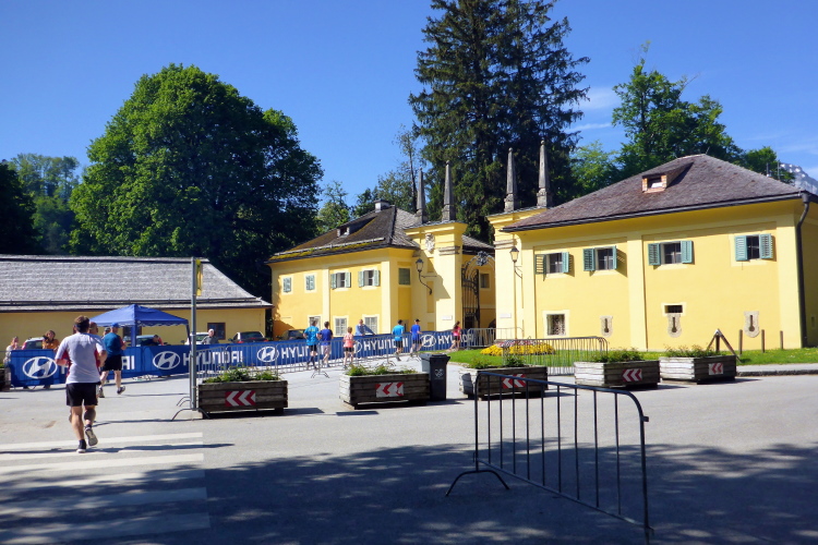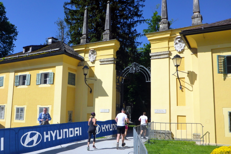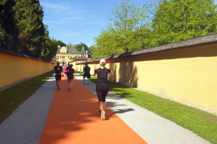 Höhepunkt ist am Ende der Allee das Schloss Hellbrunn selbst. Wir biegen nach rechts ab und laufen durch ein Tor auf einer langen Auffahrt direkt auf das Schloss zu. Der Kiesweg ist für den Marathon mit einem orangen Teppich (unsere Firmenfarbe!) ausgelegt und sorgt für ein ganz besonderes Feeling. Das Schloss selbst entstand in einer rekordverdächtigen Bauzeit von 1612 bis 1615. Baumeister Santino Solari, zu dessen Werken auch der Salzburger Dom gehört, schuf hier einen der prächtigsten Spätrenaissance-Bauten nördlich der Alpen. Das Lustschloss wurde für Fürsterzbischof Sittikus zu Vergnügungszwecken erbaut. Berühmt sind die Wasserspiele in den großzügigen Garten- und Parkanlagen. Auch der Salzburger Zoo ist heute auf dem Gelände der Hellbrunner Schlossanlage beheimatet.