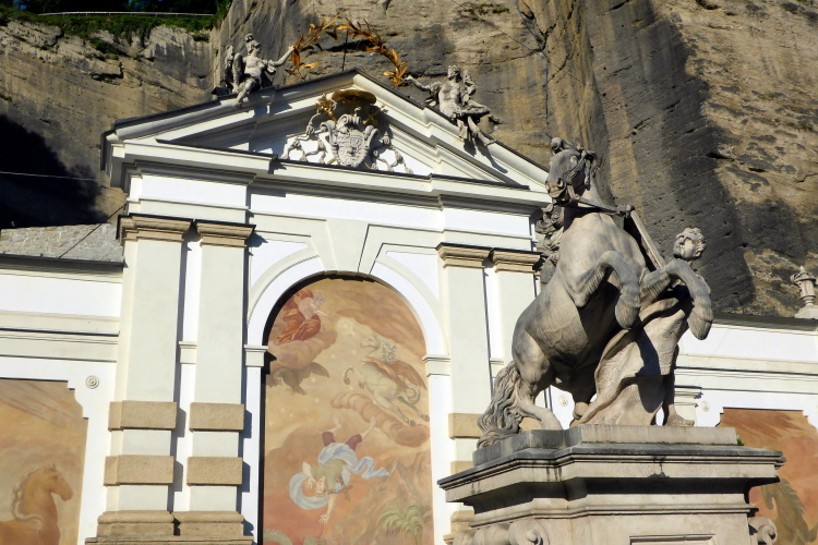 Wir schlängeln uns durch die Altstadt und schon bald kann ich den Salzburger Dom über den Dächern erkennen. Das Ziel ist also nicht mehr weit. Noch einmal überqueren wir die Salzach und finden uns am Ferdinand-Hanusch-Platz wieder, wo wir vor gut zwei Stunden losgelaufen sind. Durch die Griesgasse, die parallel zur Getreidegasse verläuft, erreichen wir kurz darauf die Pferdeschwemme vor dem Großen Festspielhaus Salzburg. In Salzburg gibt es heute noch zwei Pferdeschwemmen. Die bekannteste ist die am Festspielhaus, die dort auch nicht zufällig liegt. Das Gebäude des Festspielhauses beherbergte ursprünglich die Hofstallungen des Fürst Erzbischofs und die Pferdeschwemme erfüllte den einfachen Zweck, Pferde zu tränken und zu waschen. Im Zentrum der Schwemme wurde durch den Steinmetz Michael Mandl eine Statue errichtet, die als „Rossbändiger“ bezeichnet wird. Heute erfüllt die Pferdeschwemme keinen praktischen Zweck mehr, fügt sich aber noch immer gut ins barocke Bild der Stadt ein. Touristen fühlen sich beim Anblick der Pferdeschwemme offenbar oft an die Fontana di Trevi in Rom erinnert und werfen Münzen in den flachen Brunnen.