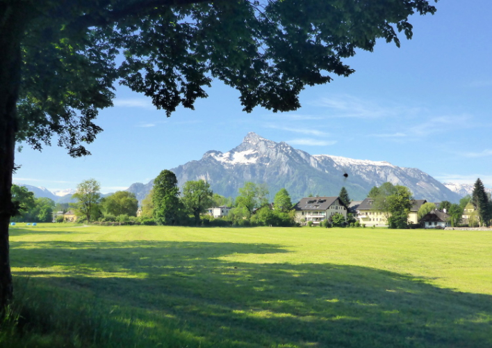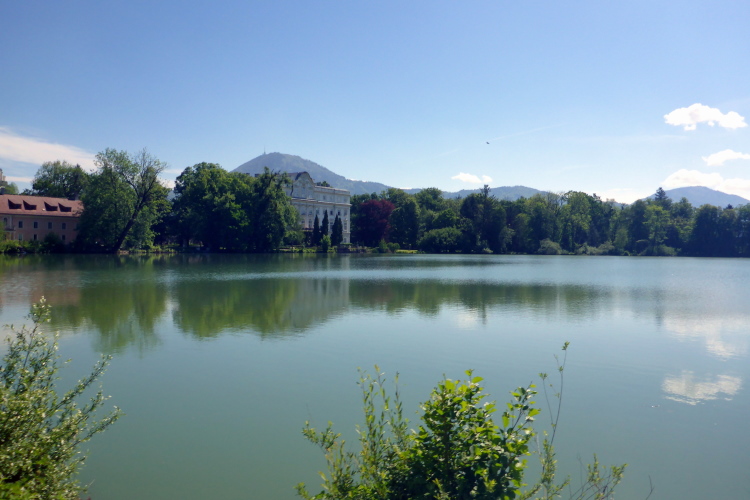 Wir nähern uns nun wieder der Stadt, von weitem kann ich schon die Festung Hohensalzburg erkennen. Wir laufen durch ein Wohnviertel und kommen zum Schloss Leopoldskron. Erst geht es aber noch ein paar hundert Meter an dem dazu gehörenden beschaulichen Weiher entlang, von dem aus man den schönsten Blick auf das Schloss hat. Sitzt man im Biergarten vom Weiherwirt, hat man Schloss und Festung auf einen Blick. Und gut essen kann man dort auch.