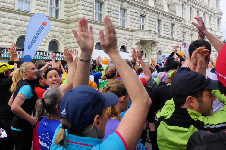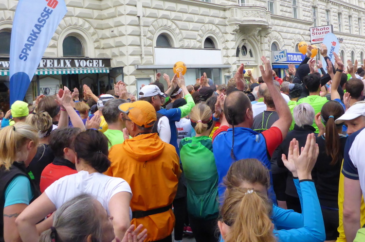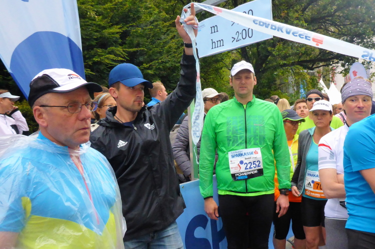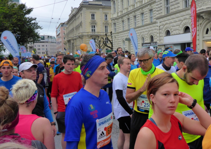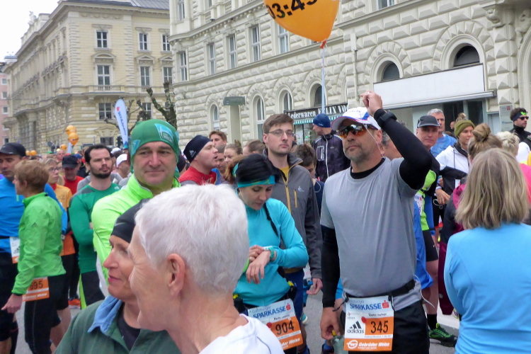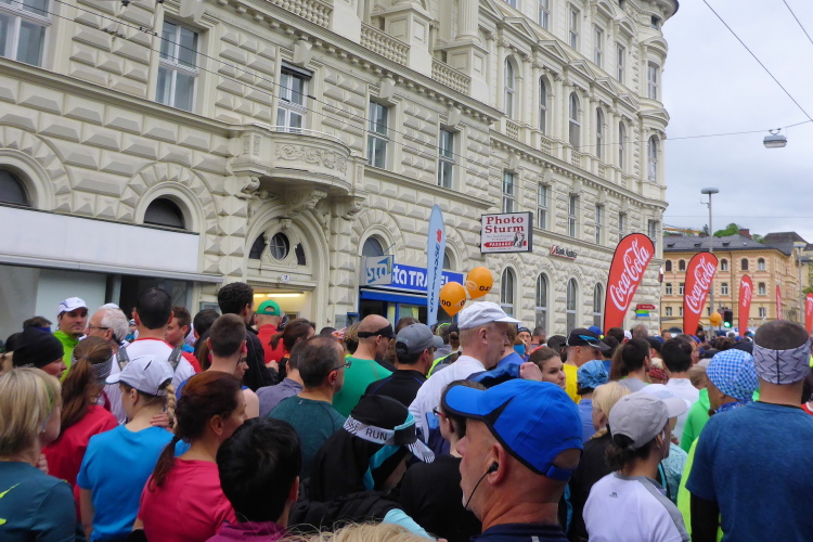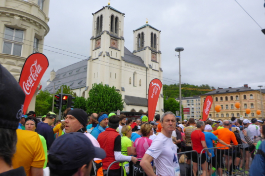 Obwohl wir das Gelände samstags eingehend inspiziert haben, sind Norbert und ich doch erstaunt, wie sich das Ambiente am nächsten Morgen verändert. Erst einmal ist das Wetter im Gegensatz zum frühlingshaften Samstag trüb und die Prognose verheißt Regen. Zum anderen ist der spielerischen Leichtigkeit einer spannungsgeladene Vorstart-Atmosphäre gewichen. Auf der gesperrten Rainerstraße sind Startblöcke abgeteilt und ein Moderator unterhält die Läufer und Zuschauer; laute Musik heizt zusätzlich ein. Die Startermatten befinden sich direkt vor der neugotischen Kirche St. Andrä. Die 61 m hohen Türme sind ein würdiger Starterbogen für die ca. 3.000 Halb- und Vollmarathon-Starter. Obwohl die Läufer angehalten sind, rechtzeitig ihre Startblöcke aufzusuchen, füllt sich die Straße nur zögerlich. Im Kongresszentrum können die Kleiderbeutel abgegeben werden und es ist angenehm warm, draußen ist es im Gegensatz dazu ungemütlich kalt.