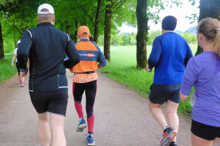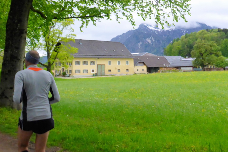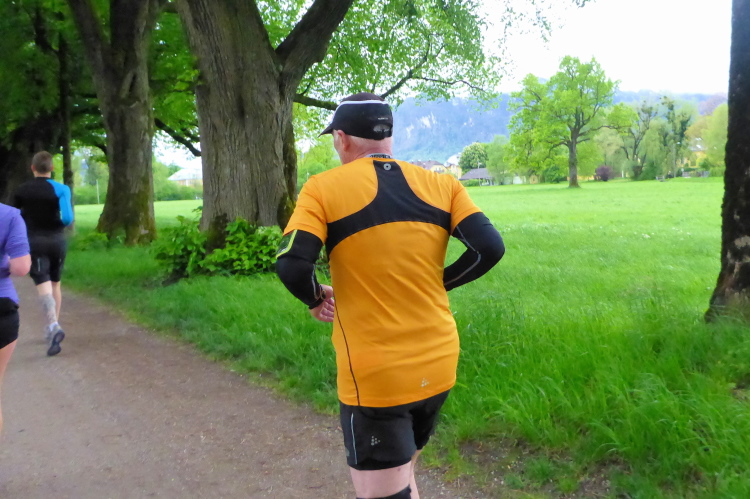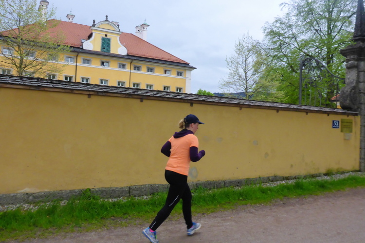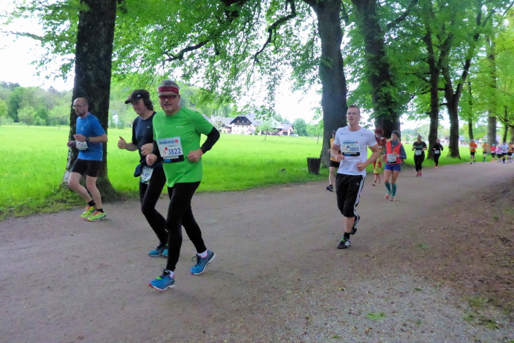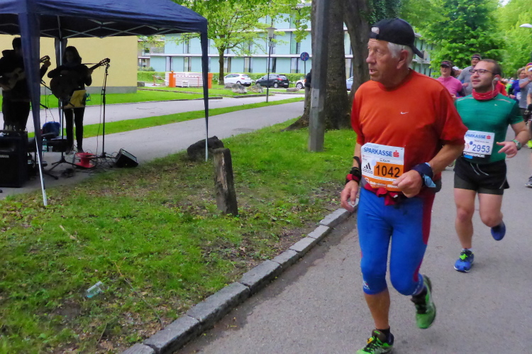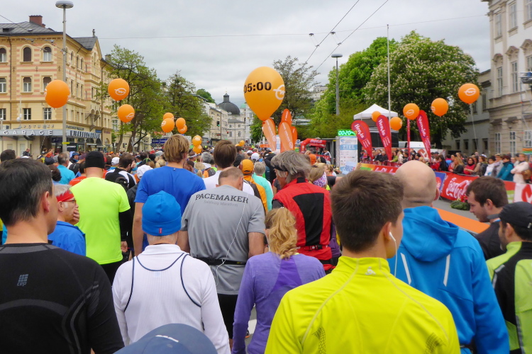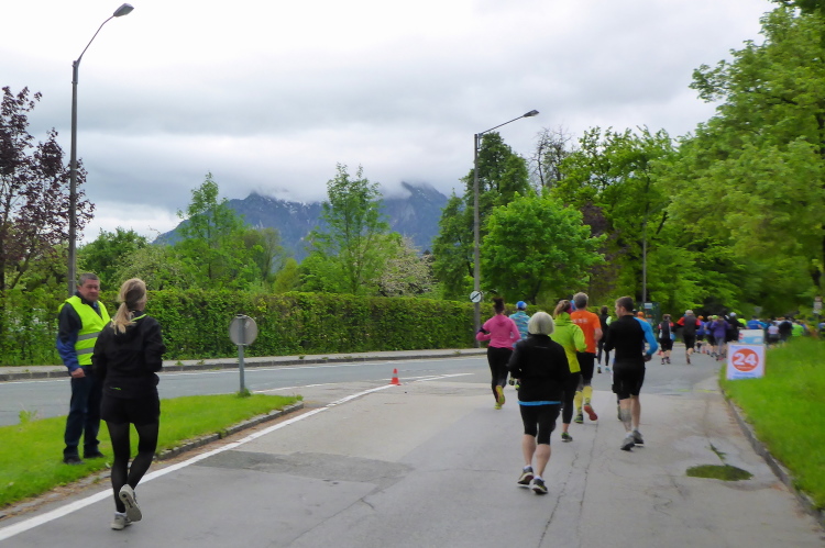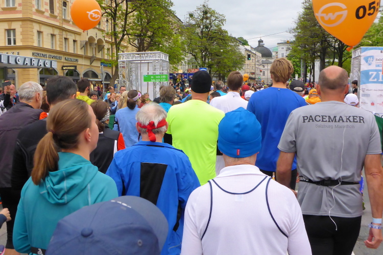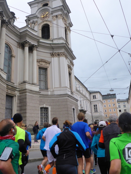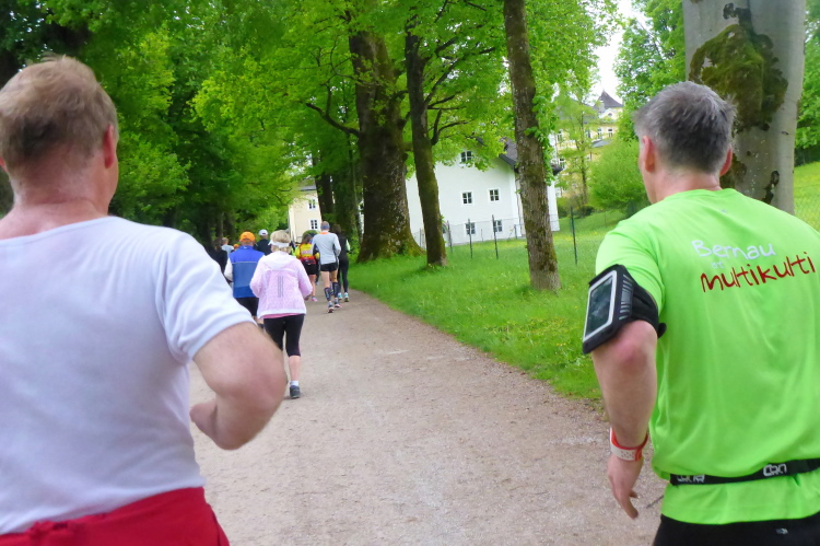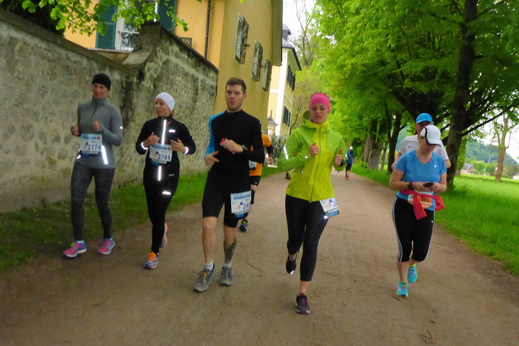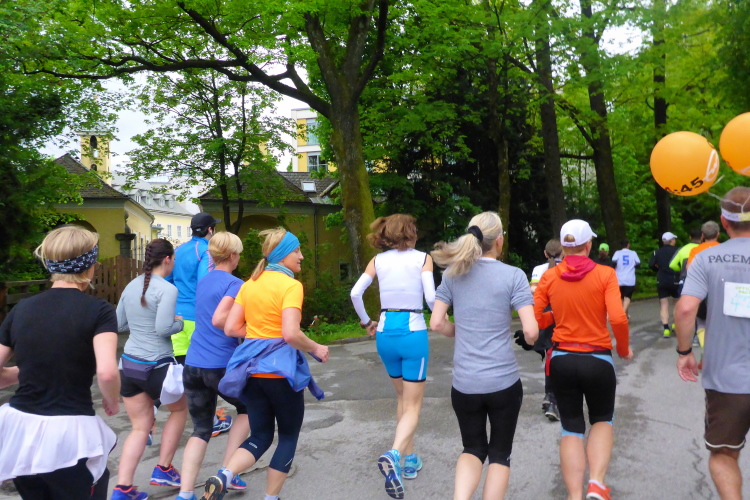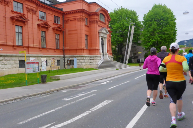 Unter lautem Gelächter der Läufer erhebt sich der Ballon des 5h00-Pacers in die Luft. Er ist ab jetzt eher inkognito unterwegs. Die Polizei sichert die Strecke über den großen Kreisverkehr, wo sich rechts das Arbeits- und Sozialgericht unter einem dichten Fassadenschutz versteckt. Wir nehmen die erste Ausfahrt zwischen dem roten Backsteinbau des Bezirksgerichts und einem Jugendstilbau namens Salzachhof hindurch. Links wird es dann richtig bunt: die Fassade des Künstlerhauses, Sitz des Salzburger Kunstvereins, ist schreiend rot.