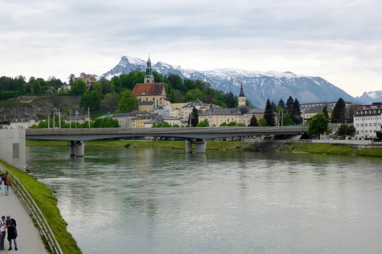 Am Platzl spielt Musik, wir laufen an den Wasserspielen vorbei über die Staatsbrücke, eine von 13 Salzburger Brücken links auf den Rudolfskai. Vorbei am alten Rathaus aus dem 12. Jahrhundert reihen sich hinter historischer Fassade Bars und Lokale. Hier ist abends ein beliebter Szenetreffpunkt. Während wir den schönen Blick auf die prächtigen Villen am gegenüberliegenden Salzachufer genießen, heizt eine Sambagruppe mächtig ein. Wir passieren den Mozartsteg. Die nach W. A. Mozart benannte Fußgängerverbindung über die Salzach wurde 1903 als mautpflichtige Brücke eröffnet. Seit 1921 werden aber keine Mautgebühren mehr erhoben. Im Mauthäuschen wartet ein kleiner Kiosk auch heute auf Kundschaft.