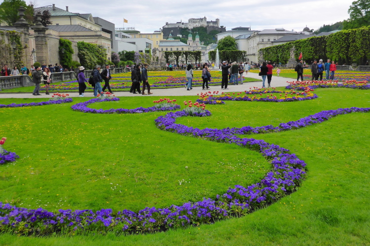 Der Mirabellen Garten wurde, wie im Barock üblich, geometrische angelegt. Durch seine einmalige Lage mitten in der Stadt, sein stilvolles Ambiente mit Springbrunnen, Skulpturen, dem Rosengarten, der Orangerie, einem Zwerglgarten (28 Zwerge aus weißem Untersberger Marmor) und dem Heckentheater ist er optimaler Naherholungsbereich für Einheimische und Touristen. Am Samstag des Marathonwochenendes werden um den Garten herum die Kinderläufe ausgetragen. Neben den unvermeidlichen Touristengruppen ist das prächtige Blumenmeer heute voll mit Kindern, die sich warmlaufen.
