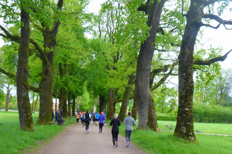 Wir biegen rechts in die Hellbrunner Straße. Nach Passieren des Städtischen Seniorenheims geht es an der Naturwissenschaftlichen Fakultät der Uni Salzburg vorbei, einem moderne Gebäude mit repräsentativem Eingangsportal. Davor ist die erste Verpflegung bei km 3 mit Wasser und Cola aufgebaut. Noch ist keiner durstig und die Helfer haben nicht viel zu tun. Unter einem Zelt wird zur Freude der Läufer Musik gemacht, ein paar Zuschauer feuern uns an. Hier befindet sich auch der Botanische Garten mit dem Apothekergarten.