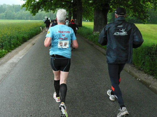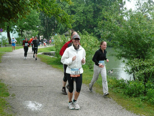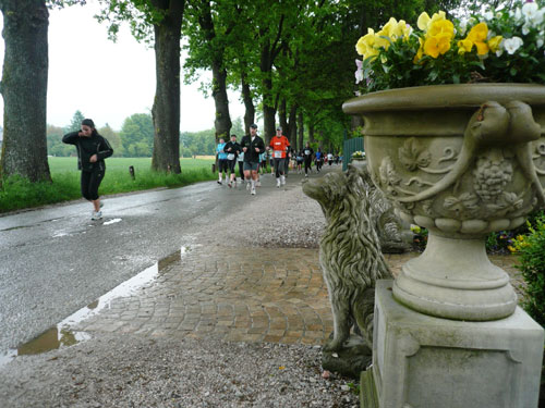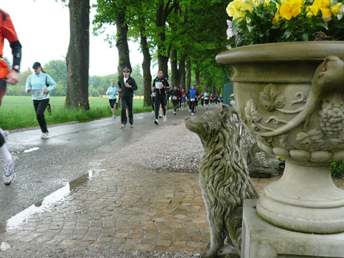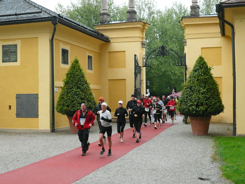 Der Ausflug ins Grüne ist hier für das Erste auch beendet und war genau 8 km lang. Kurz danach kommt auch die erste Wechselstation für die Staffeln und die zweite Wasserstelle. Das erste Viertel ist geschafft. Direkt im Anschluss werden wir in einer Schleife um den Leopoldskroner Weiher geführt und schon steht die nächste Schlossbesichtigung an. Vor dem Schlosstor spricht mich Carmen an, weil ich so viele schöne Fotos mache und ob sie die auf „meiner“ Website anschauen kann.