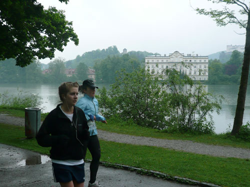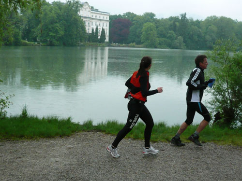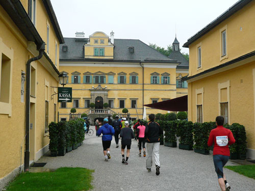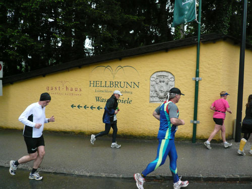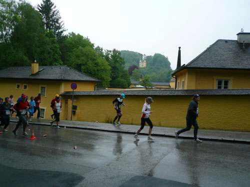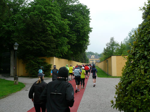 Das ließe sich doch bestimmt lösen. Das Läuferfeld ist zu diesem Zeitpunkt schon so entzerrt, das wäre bestimmt problemlos machbar. Vielleicht sogar auf einem roten Teppich wie in Hellbrunn. Aber vielleicht würden wir da ja den Herrn Bürgermeister stören, der hat nämlich verständlicherweise seine Amtsräume im Schloss untergebracht. Vater Leopold Mozart und seine Kinder Wolfgang und Nannerl haben im Schloss auch schon musiziert. Kurz danach am Makartplatz passieren wir dann mit etwas Abstand deren früheres Wohnhaus.