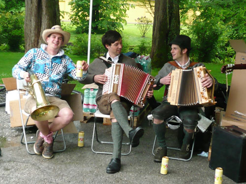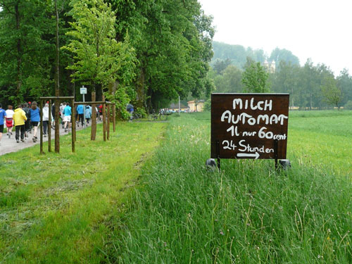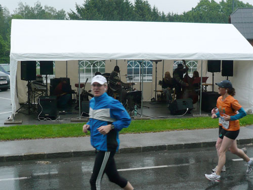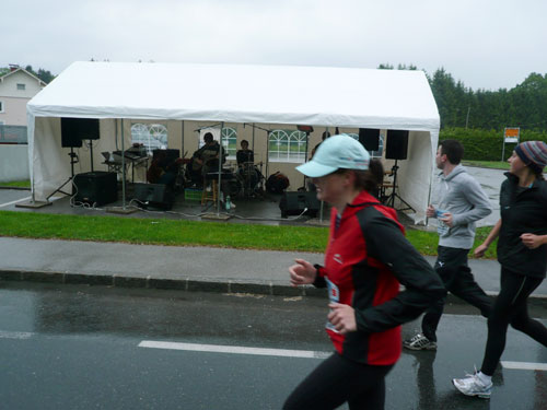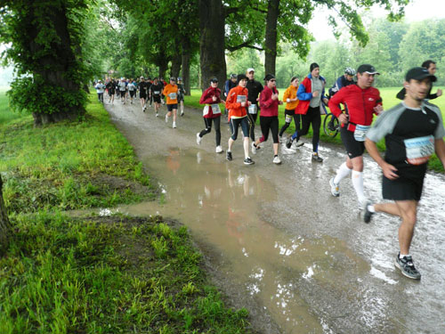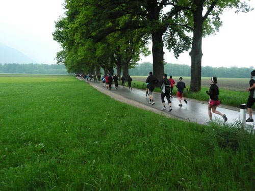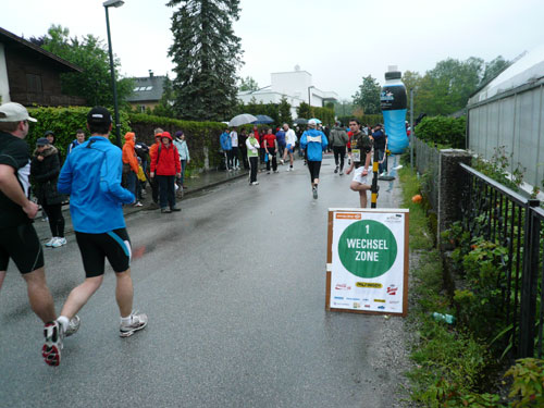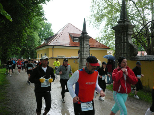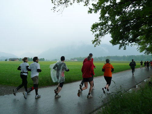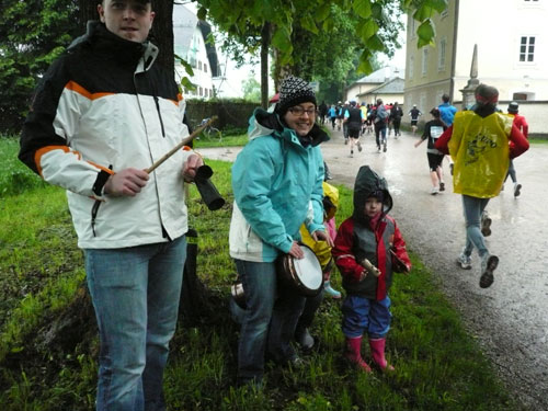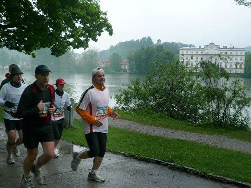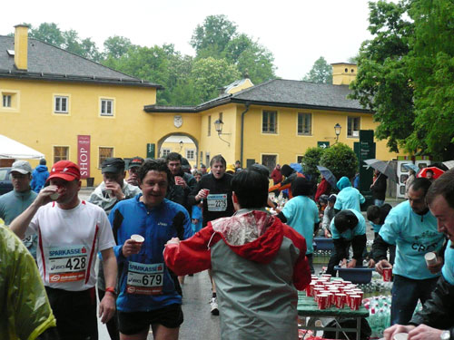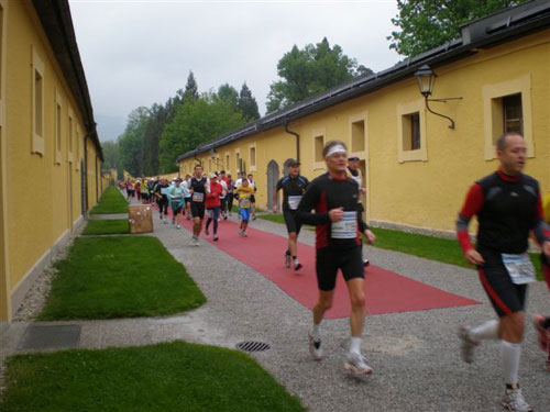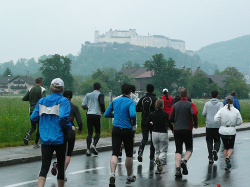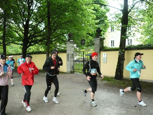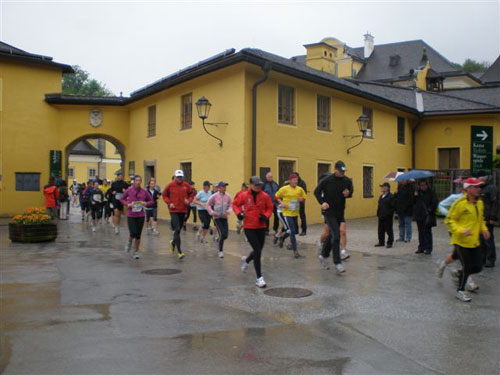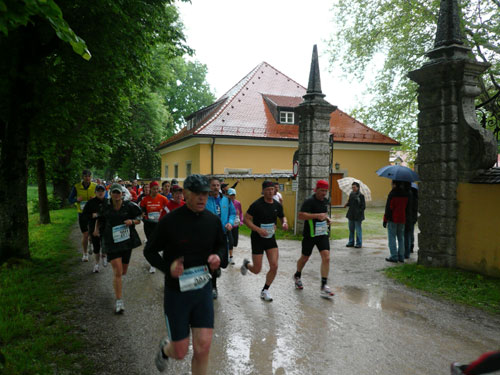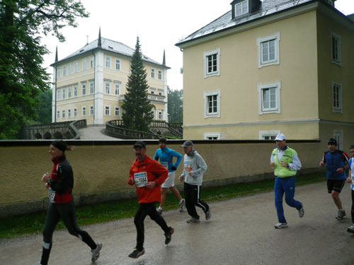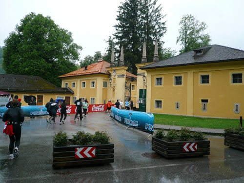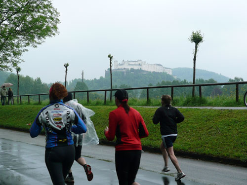 Nach dem Schlossdurchlauf ist die erste Getränkestation aufgebaut, dazu bekommen wir Unterhaltung von der urigen Pongauer Sonntagsmusi. Ab hier haben wir wieder festen Boden unter den Füßen und dürfen auf Teer weiterlaufen. Jetzt kann ich den Kopf auch wieder mal beruhigt nach oben nehmen, um die weitere Umgebung zu begutachten. Mein Blick fällt auf den Untersberg, oder das wenige was ich von ihm heute zu sehen bekomme. Ein Blick für mich in die Heimat, denn zwei Drittel gehören zu Bayern. Nach einer Wetterbesserung sieht es aber leider nicht aus.