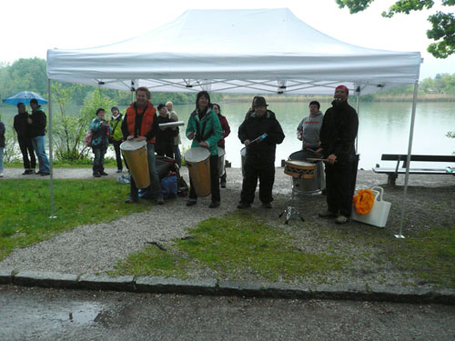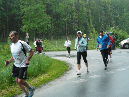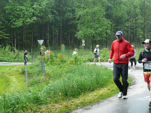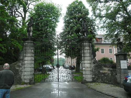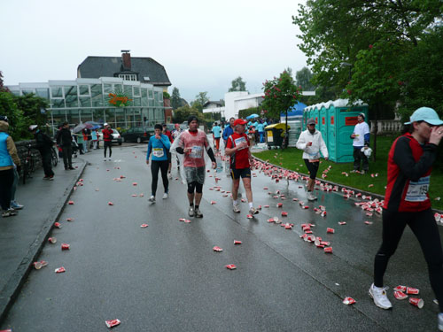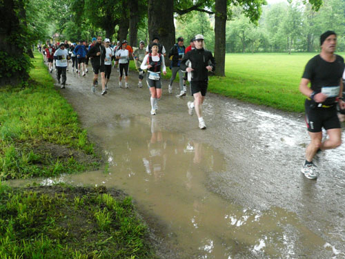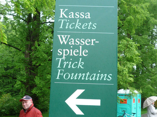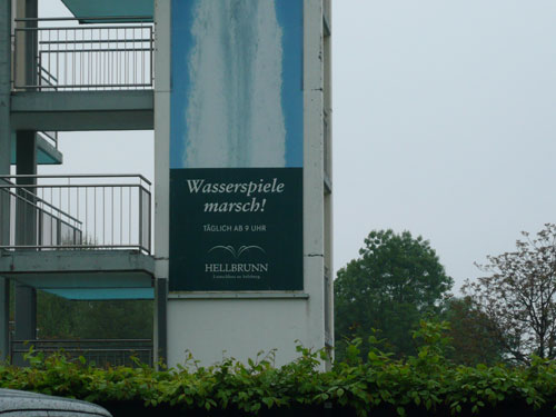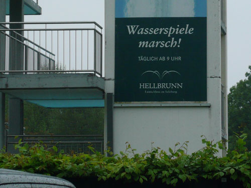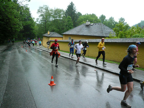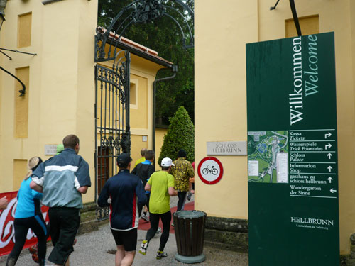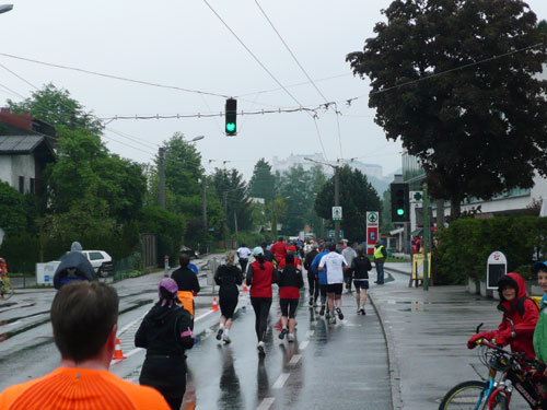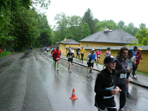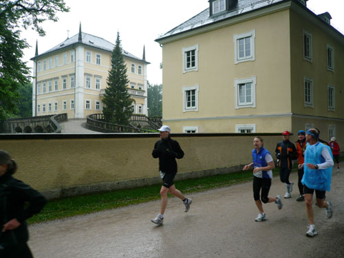 Aber umsonst ist das natürlich nicht und Zeit dazu haben wir auch nicht. Ttrotzdem bekommen wir heute Wasserspiele geboten. Aber leider nicht aus verborgenen oder ungeahnten Verstecken spritzenden Springbrunnen, sondern ganz banal und schnurstracks von oben aus den tief hängenden Wolken. Vielleicht ist das ja der berühmte Salzburger Schnürlregen. Aber ganz so schlimm, wie sich das jetzt anhört ist es nicht. Eigentlich ist es nur ein schon seit Stunden unaufhörliches Dahintröpfeln. Vielleicht auch etwas mehr. Aber richtig durchnässt bis auf die Haut wird keiner, auch meine Füße sind auch nochvollkommen trocken. Warum hier heute nicht nur einer, sondern sehr viele mit luftundurchlässigen Plastikfolien die komplette Strecke absolvieren, erschließt sich mir nicht.