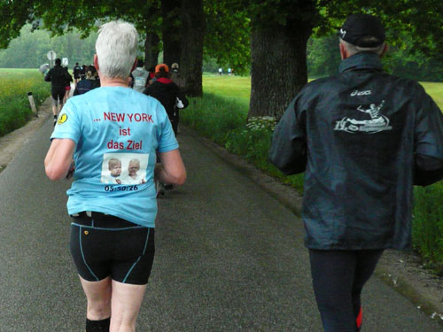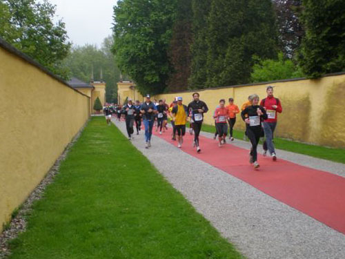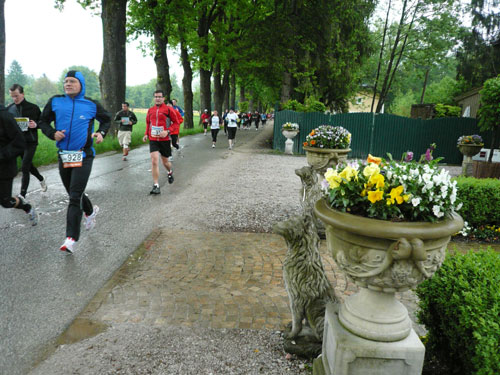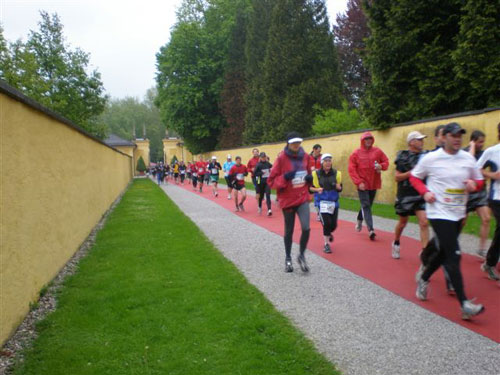 Nach fast 20 km erreiche ich Schloss Mirabell, schon beim Zulauf sticht mir auf der voran liegenden Parkanlage ein wunderschöner exotischer Trompetenbaum mit kreisförmig gewachsenen Ästen ins Auge. Den Blick in den weltberühmten Mirabell-Garten im Innenhof können wir ganz kurz, ein Stück weiter durch ein schmiedeeisernes Tor erhaschen und ich würde zu gerne einen Abstecher hinein machen. Aber den Ausflug habe ich bereits am Vortag unternommen, daher weiß ich, welche Blütenpracht hinter den Mauern der barocken Gartenanlage mit seinen wunderschönen Brunnen und Statuen verborgen ist. Hier wäre doch vielleicht eine Streckenoptimierung möglich, daher mein Vorschlag an den Marathonveranstalter: könnte man nicht die Streckenführung durch diese traumhafte Anlage legen? Die Japaner und Chinesen werden uns schon Platz machen.