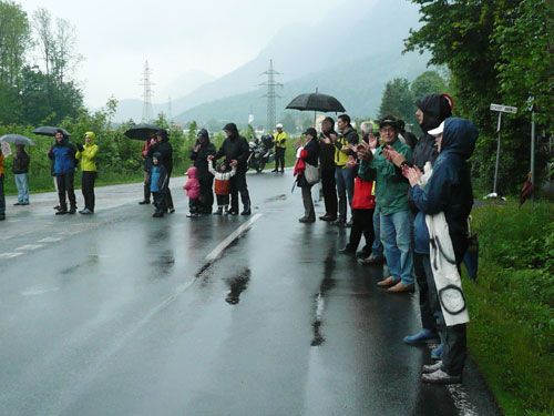 Die nächsten Kilometer schlängeln sich unspektakulär durch die Salzburger Vororte.18 km haben wir hinter uns, als wir wieder in Altstadtnähe sind, rein dürfen wir aber noch nicht, wir werden in einem Bogen daran vorbei geleitet. Über die Lehener Brücke überqueren wir auf der zur Hälfte vom Autoverkehr abgesperrten Fahrbahn die Salzach. Nicht nur hier, sondern fast im gesamten Stadtbereich teilen wir uns die Straßen mit den Autofahrern, alles perfekt organisiert durch Helfer und der hiesigen Gendarmarie.