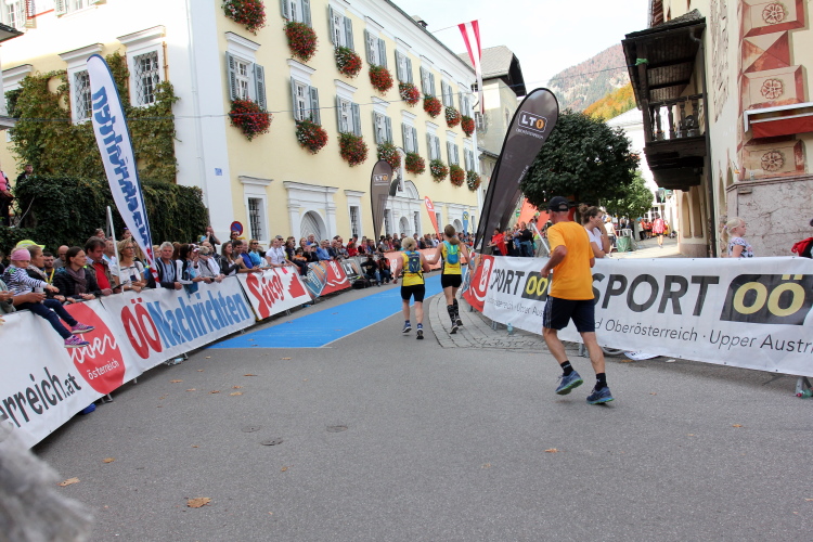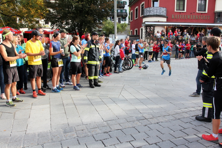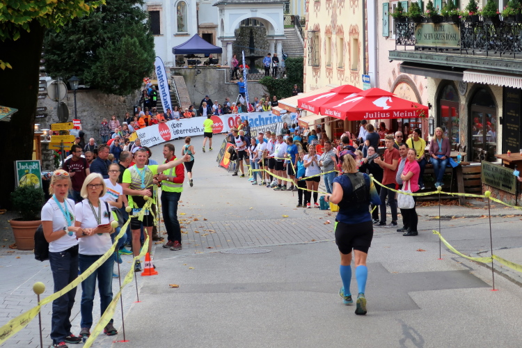 Zunächst ist es nur ein dumpfes Geräusch ähnlich einer Brandung, das an Intensität aber schnell gewinnt. Im Ortskern angekommen, windet sich die Gasse in einer steilen Linkskurve unversehens in die Tiefe, direkt auf den zentralen Kirchplatz einmündend. Und dort offenbart sich mir optisch wie akustisch nun mit aller Kraft die Ursache jenes Lärms: Eine riesige Menschenmenge bevölkert den Platz zu Füßen der alles überragenden St. Wolfgangs-Kirche. Die entlang der den Kurs abgrenzenden Trassierbänder harrenden Zaungäste begrüßen die Ankömmlinge mit lauten Anfeuerungsrufen. Was für eine Stimmung!