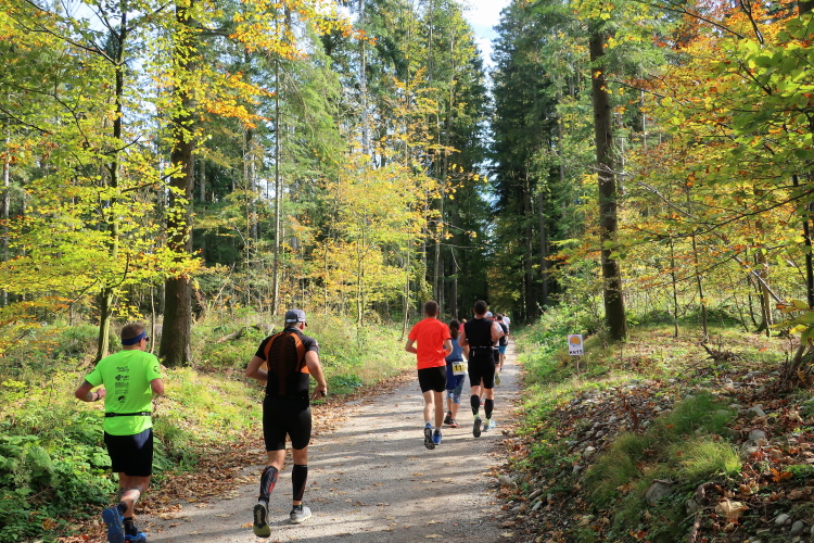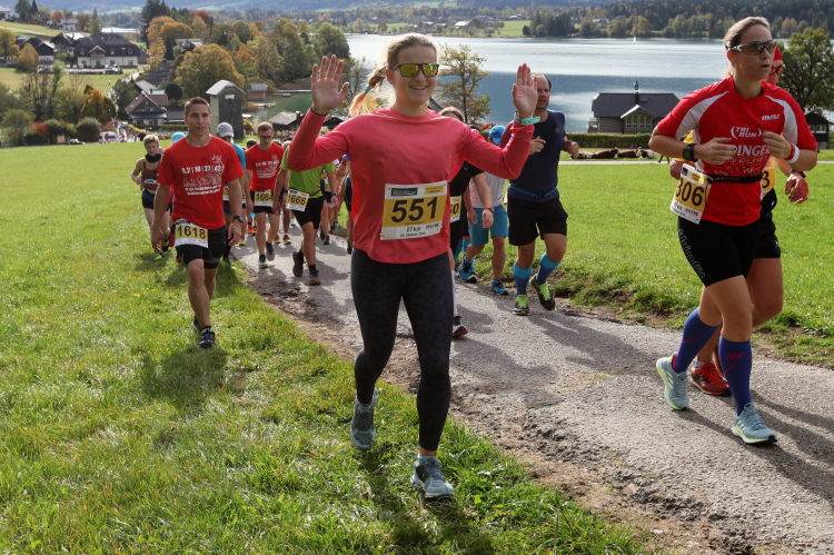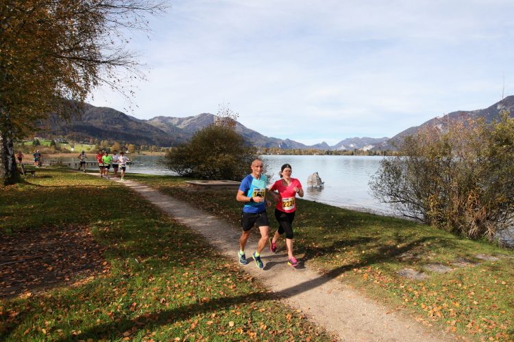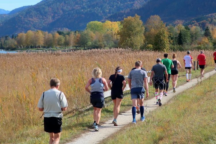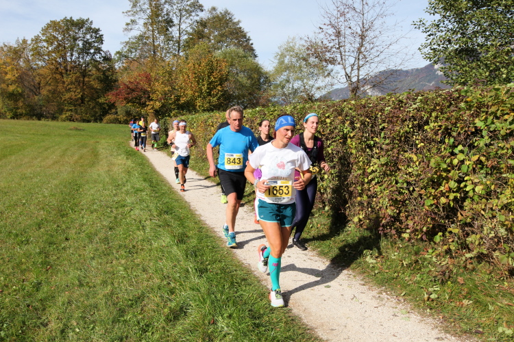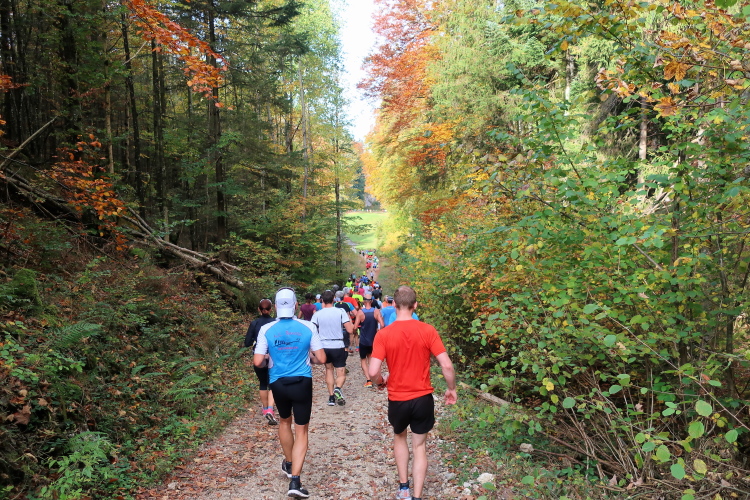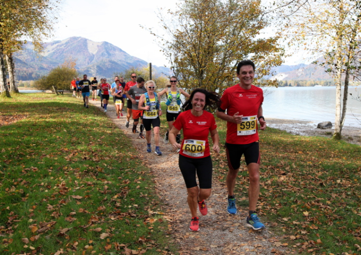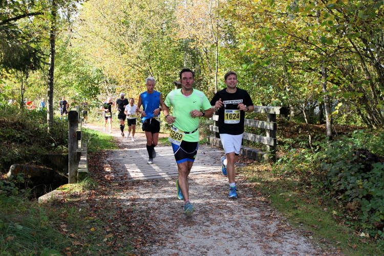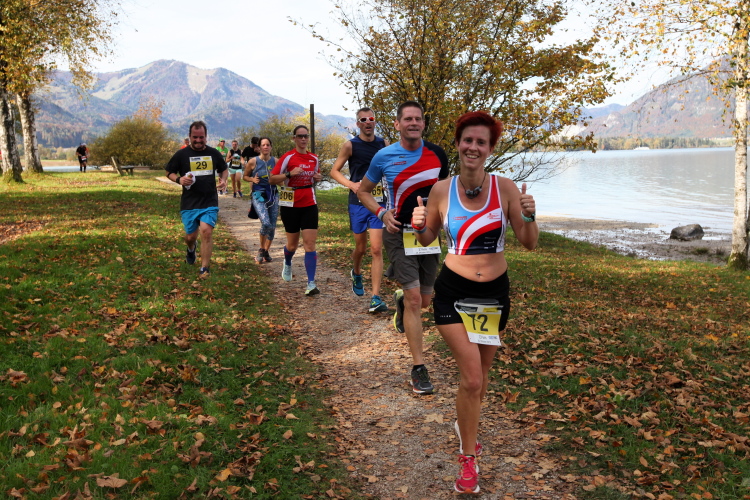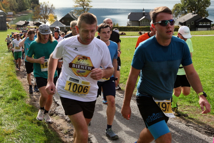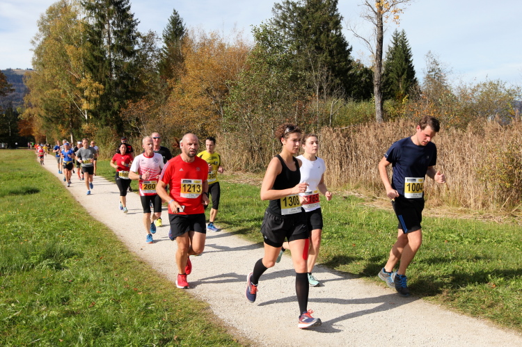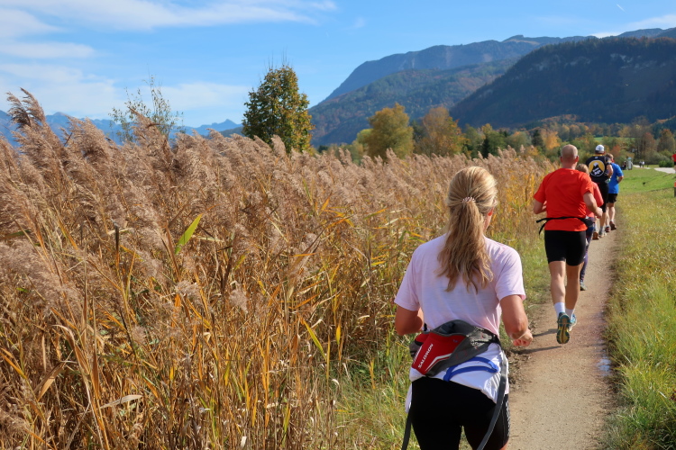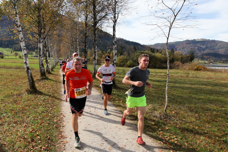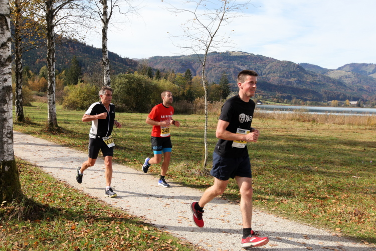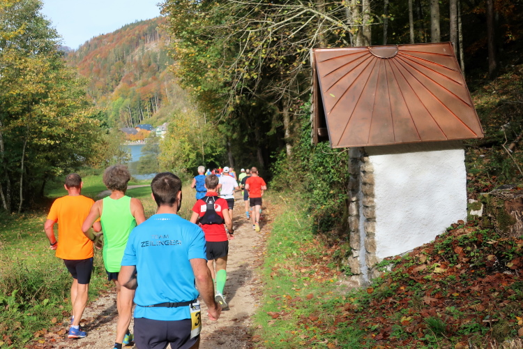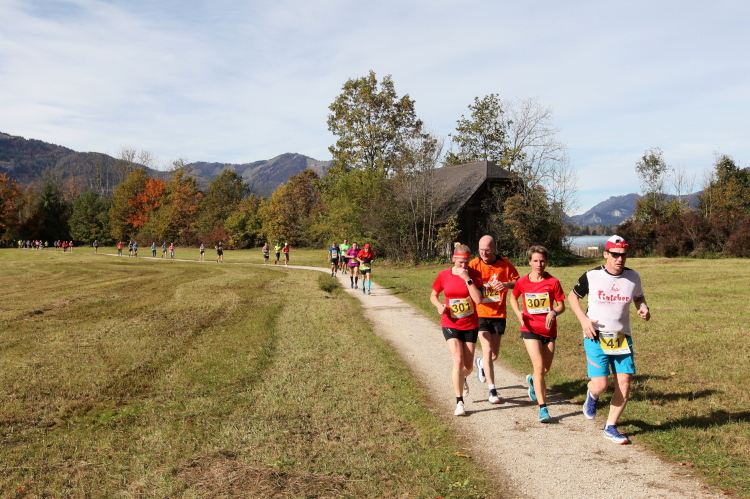 Zeitweise müssen wir uns nun vom See verabschieden. Wir haben die Zinkenbach-Halbinsel erreicht, einen ebenen Schwemmkegel des besagten Baches, der dazu führt, dass der See hier zu seiner schmalsten Stelle verengt wird. Nach einem weiten Bogen durch die Wiesen tauchen wir einmal mehr ein in bunt-raschelnden Laubwald, ehe wir nach Querung des Zinkenbachs bei Gschwendt den Startbogen des 10 km-Laufs durchlaufen und wieder auf Seekurs sind.