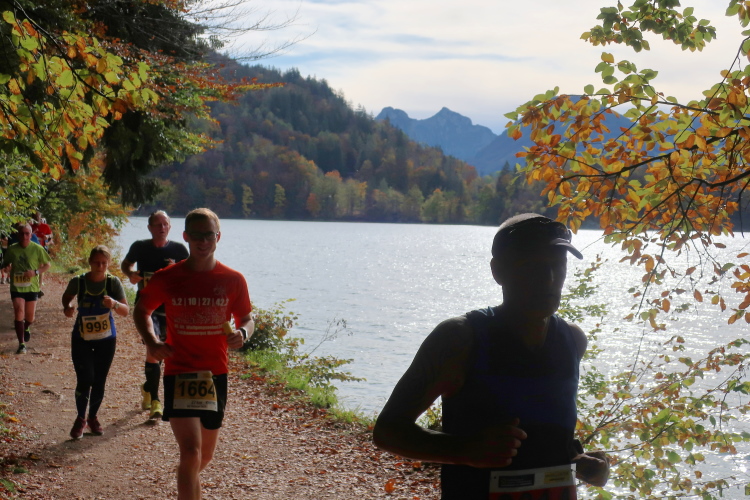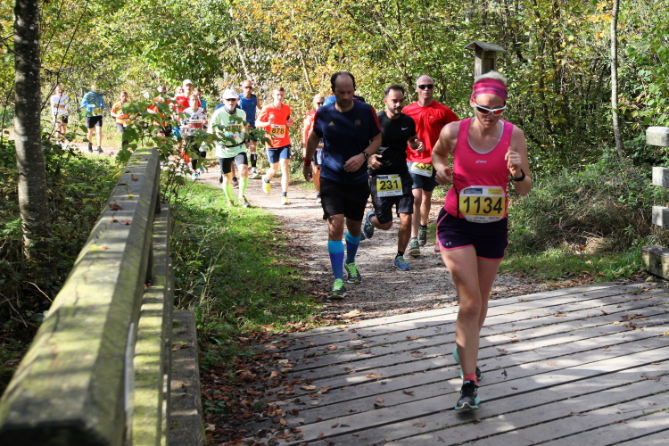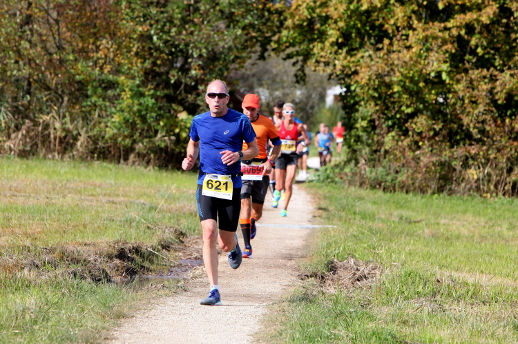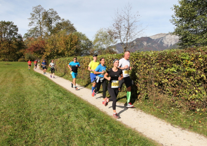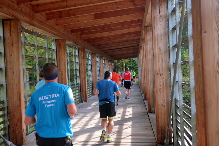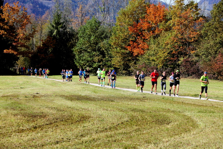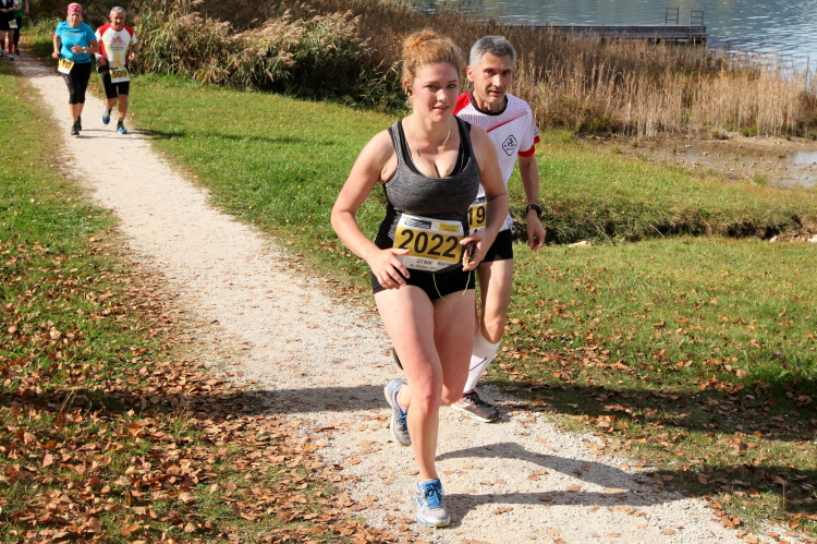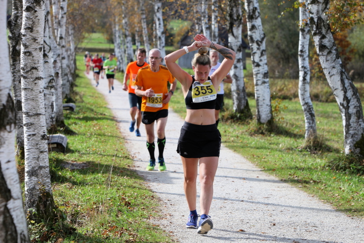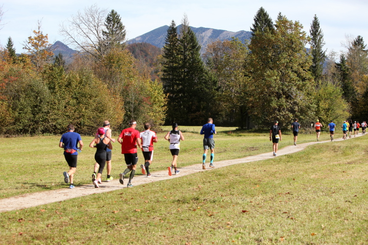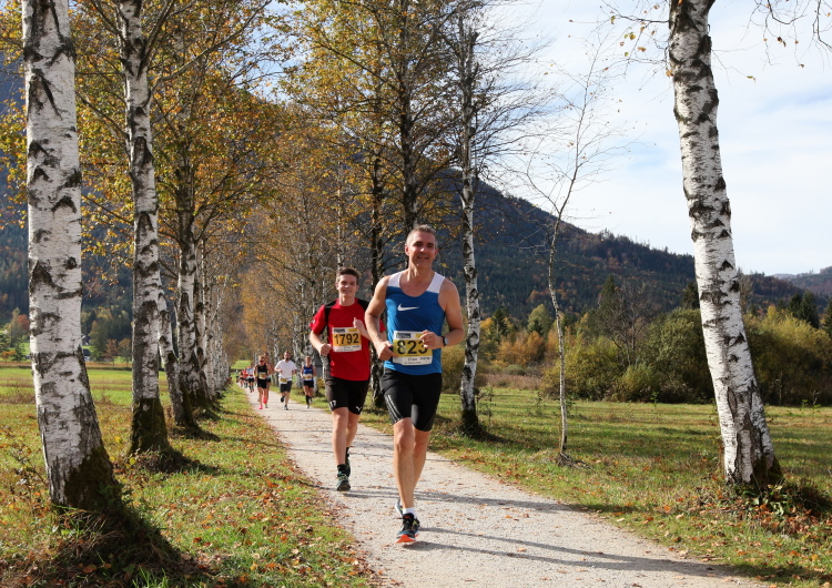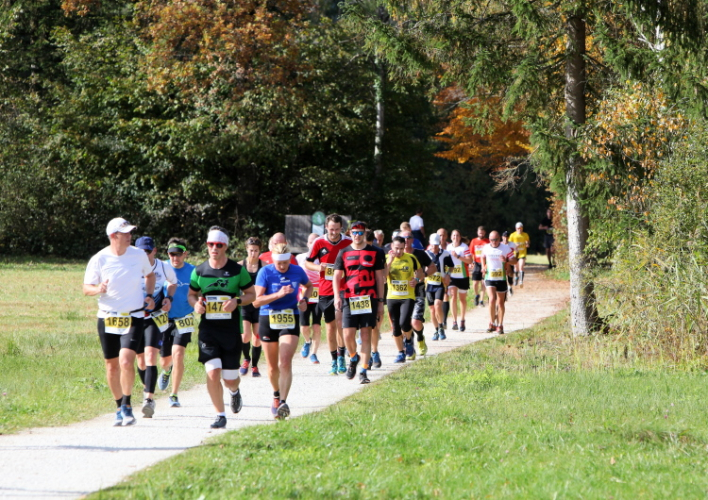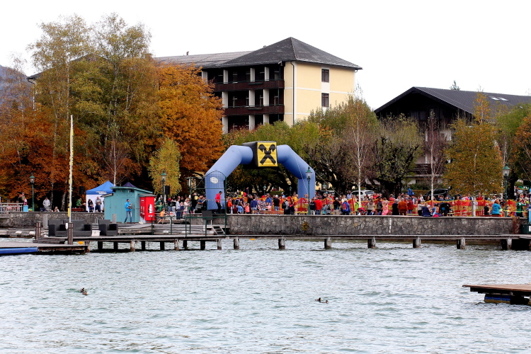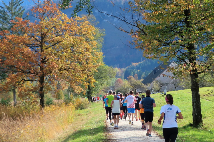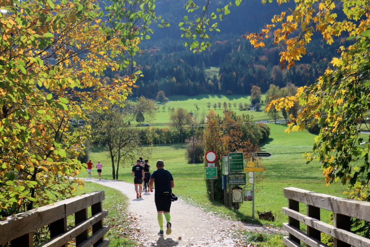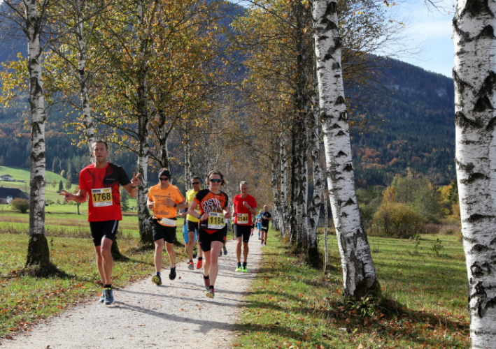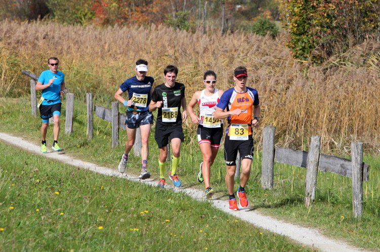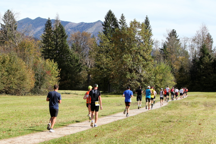 Zeitweise müssen wir uns nun vom See verabschieden. Wir haben die Zinkenbach-Halbinsel erreicht, einen ebenen Schwemmkegel des besagten Baches, der dazu führt, dass der See hier zu seiner schmalsten Stelle verengt wird. Nach einem weiten Bogen durch die Wiesen tauchen wir einmal mehr ein in bunt-raschelnden Laubwald, ehe wir nach Querung des Zinkenbachs bei Gschwendt den Startbogen des 10 km-Laufs durchlaufen und wieder auf Seekurs sind.