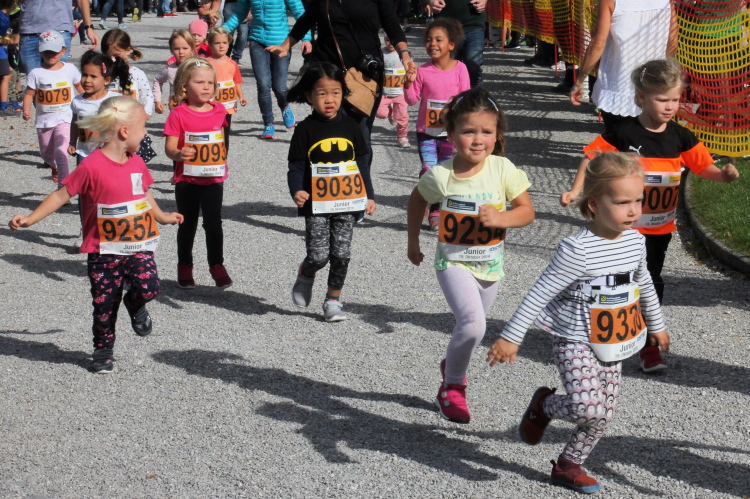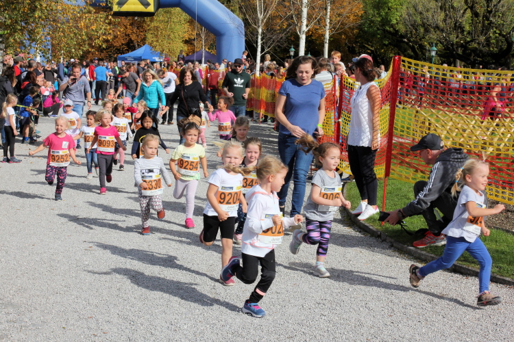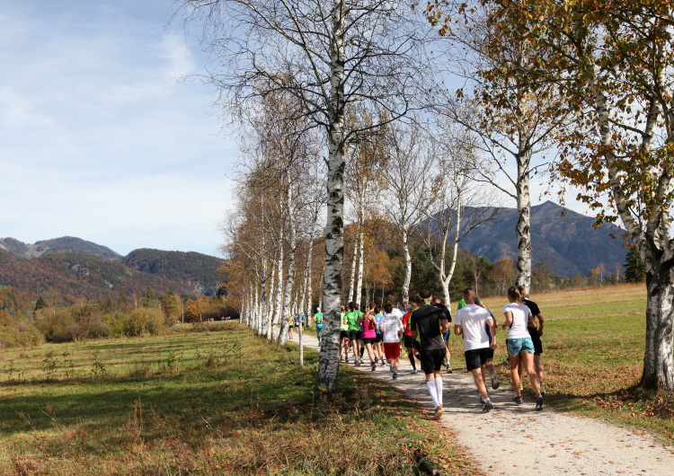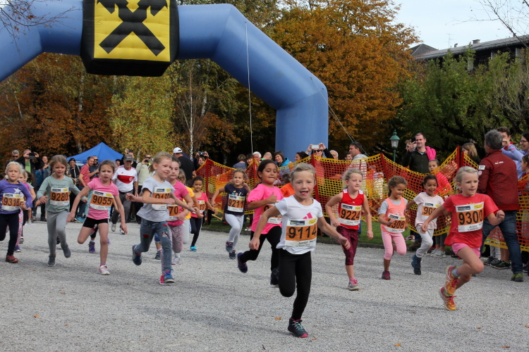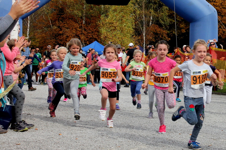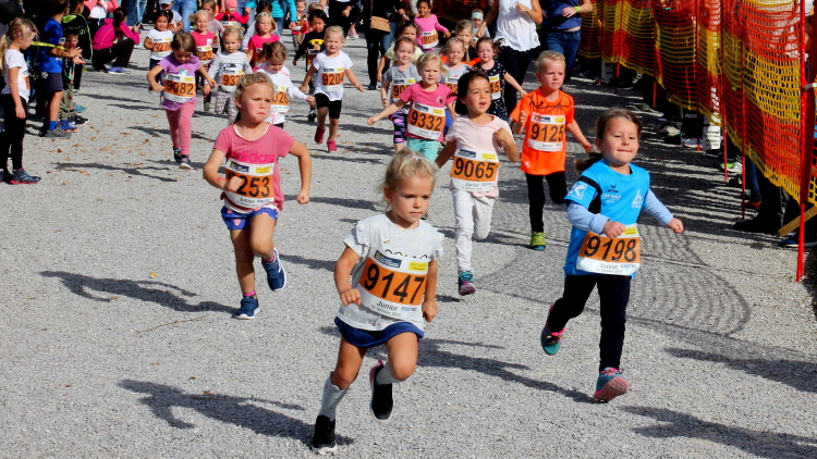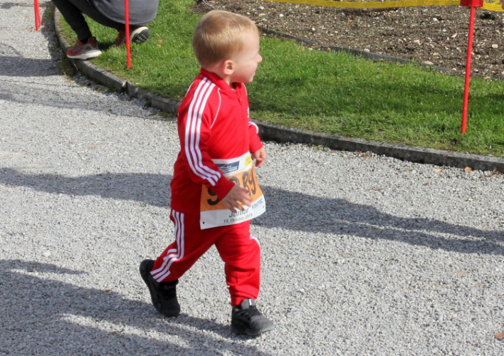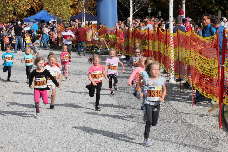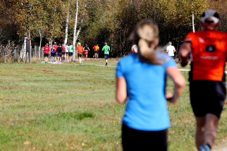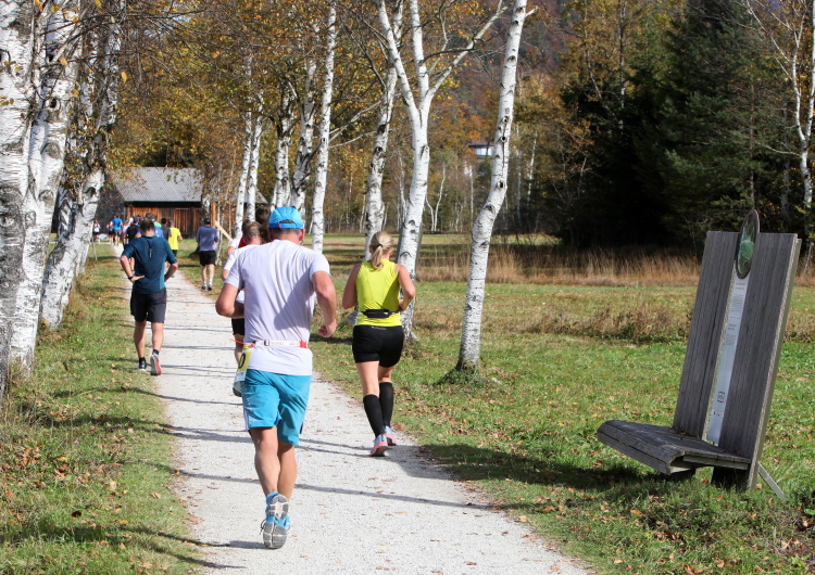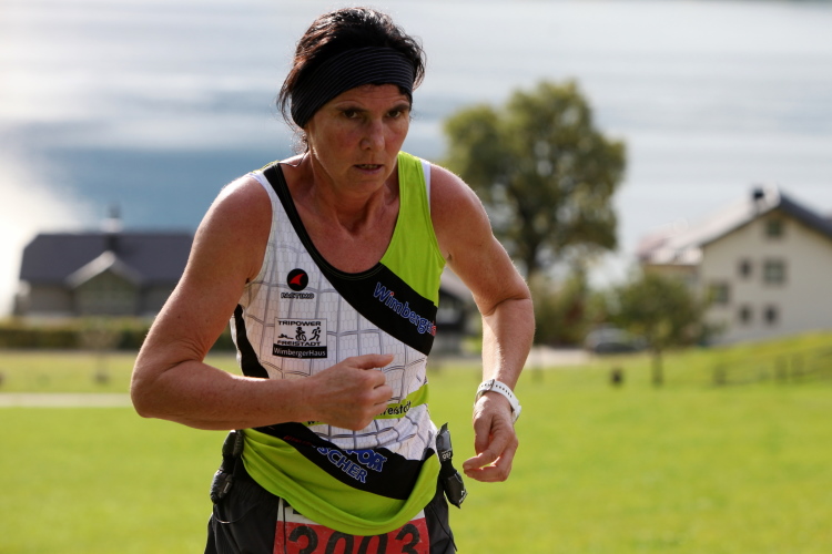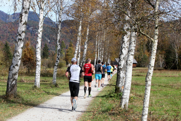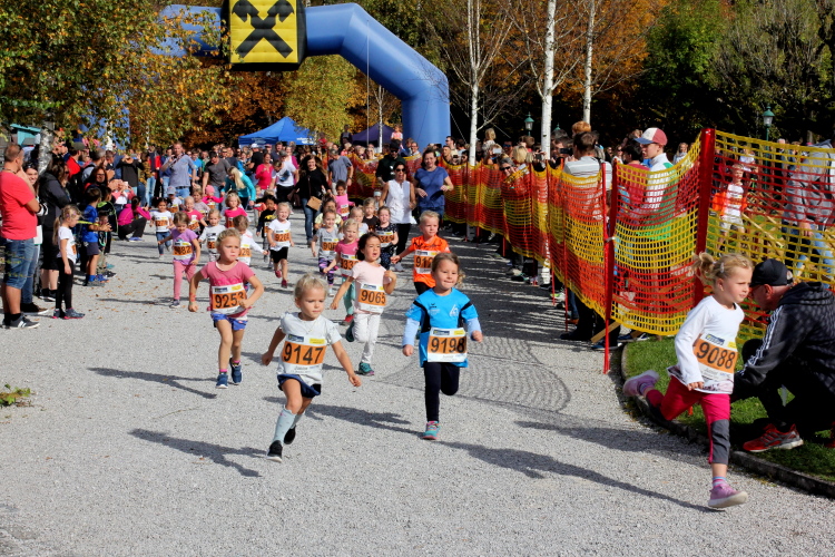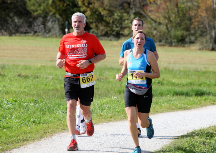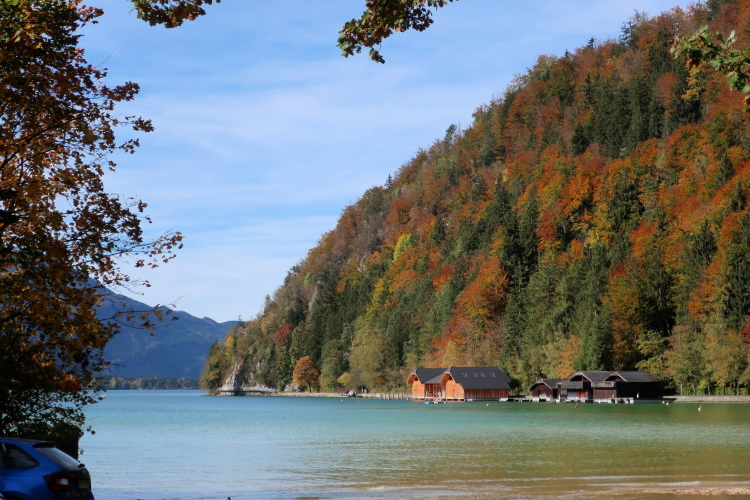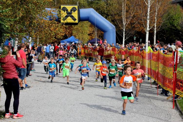 Zeitweise müssen wir uns nun vom See verabschieden. Wir haben die Zinkenbach-Halbinsel erreicht, einen ebenen Schwemmkegel des besagten Baches, der dazu führt, dass der See hier zu seiner schmalsten Stelle verengt wird. Nach einem weiten Bogen durch die Wiesen tauchen wir einmal mehr ein in bunt-raschelnden Laubwald, ehe wir nach Querung des Zinkenbachs bei Gschwendt den Startbogen des 10 km-Laufs durchlaufen und wieder auf Seekurs sind.