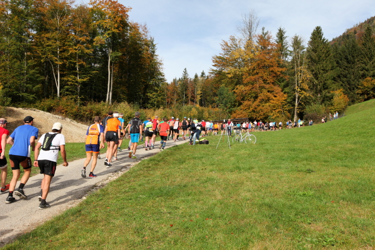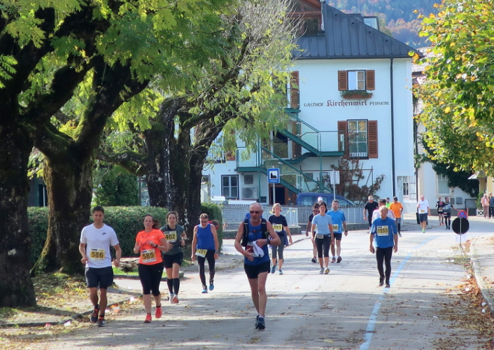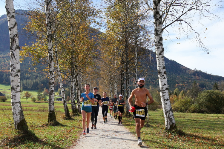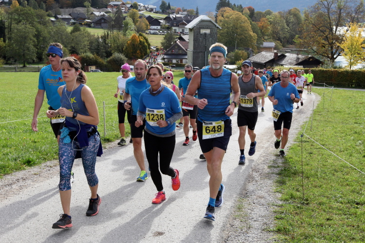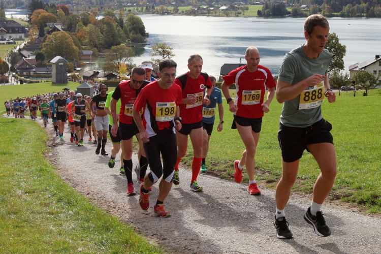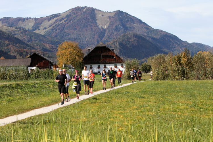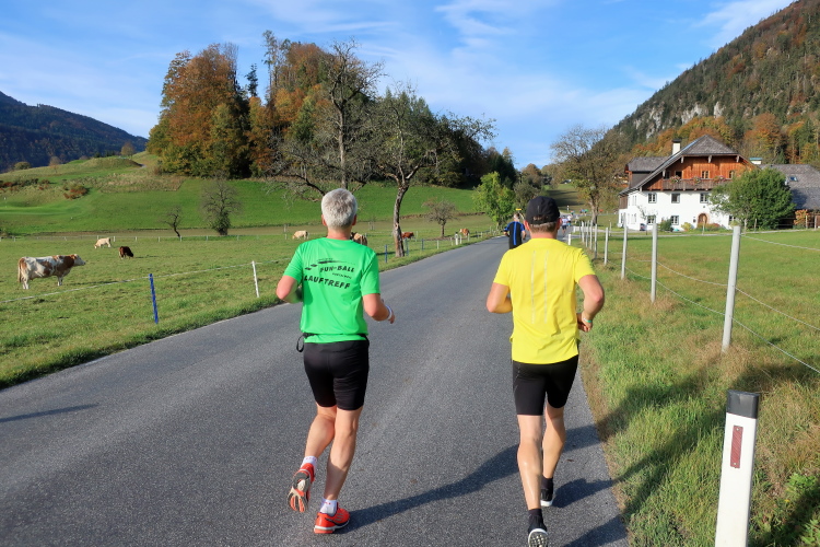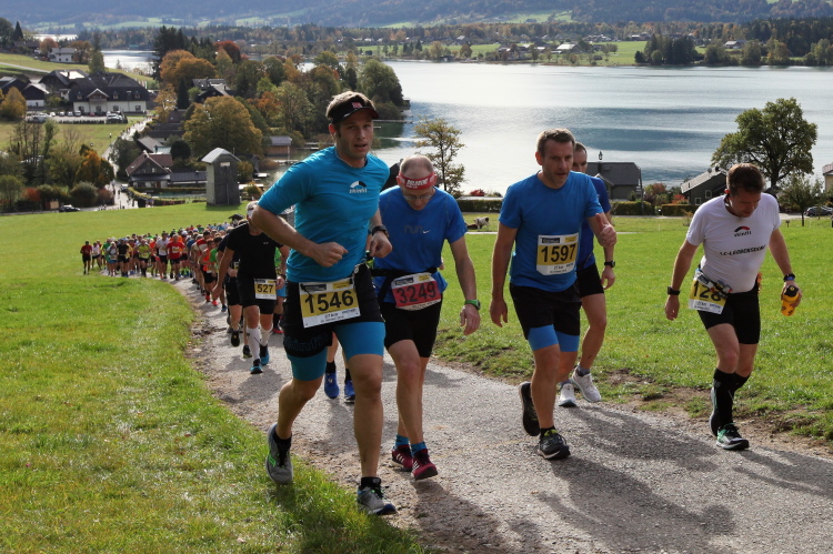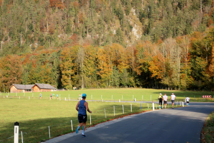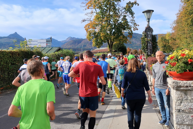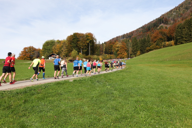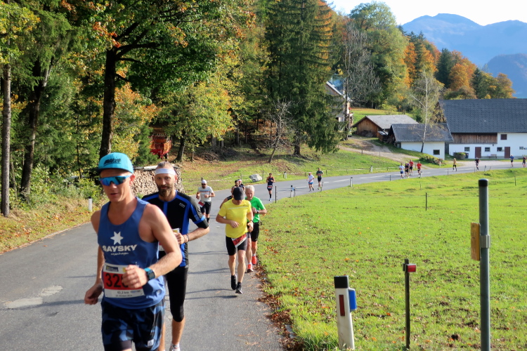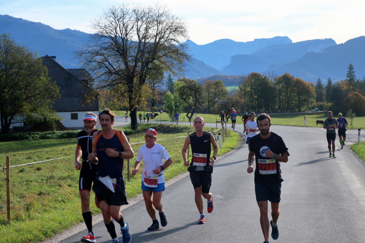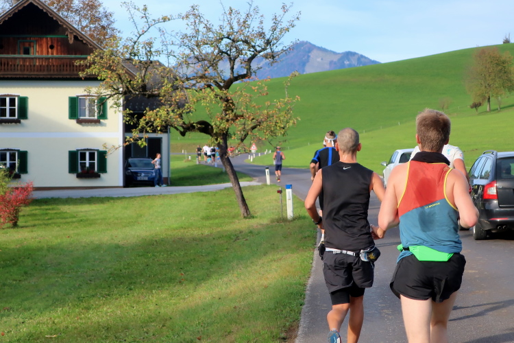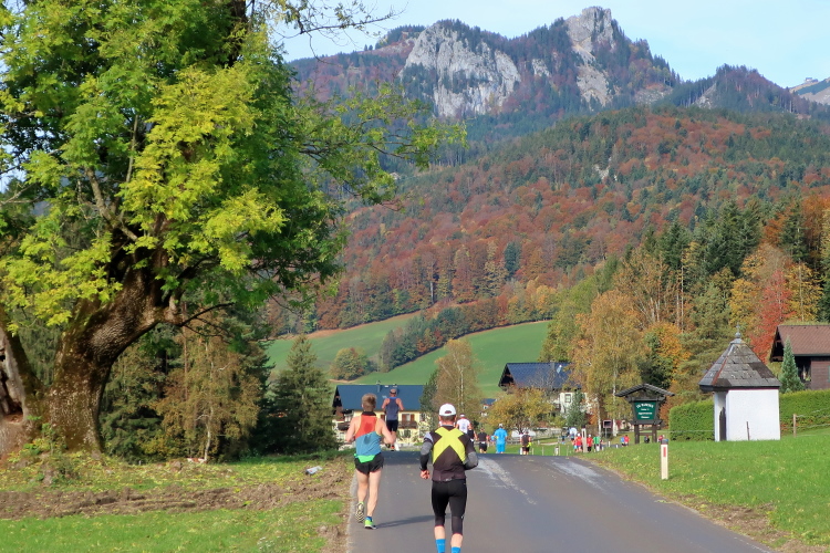 In leichtem Auf und Ab, Ersteres überwiegend, windet sich im Folgenden unser Kurs auf kleinen Asphaltsträßchen inmitten der berggerahmten Naturkulisse durch saftig grüne Wiesen und Weiden, vorbei an kleinen Weilern und Höfen. Der Herbst präsentiert sich von seiner schönsten Seite, indem er das bunt gefärbte Laub der Bäume im Sonnenlicht erstrahlen lässt. Interessiert nehmen hier allein die Kühe von uns Notiz. Sehr entspannend, geradezu meditativ ist das Laufen und ich lasse mich, noch frisch und motiviert, gerne dazu verlocken, das Tempo hoch zu halten. Zumal ich das Ziel habe, zum Start des 27ers ab 10:30 Uhr St. Wolfgang zu erreichen, um dann die Stimmung live erleben zu können, für die der Hauptlauf so bekannt ist. Hier und jetzt ist das jedoch so ganz anders. Weit hat sich das Band der Marathonis auseinander gezogen.