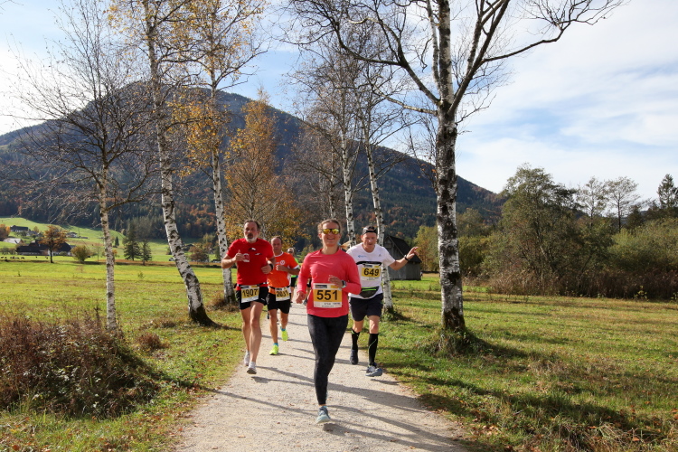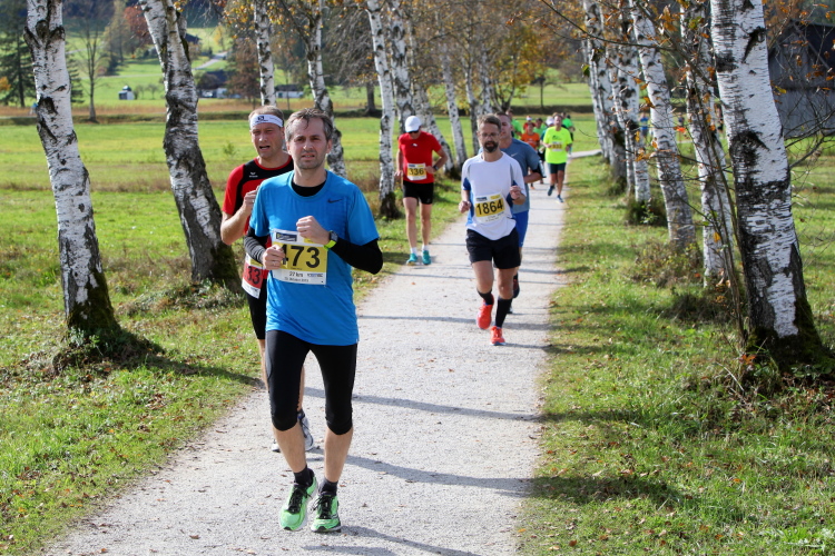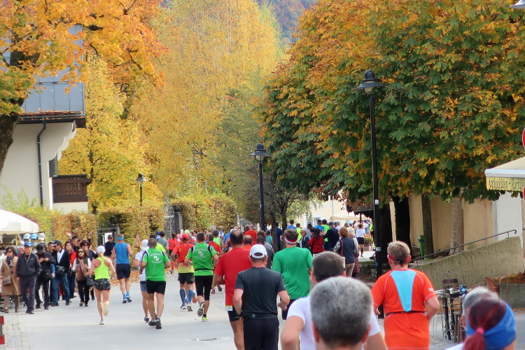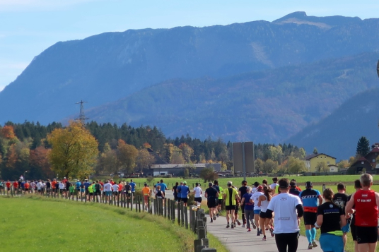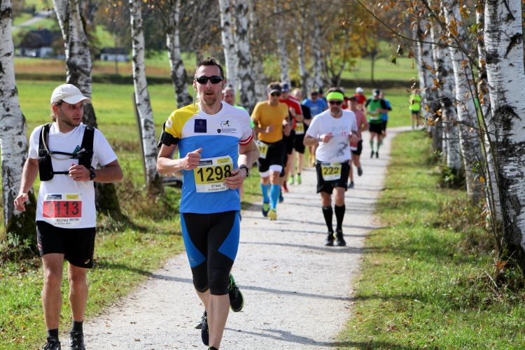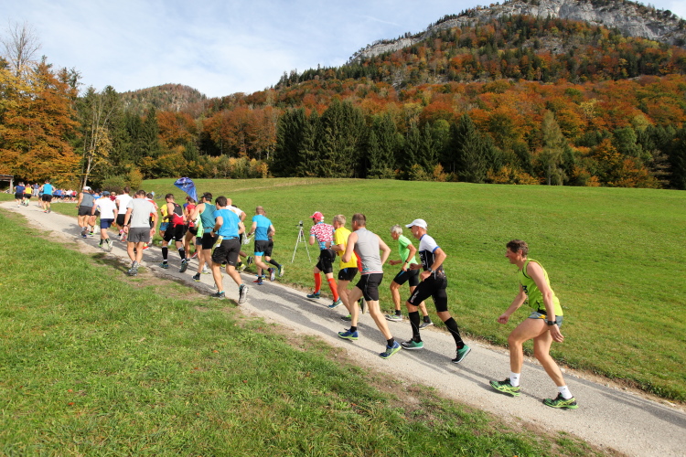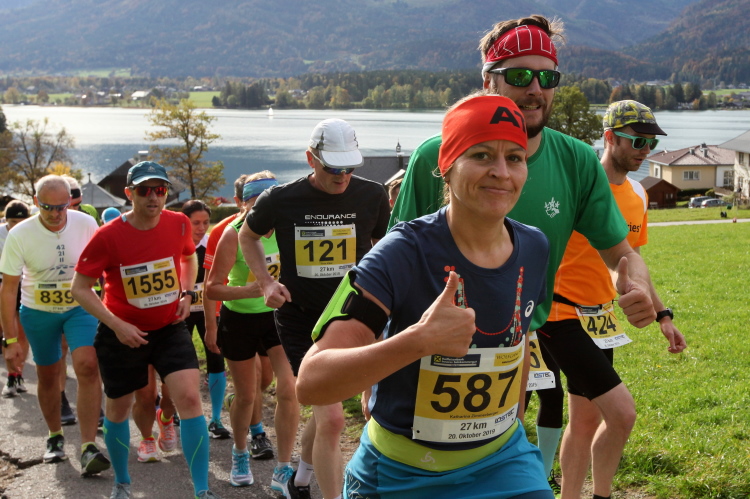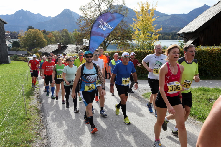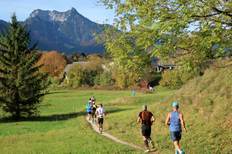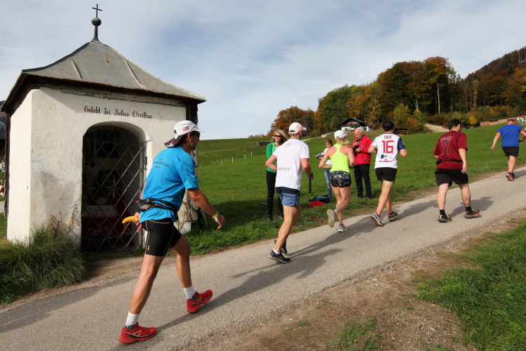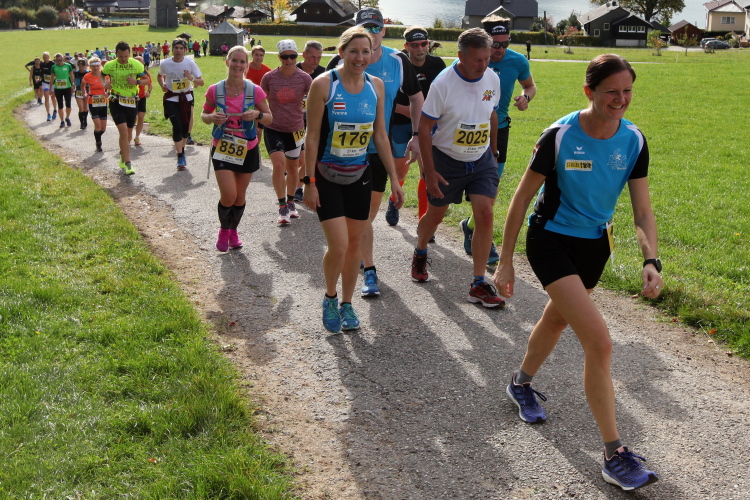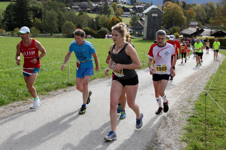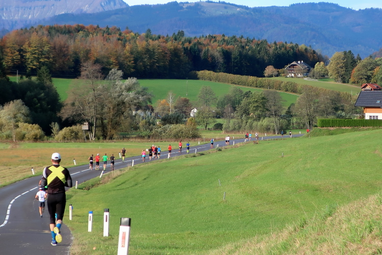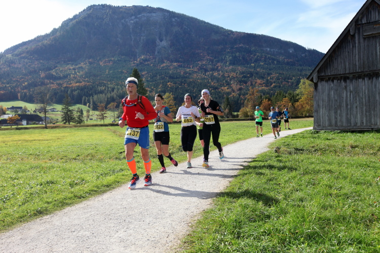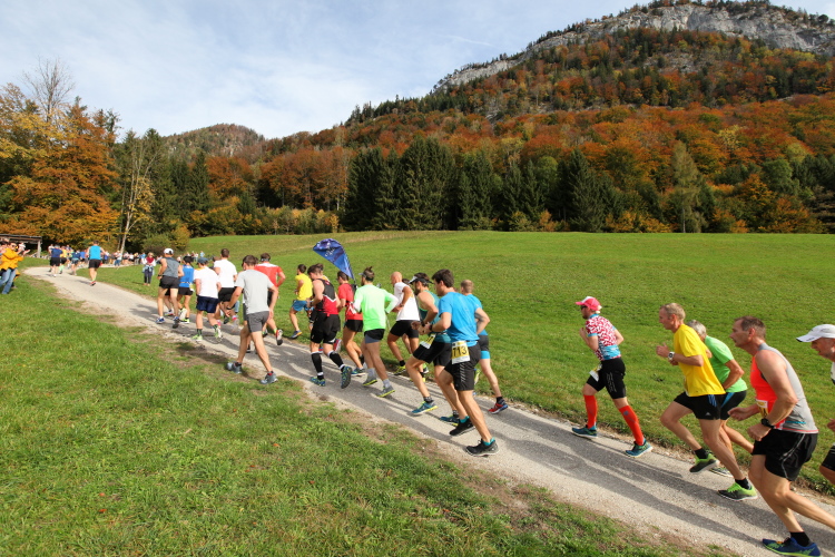 In leichtem Auf und Ab, Ersteres überwiegend, windet sich im Folgenden unser Kurs auf kleinen Asphaltsträßchen inmitten der berggerahmten Naturkulisse durch saftig grüne Wiesen und Weiden, vorbei an kleinen Weilern und Höfen. Der Herbst präsentiert sich von seiner schönsten Seite, indem er das bunt gefärbte Laub der Bäume im Sonnenlicht erstrahlen lässt. Interessiert nehmen hier allein die Kühe von uns Notiz. Sehr entspannend, geradezu meditativ ist das Laufen und ich lasse mich, noch frisch und motiviert, gerne dazu verlocken, das Tempo hoch zu halten. Zumal ich das Ziel habe, zum Start des 27ers ab 10:30 Uhr St. Wolfgang zu erreichen, um dann die Stimmung live erleben zu können, für die der Hauptlauf so bekannt ist. Hier und jetzt ist das jedoch so ganz anders. Weit hat sich das Band der Marathonis auseinander gezogen.