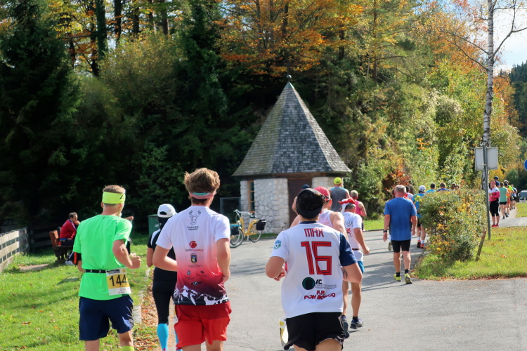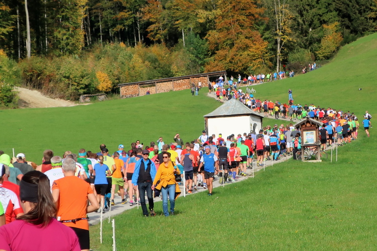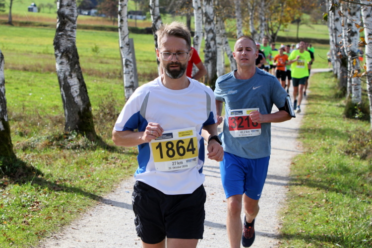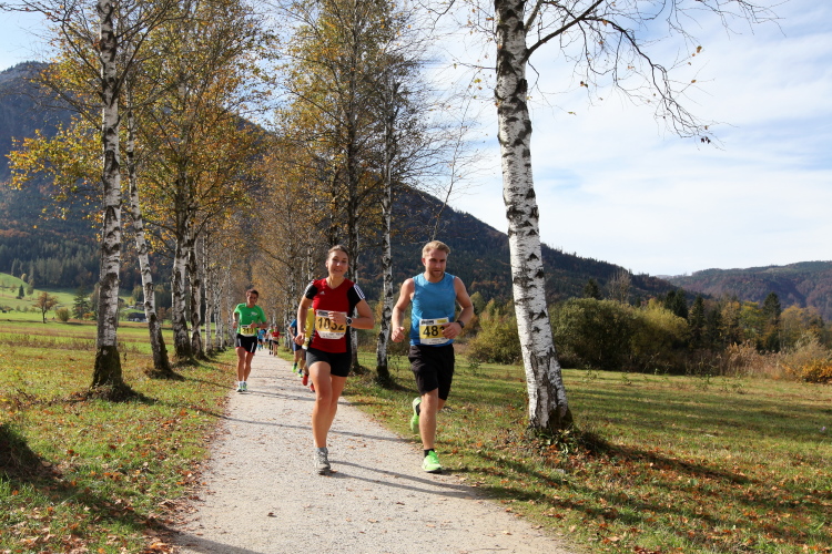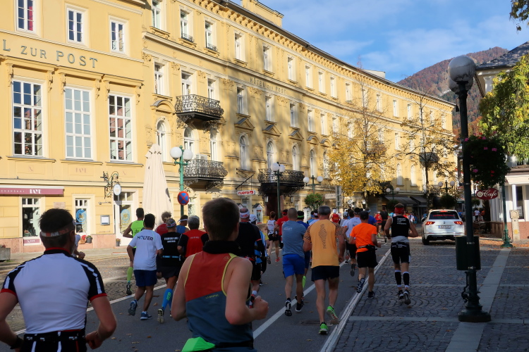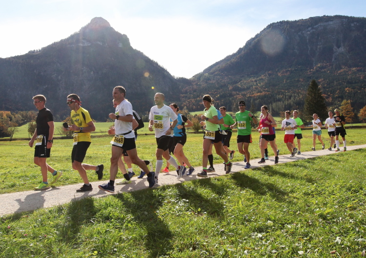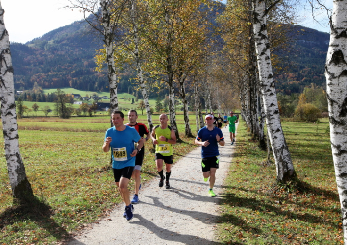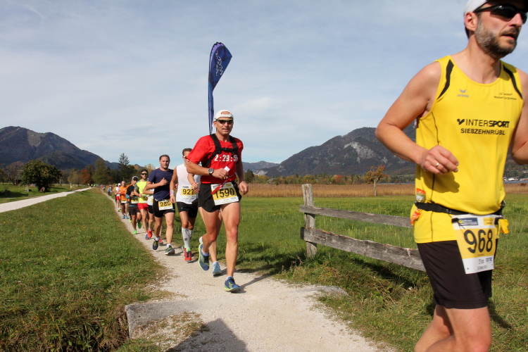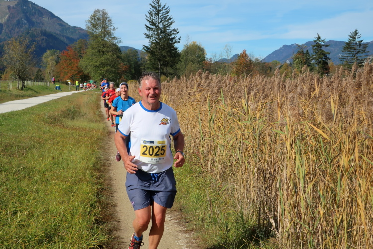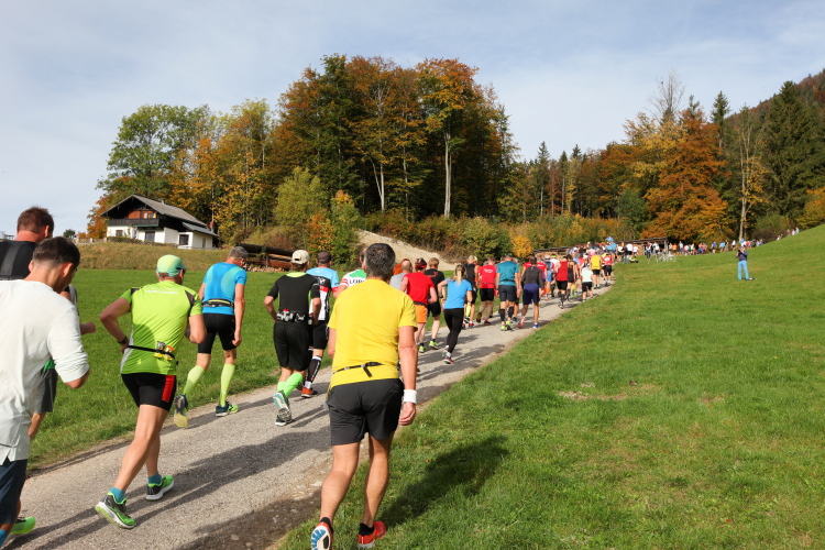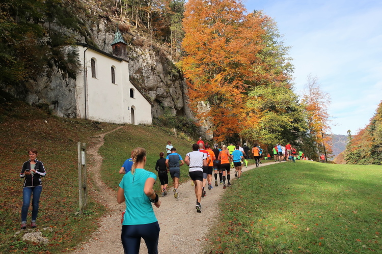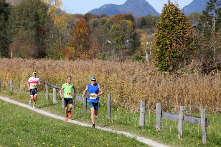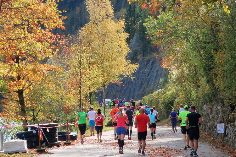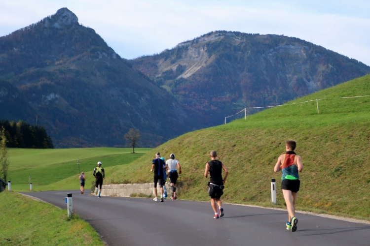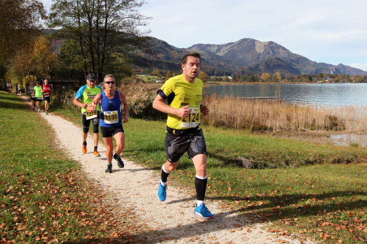 In leichtem Auf und Ab, Ersteres überwiegend, windet sich im Folgenden unser Kurs auf kleinen Asphaltsträßchen inmitten der berggerahmten Naturkulisse durch saftig grüne Wiesen und Weiden, vorbei an kleinen Weilern und Höfen. Der Herbst präsentiert sich von seiner schönsten Seite, indem er das bunt gefärbte Laub der Bäume im Sonnenlicht erstrahlen lässt. Interessiert nehmen hier allein die Kühe von uns Notiz. Sehr entspannend, geradezu meditativ ist das Laufen und ich lasse mich, noch frisch und motiviert, gerne dazu verlocken, das Tempo hoch zu halten. Zumal ich das Ziel habe, zum Start des 27ers ab 10:30 Uhr St. Wolfgang zu erreichen, um dann die Stimmung live erleben zu können, für die der Hauptlauf so bekannt ist. Hier und jetzt ist das jedoch so ganz anders. Weit hat sich das Band der Marathonis auseinander gezogen.