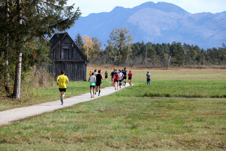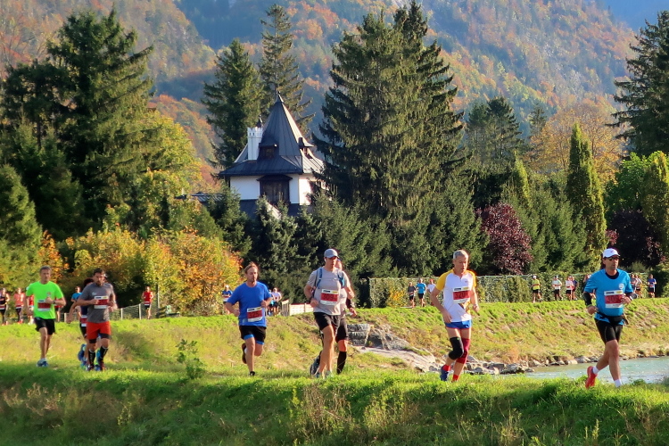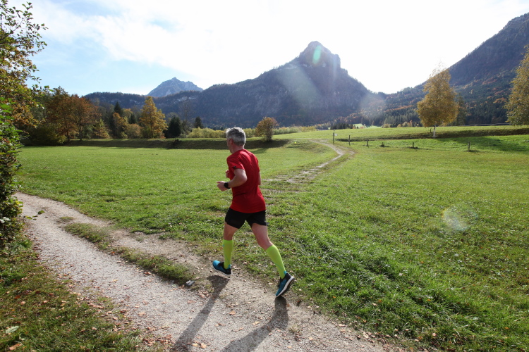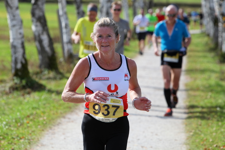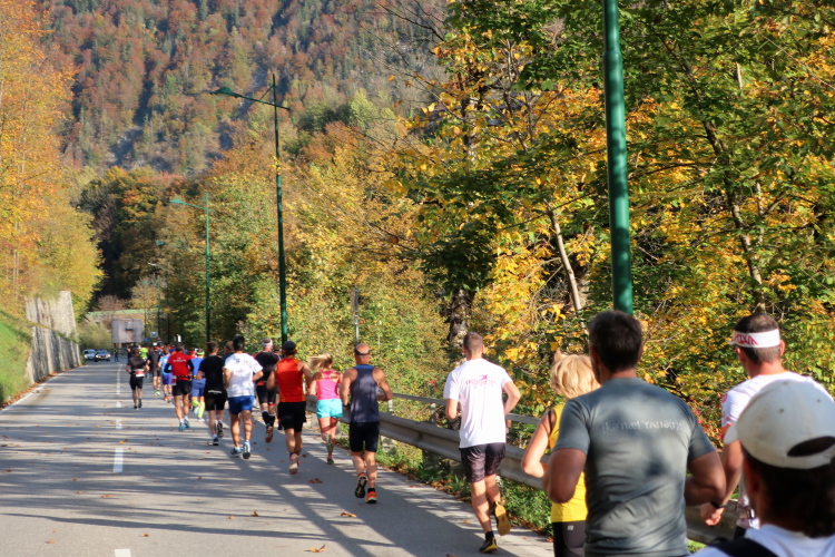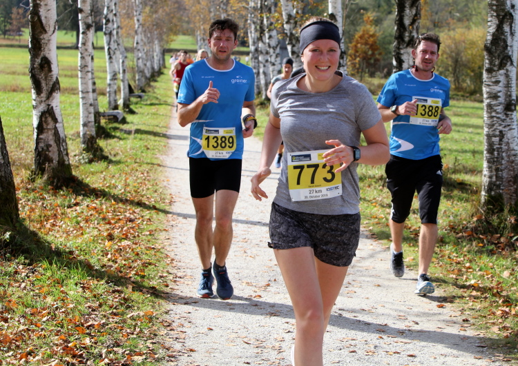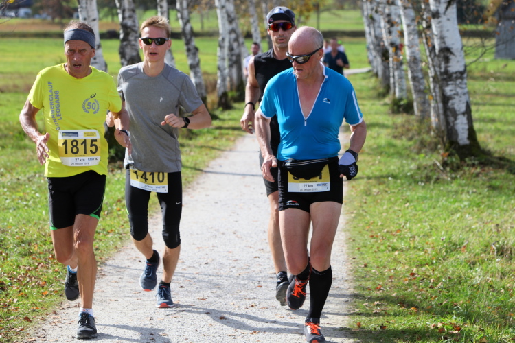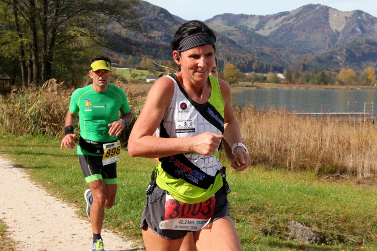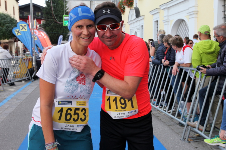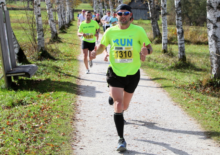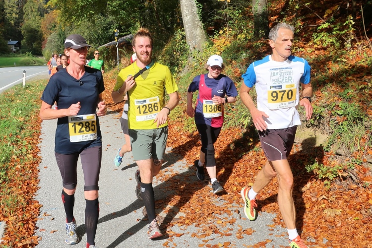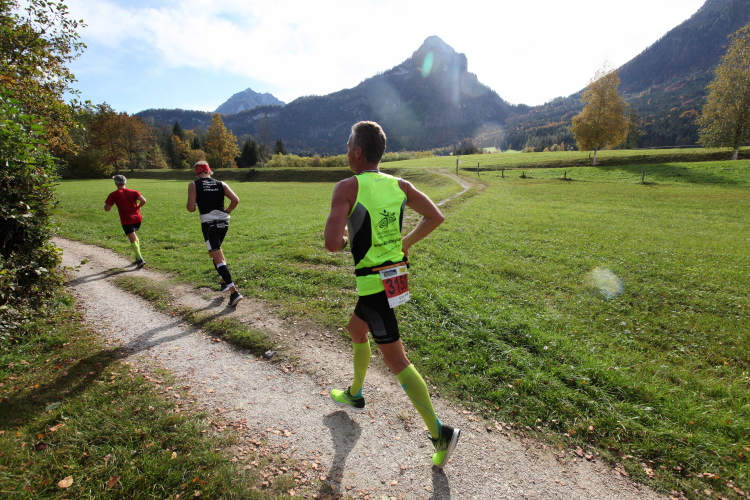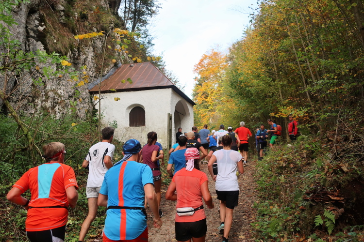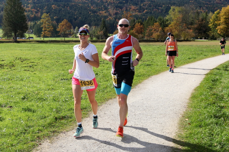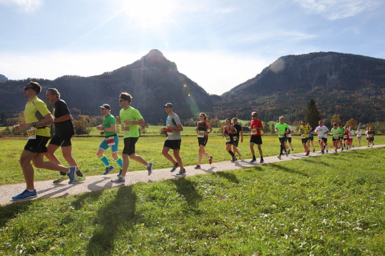 In leichtem Auf und Ab, Ersteres überwiegend, windet sich im Folgenden unser Kurs auf kleinen Asphaltsträßchen inmitten der berggerahmten Naturkulisse durch saftig grüne Wiesen und Weiden, vorbei an kleinen Weilern und Höfen. Der Herbst präsentiert sich von seiner schönsten Seite, indem er das bunt gefärbte Laub der Bäume im Sonnenlicht erstrahlen lässt. Interessiert nehmen hier allein die Kühe von uns Notiz. Sehr entspannend, geradezu meditativ ist das Laufen und ich lasse mich, noch frisch und motiviert, gerne dazu verlocken, das Tempo hoch zu halten. Zumal ich das Ziel habe, zum Start des 27ers ab 10:30 Uhr St. Wolfgang zu erreichen, um dann die Stimmung live erleben zu können, für die der Hauptlauf so bekannt ist. Hier und jetzt ist das jedoch so ganz anders. Weit hat sich das Band der Marathonis auseinander gezogen.