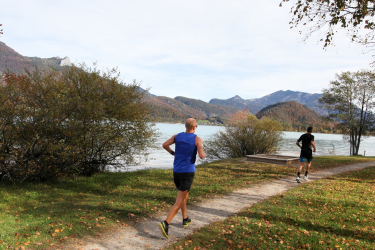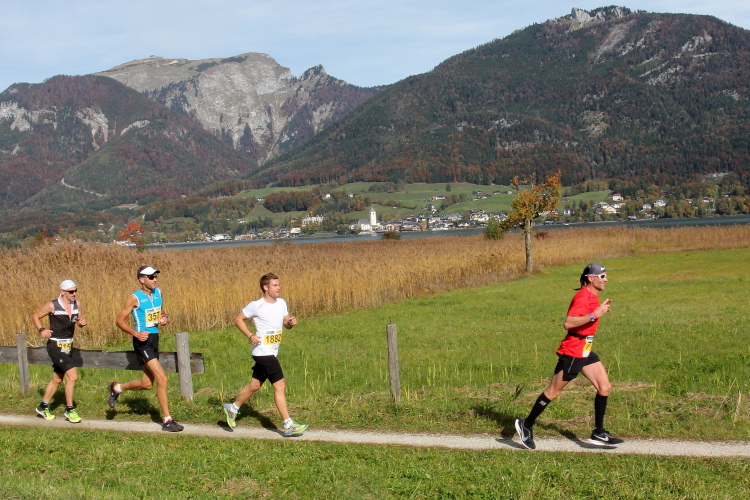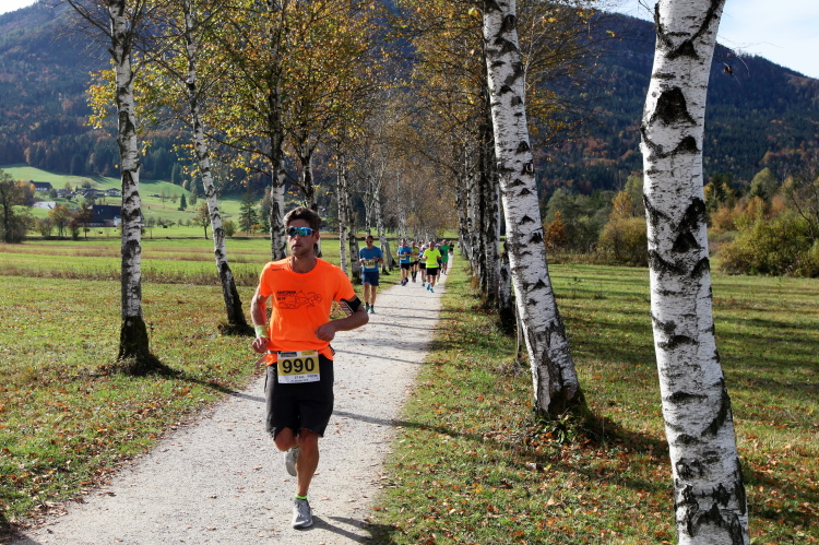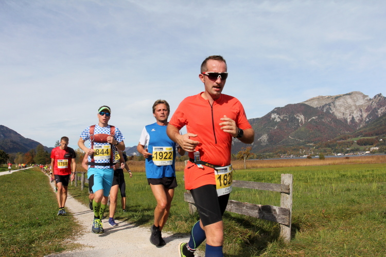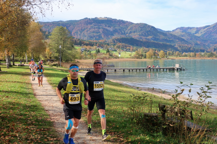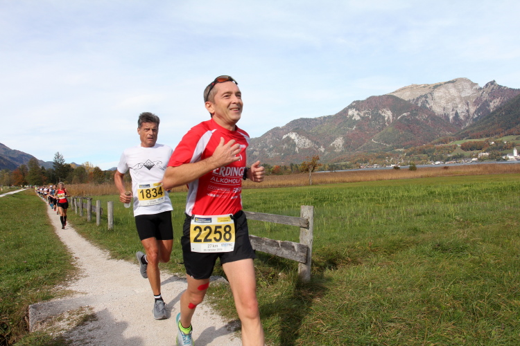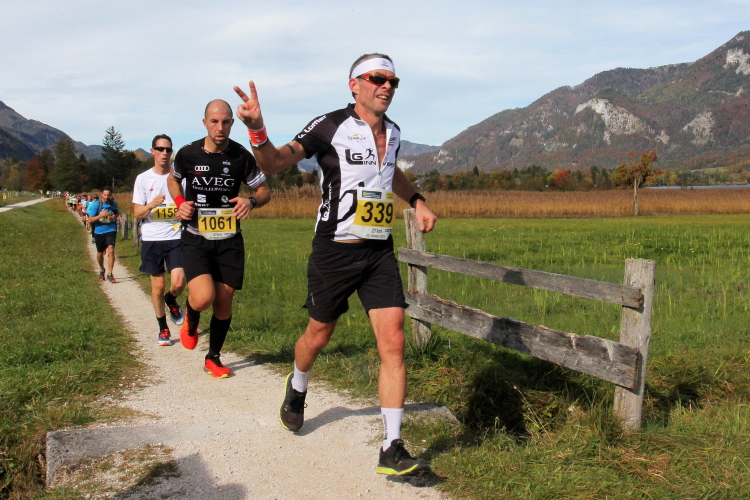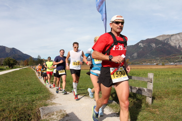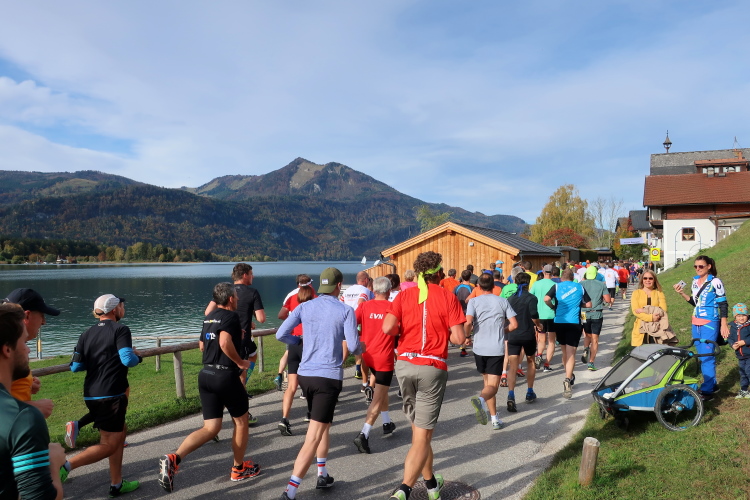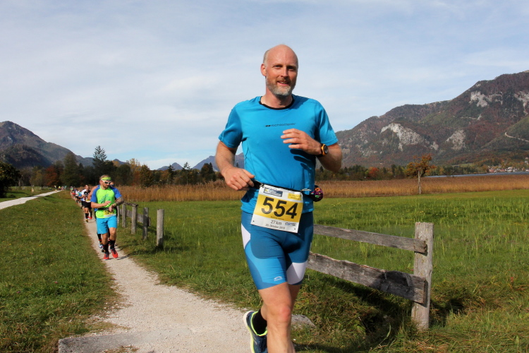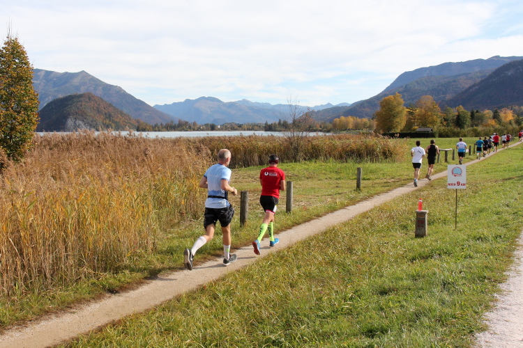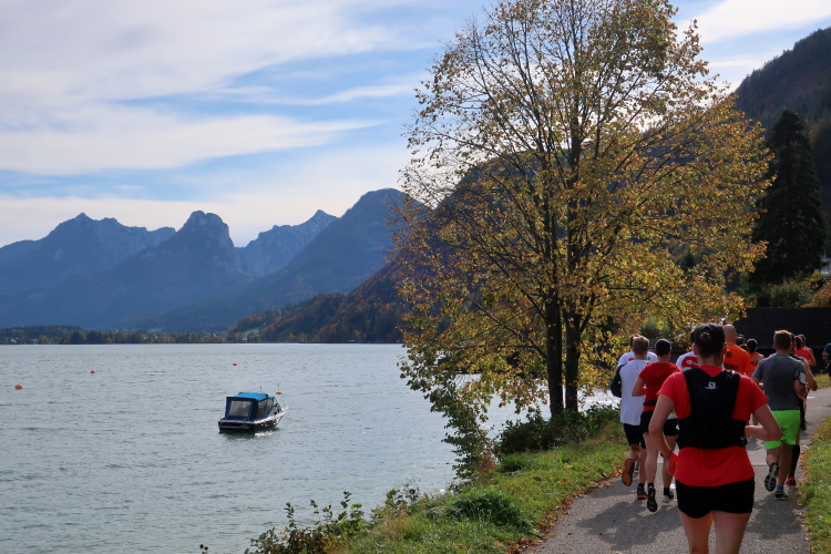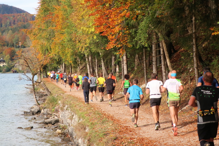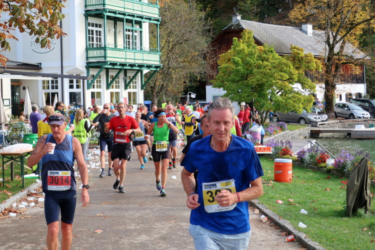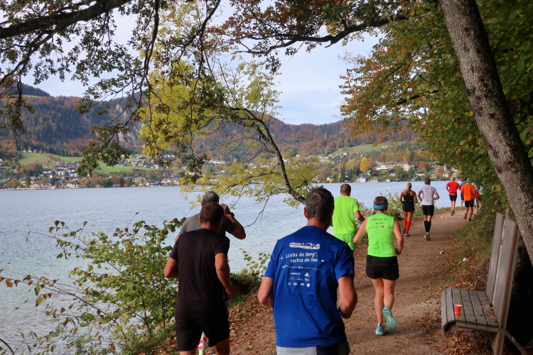In direktem Kontakt zum See bleiben wir auch auf unserem weiteren Weg entlang des Südufers. Über Kilometer folgen wir dem bequemen, breiten Fußgängerweg mit stetiger Sicht auf die Berge, die herbstliche Natur und vor allem natürlich den See. Einziger akustischer Störfaktor ist die von St. Gilgen nach Bad Ischl führende Durchgangsstraße, die zunächst noch in angenehmer Distanz verläuft, der wir schließlich aber doch ziemlich nahe rücken. Aber: Geht nicht anders. Die gesamte Passage ist dennoch eine Idealstrecke für entspanntes Jogging. Zumindest wäre sie das, wenn ich noch entspannt wäre. Umso mehr schätze ich nun die Verpflegungsstellen, die uns etwa alle fünf Kilometer erwarten. Wasser, Isotonisches und Früchtetee gehören ebenso zum Standard wie Bananen, Äpfel und Brot. Vor dem Gasthaus Gamsjaga kurz vor km 29 offeriert zu rockiger Live-Musik ein entsprechend gewandeter Rauschebartträger gar frisches Stiegl-Bier. Sehr verlockend, aber ich traue mich dann doch nicht.