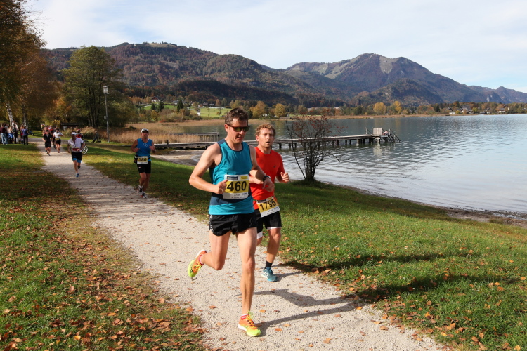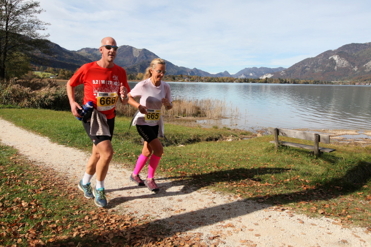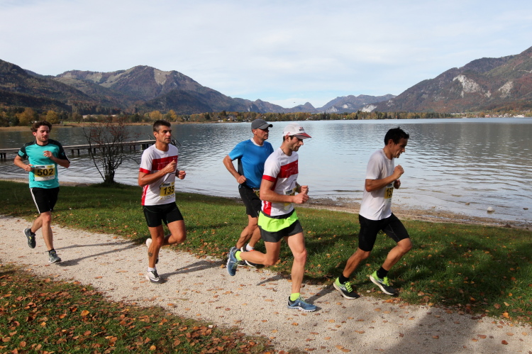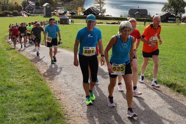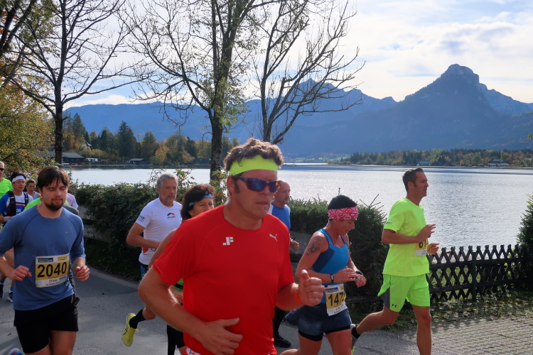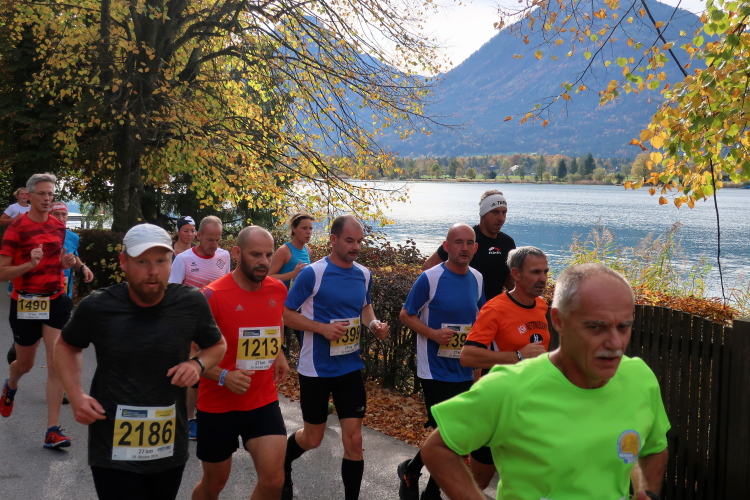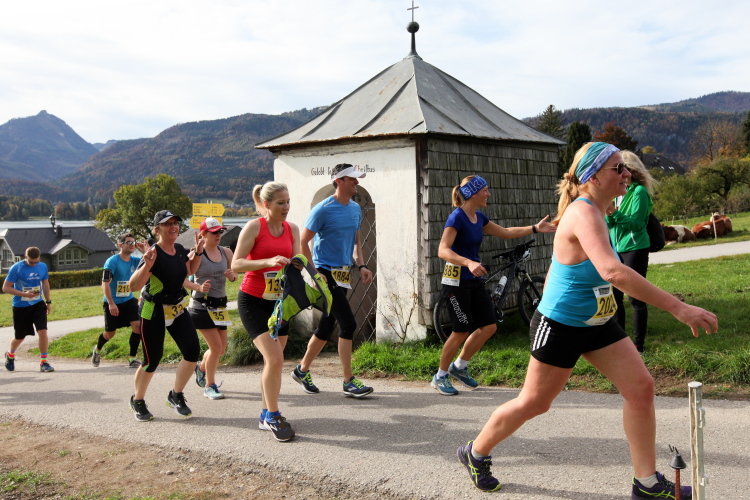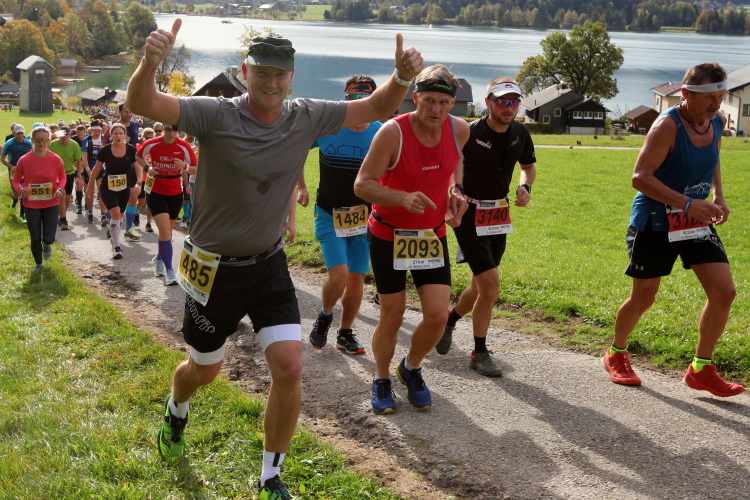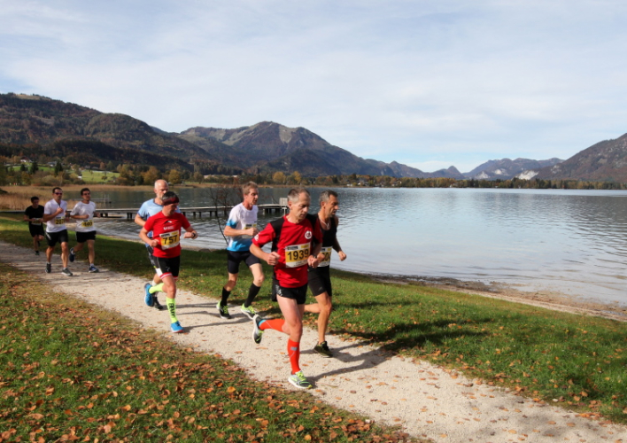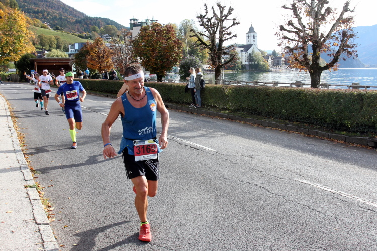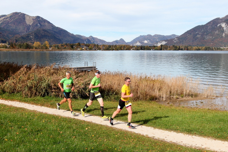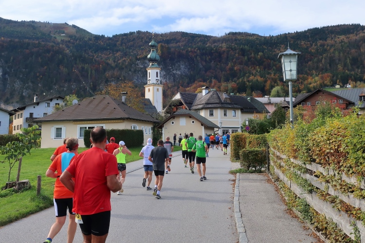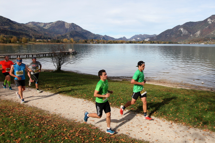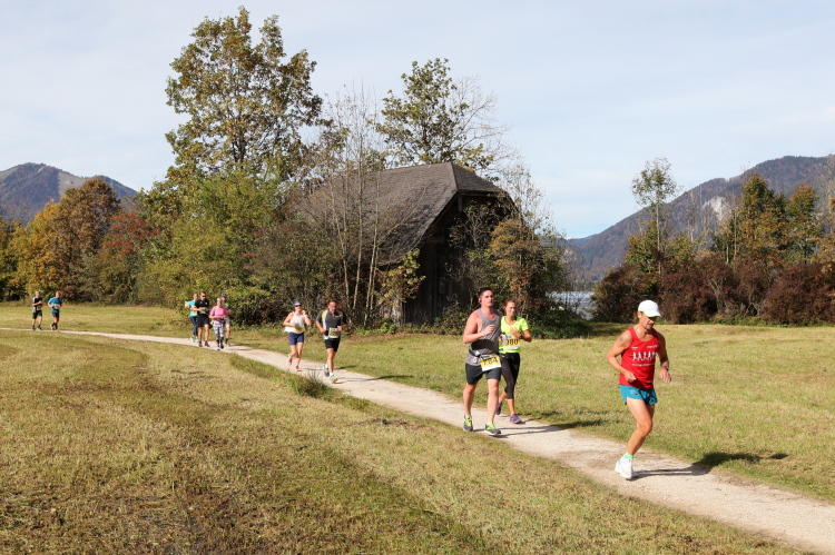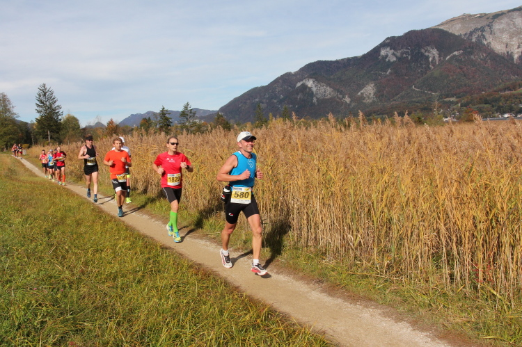 In direktem Kontakt zum See bleiben wir auch auf unserem weiteren Weg entlang des Südufers. Über Kilometer folgen wir dem bequemen, breiten Fußgängerweg mit stetiger Sicht auf die Berge, die herbstliche Natur und vor allem natürlich den See. Einziger akustischer Störfaktor ist die von St. Gilgen nach Bad Ischl führende Durchgangsstraße, die zunächst noch in angenehmer Distanz verläuft, der wir schließlich aber doch ziemlich nahe rücken. Aber: Geht nicht anders. Die gesamte Passage ist dennoch eine Idealstrecke für entspanntes Jogging. Zumindest wäre sie das, wenn ich noch entspannt wäre. Umso mehr schätze ich nun die Verpflegungsstellen, die uns etwa alle fünf Kilometer erwarten. Wasser, Isotonisches und Früchtetee gehören ebenso zum Standard wie Bananen, Äpfel und Brot. Vor dem Gasthaus Gamsjaga kurz vor km 29 offeriert zu rockiger Live-Musik ein entsprechend gewandeter Rauschebartträger gar frisches Stiegl-Bier. Sehr verlockend, aber ich traue mich dann doch nicht.