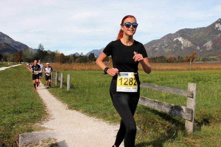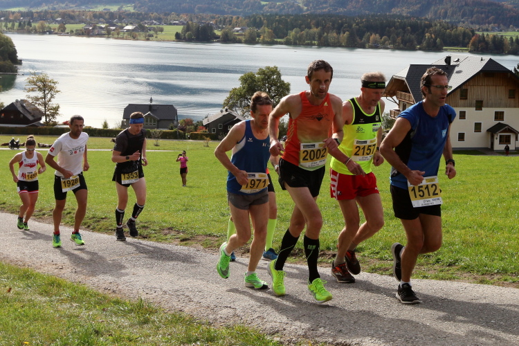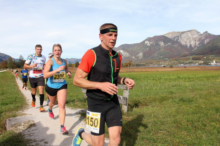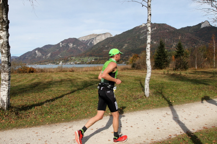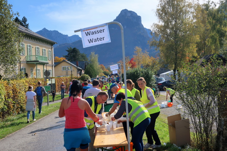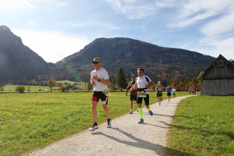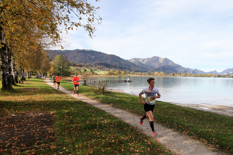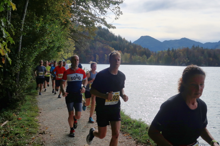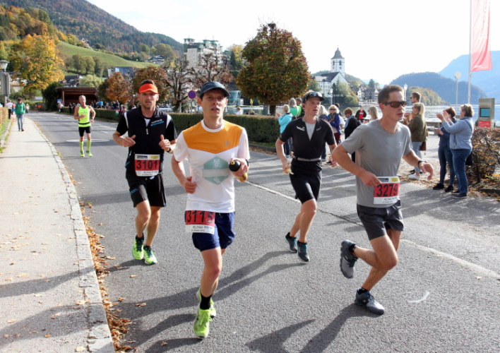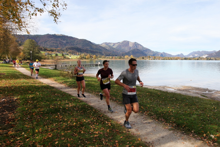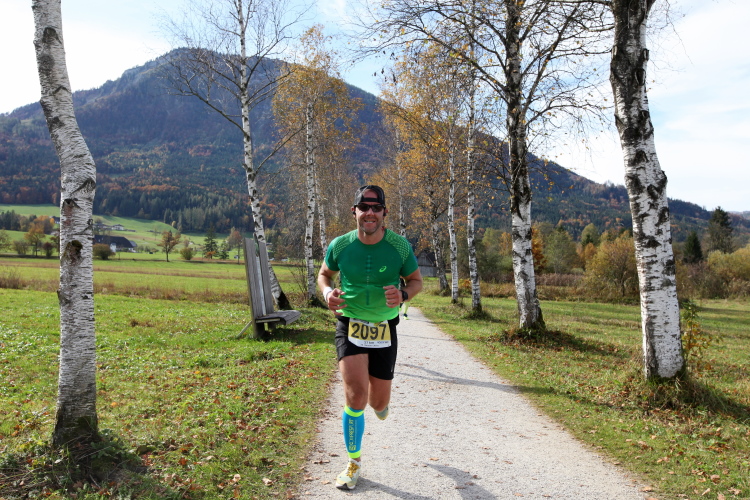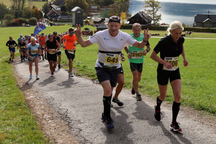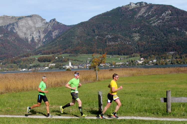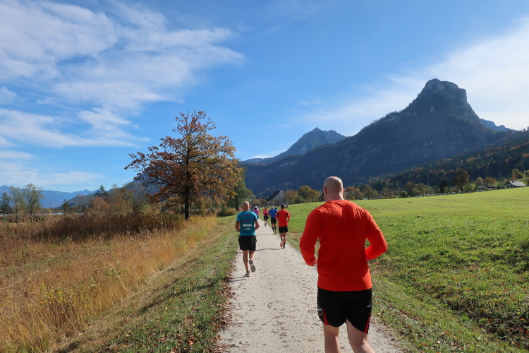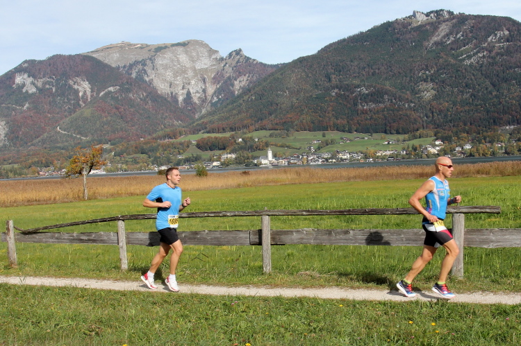 In direktem Kontakt zum See bleiben wir auch auf unserem weiteren Weg entlang des Südufers. Über Kilometer folgen wir dem bequemen, breiten Fußgängerweg mit stetiger Sicht auf die Berge, die herbstliche Natur und vor allem natürlich den See. Einziger akustischer Störfaktor ist die von St. Gilgen nach Bad Ischl führende Durchgangsstraße, die zunächst noch in angenehmer Distanz verläuft, der wir schließlich aber doch ziemlich nahe rücken. Aber: Geht nicht anders. Die gesamte Passage ist dennoch eine Idealstrecke für entspanntes Jogging. Zumindest wäre sie das, wenn ich noch entspannt wäre. Umso mehr schätze ich nun die Verpflegungsstellen, die uns etwa alle fünf Kilometer erwarten. Wasser, Isotonisches und Früchtetee gehören ebenso zum Standard wie Bananen, Äpfel und Brot. Vor dem Gasthaus Gamsjaga kurz vor km 29 offeriert zu rockiger Live-Musik ein entsprechend gewandeter Rauschebartträger gar frisches Stiegl-Bier. Sehr verlockend, aber ich traue mich dann doch nicht.