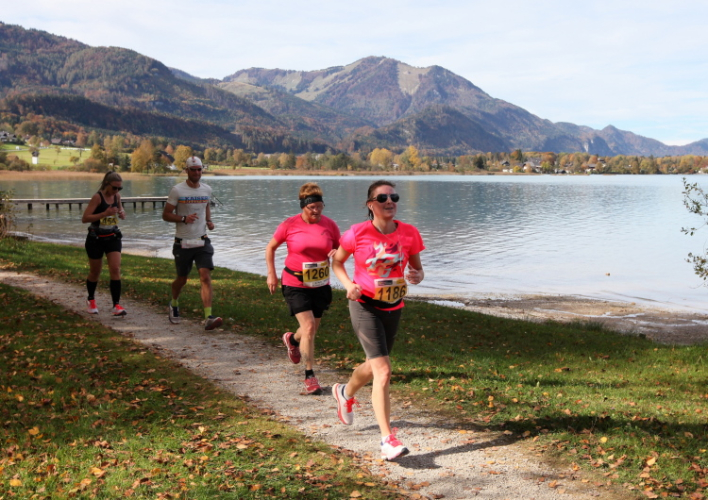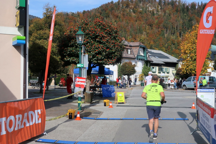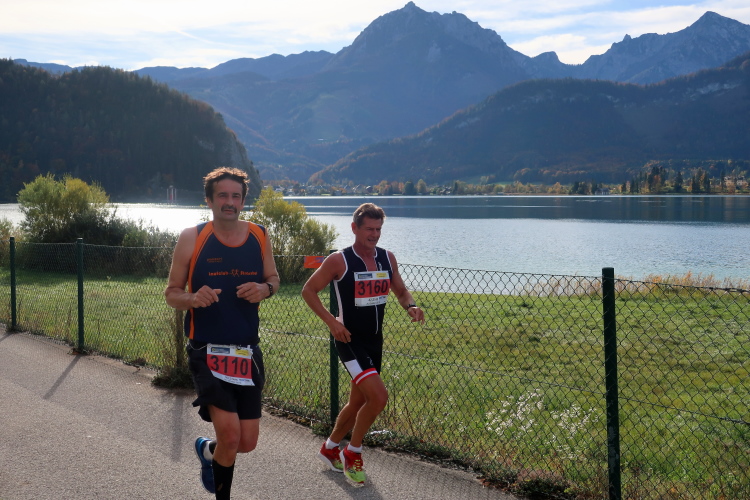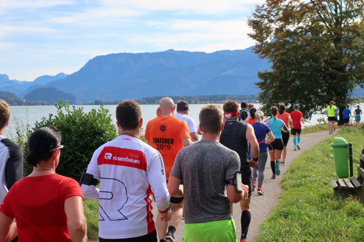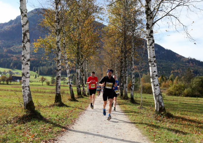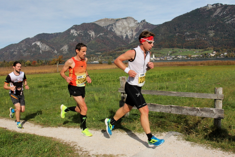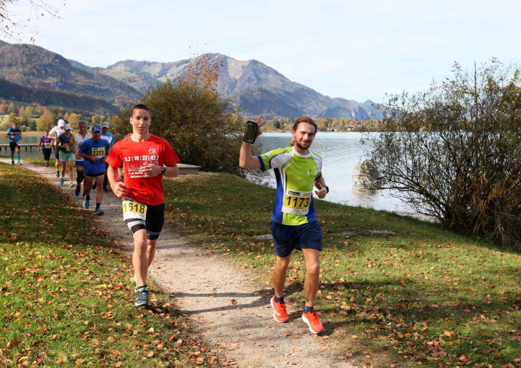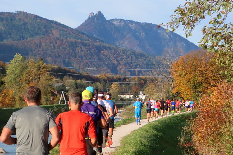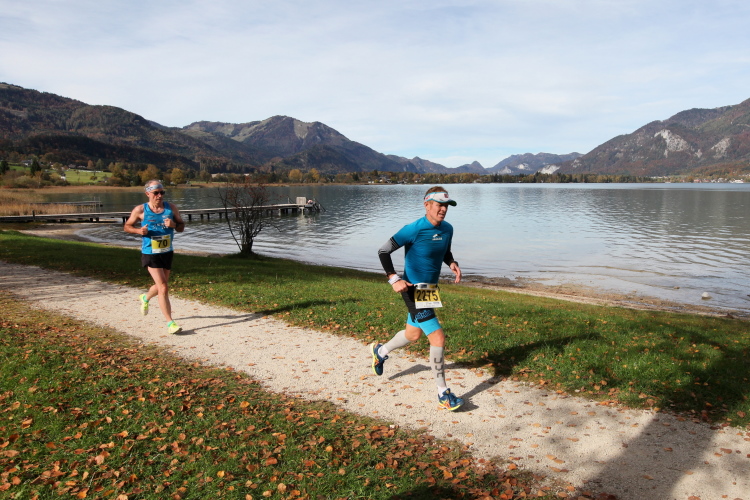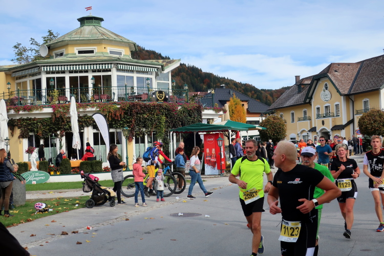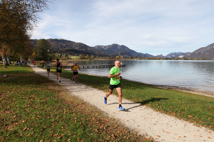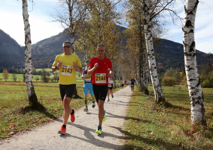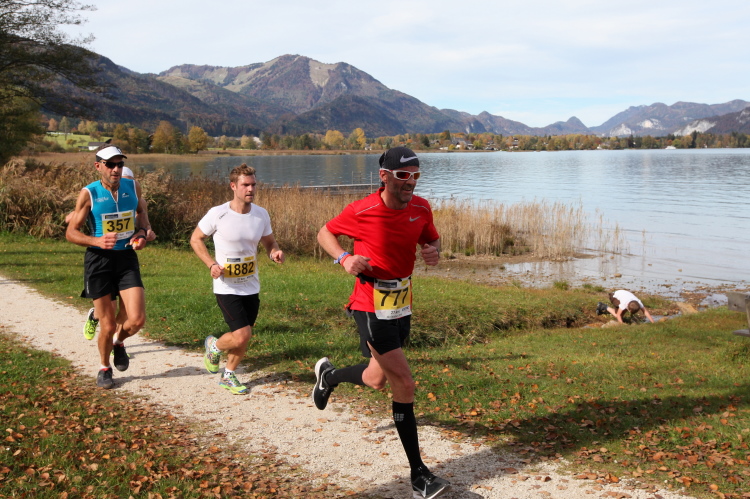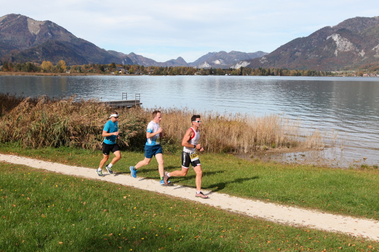 In direktem Kontakt zum See bleiben wir auch auf unserem weiteren Weg entlang des Südufers. Über Kilometer folgen wir dem bequemen, breiten Fußgängerweg mit stetiger Sicht auf die Berge, die herbstliche Natur und vor allem natürlich den See. Einziger akustischer Störfaktor ist die von St. Gilgen nach Bad Ischl führende Durchgangsstraße, die zunächst noch in angenehmer Distanz verläuft, der wir schließlich aber doch ziemlich nahe rücken. Aber: Geht nicht anders. Die gesamte Passage ist dennoch eine Idealstrecke für entspanntes Jogging. Zumindest wäre sie das, wenn ich noch entspannt wäre. Umso mehr schätze ich nun die Verpflegungsstellen, die uns etwa alle fünf Kilometer erwarten. Wasser, Isotonisches und Früchtetee gehören ebenso zum Standard wie Bananen, Äpfel und Brot. Vor dem Gasthaus Gamsjaga kurz vor km 29 offeriert zu rockiger Live-Musik ein entsprechend gewandeter Rauschebartträger gar frisches Stiegl-Bier. Sehr verlockend, aber ich traue mich dann doch nicht.