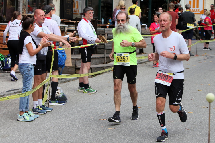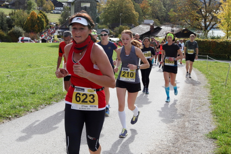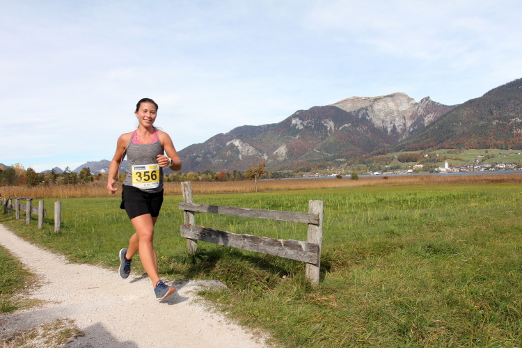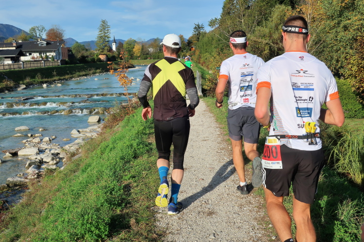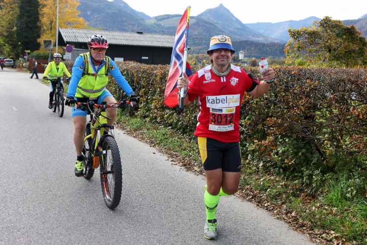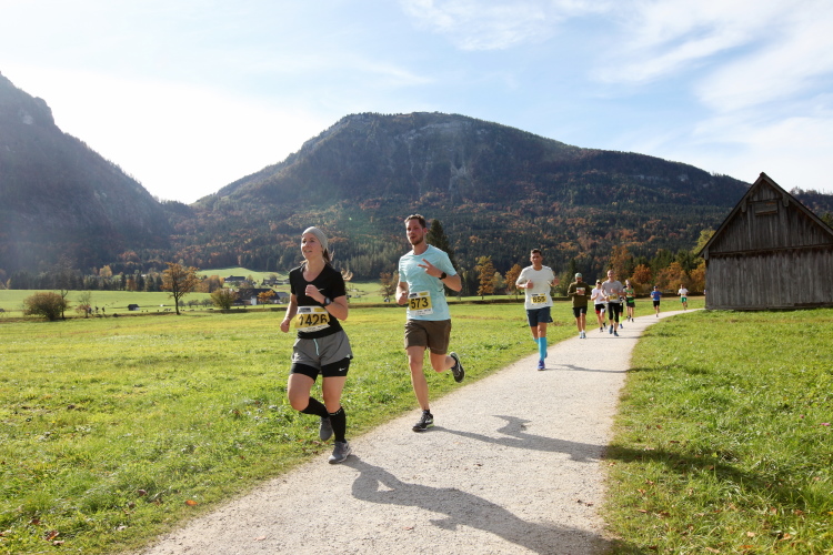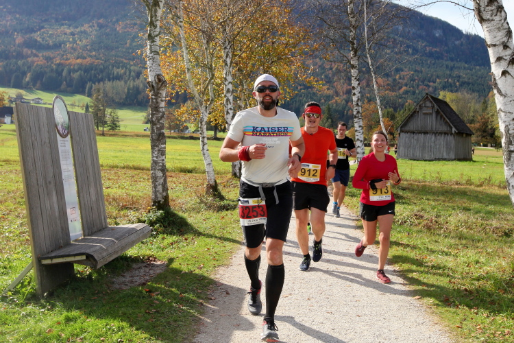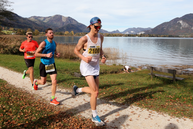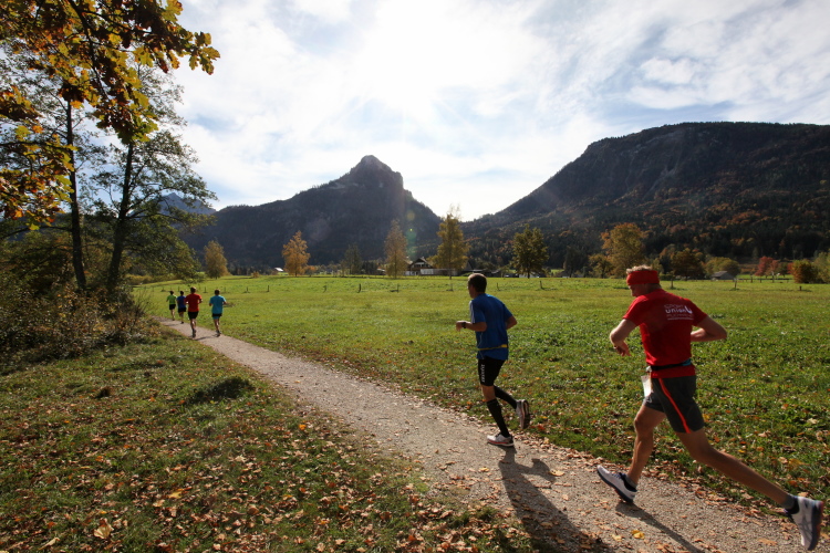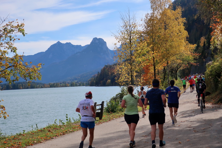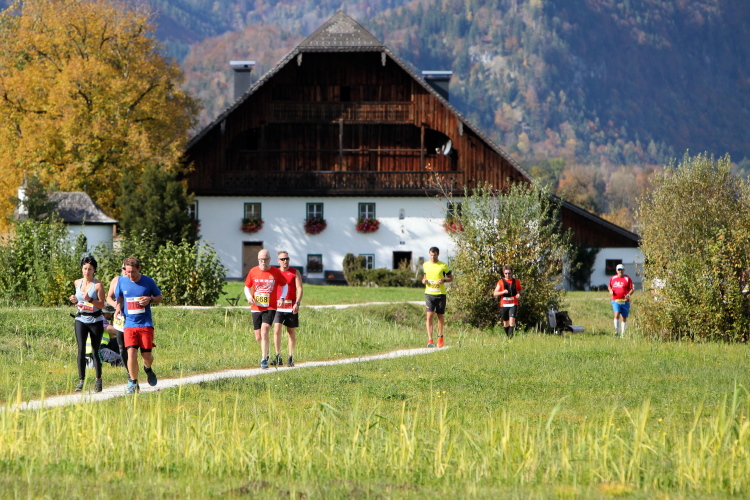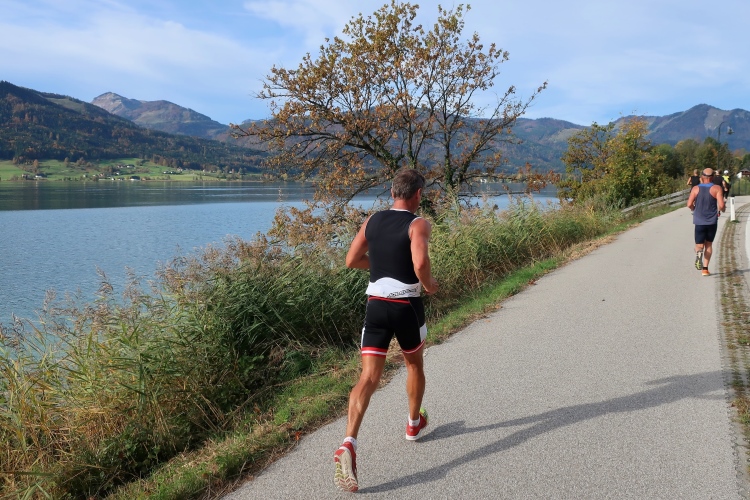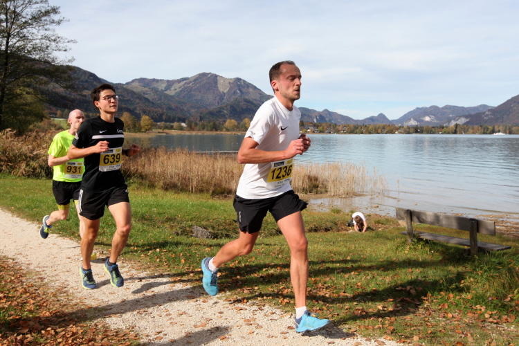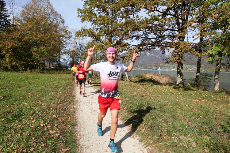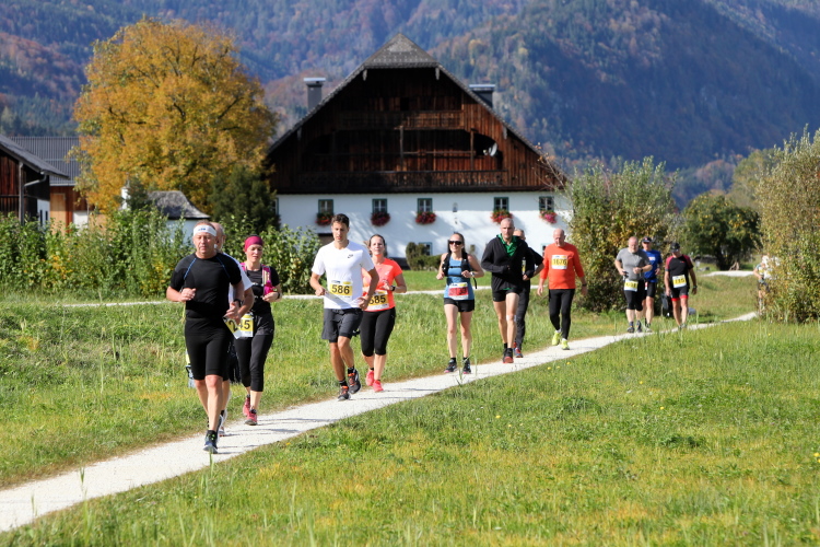 In direktem Kontakt zum See bleiben wir auch auf unserem weiteren Weg entlang des Südufers. Über Kilometer folgen wir dem bequemen, breiten Fußgängerweg mit stetiger Sicht auf die Berge, die herbstliche Natur und vor allem natürlich den See. Einziger akustischer Störfaktor ist die von St. Gilgen nach Bad Ischl führende Durchgangsstraße, die zunächst noch in angenehmer Distanz verläuft, der wir schließlich aber doch ziemlich nahe rücken. Aber: Geht nicht anders. Die gesamte Passage ist dennoch eine Idealstrecke für entspanntes Jogging. Zumindest wäre sie das, wenn ich noch entspannt wäre. Umso mehr schätze ich nun die Verpflegungsstellen, die uns etwa alle fünf Kilometer erwarten. Wasser, Isotonisches und Früchtetee gehören ebenso zum Standard wie Bananen, Äpfel und Brot. Vor dem Gasthaus Gamsjaga kurz vor km 29 offeriert zu rockiger Live-Musik ein entsprechend gewandeter Rauschebartträger gar frisches Stiegl-Bier. Sehr verlockend, aber ich traue mich dann doch nicht.