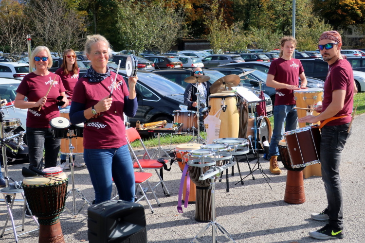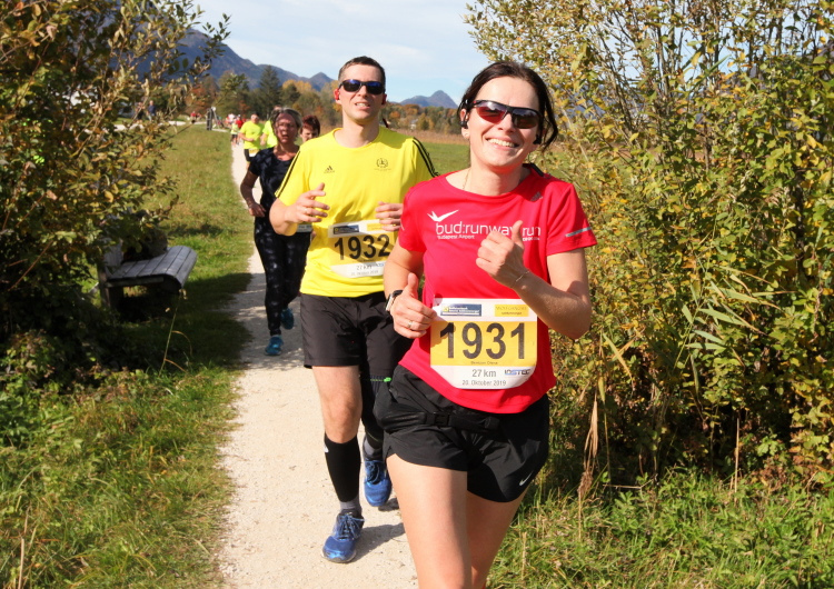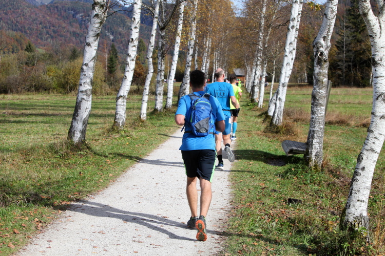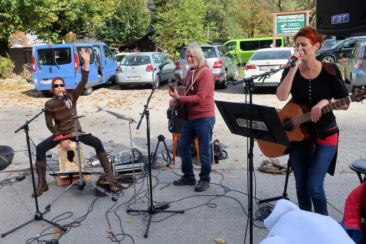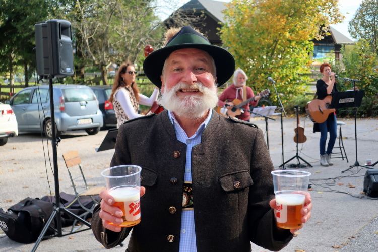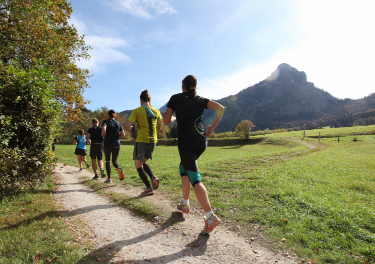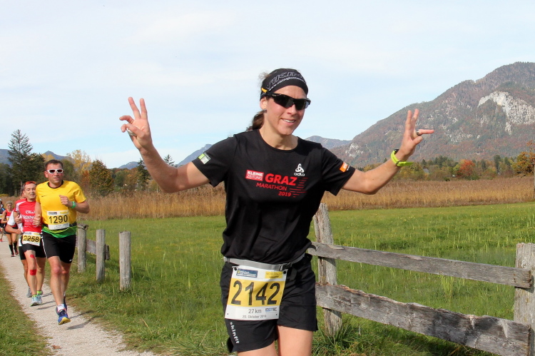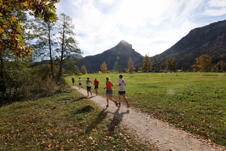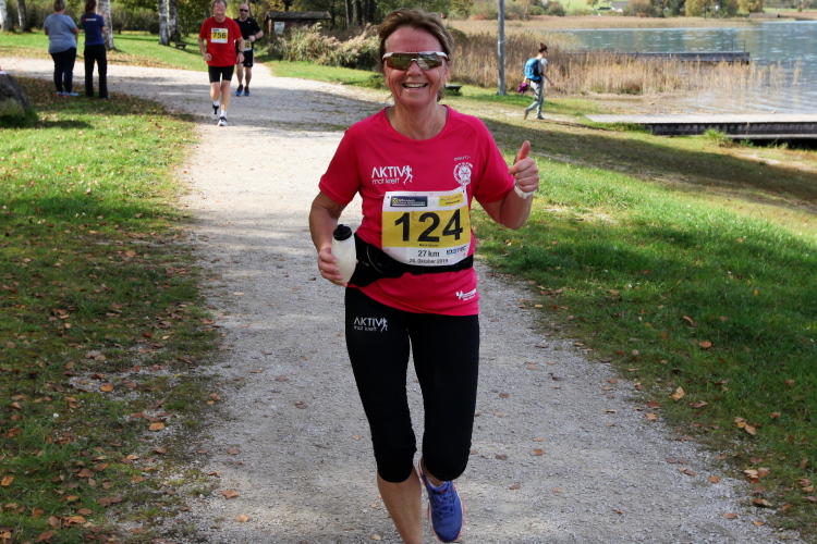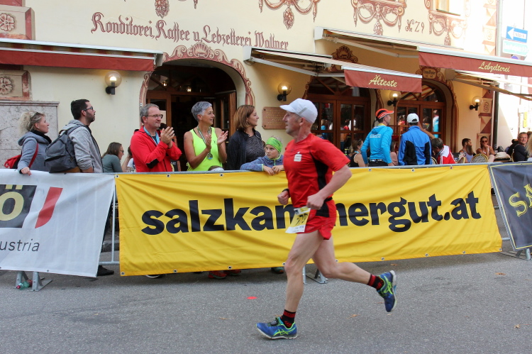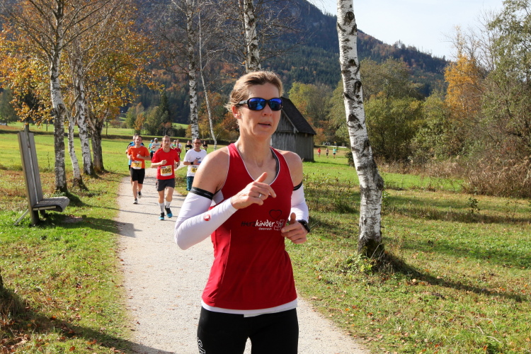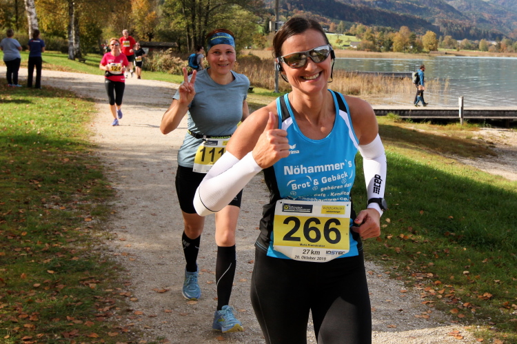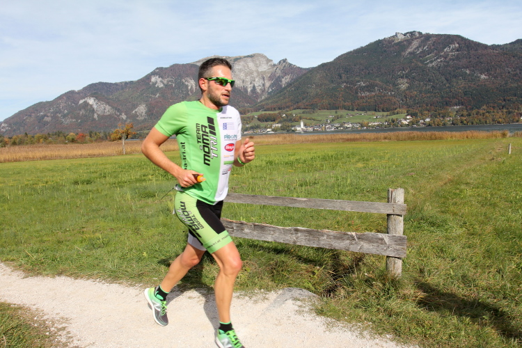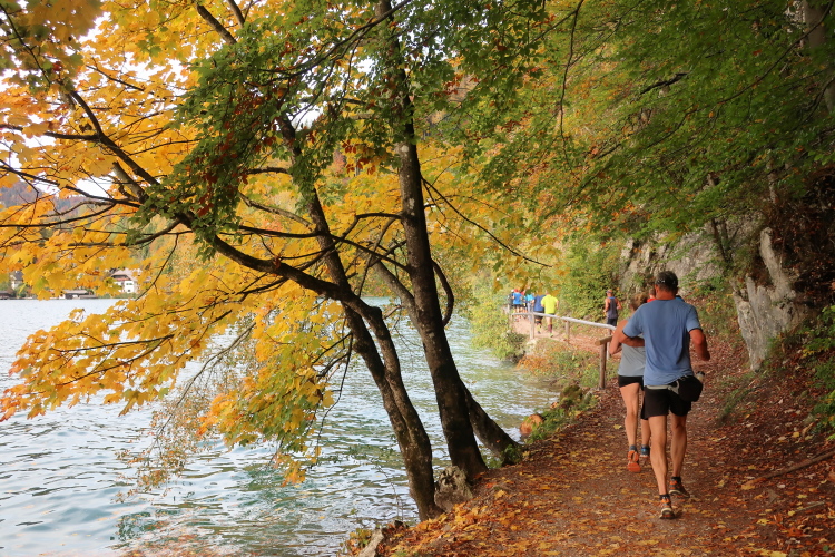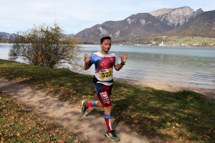 In direktem Kontakt zum See bleiben wir auch auf unserem weiteren Weg entlang des Südufers. Über Kilometer folgen wir dem bequemen, breiten Fußgängerweg mit stetiger Sicht auf die Berge, die herbstliche Natur und vor allem natürlich den See. Einziger akustischer Störfaktor ist die von St. Gilgen nach Bad Ischl führende Durchgangsstraße, die zunächst noch in angenehmer Distanz verläuft, der wir schließlich aber doch ziemlich nahe rücken. Aber: Geht nicht anders. Die gesamte Passage ist dennoch eine Idealstrecke für entspanntes Jogging. Zumindest wäre sie das, wenn ich noch entspannt wäre. Umso mehr schätze ich nun die Verpflegungsstellen, die uns etwa alle fünf Kilometer erwarten. Wasser, Isotonisches und Früchtetee gehören ebenso zum Standard wie Bananen, Äpfel und Brot. Vor dem Gasthaus Gamsjaga kurz vor km 29 offeriert zu rockiger Live-Musik ein entsprechend gewandeter Rauschebartträger gar frisches Stiegl-Bier. Sehr verlockend, aber ich traue mich dann doch nicht.