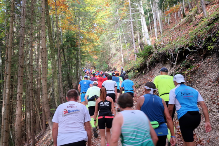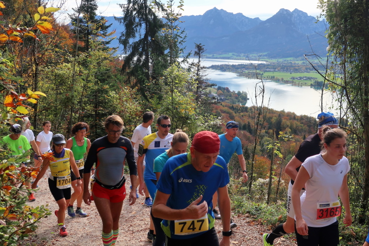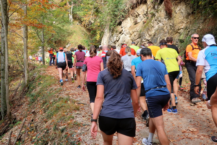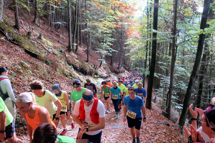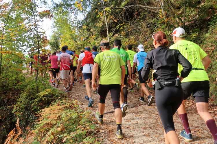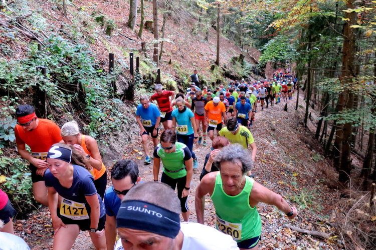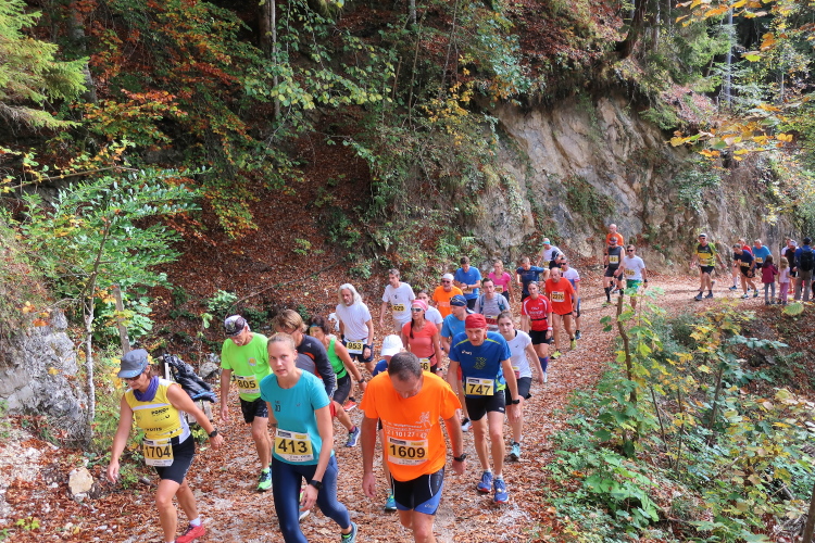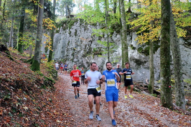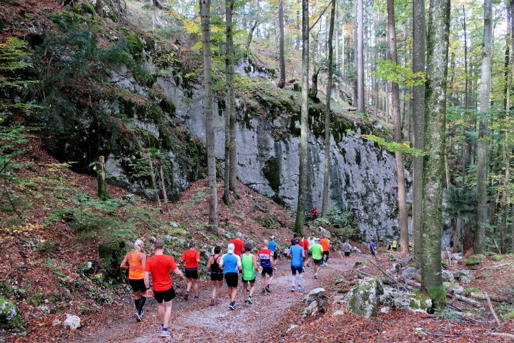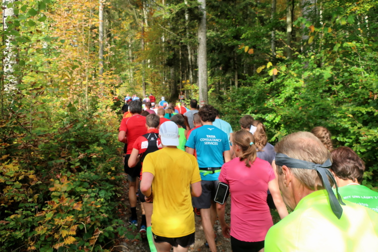 Allzu viele Blicke für die Umgebung sollte man allerdings nicht riskieren. Konzentration ist nun angesagt, denn steiler als es zuvor bergan ging, geht es nun durch den Wald hinab in die Tiefe. Hier zeigt sich, in wessen Brust ein wahres Bergläuferherz schlägt. Während die einen in vollem Lauf hinab preschen, tasten sich andere über Laub und Geröll fast schon übervorsichtig nach unten.
