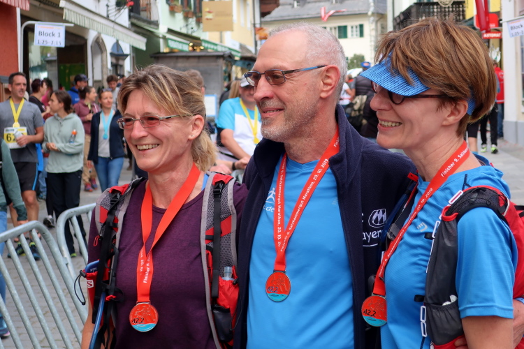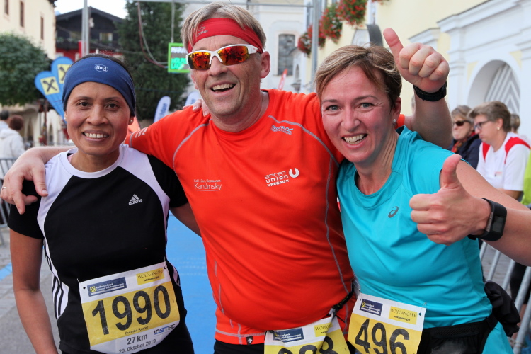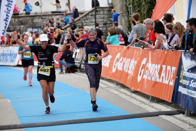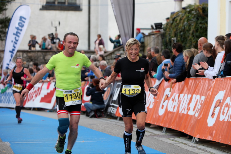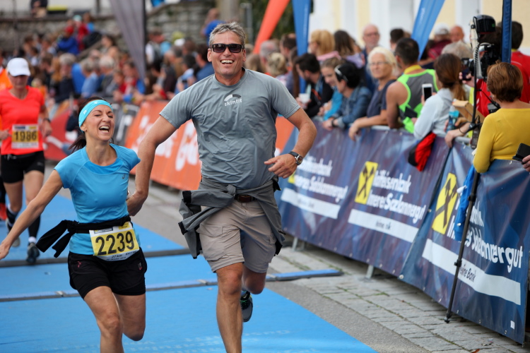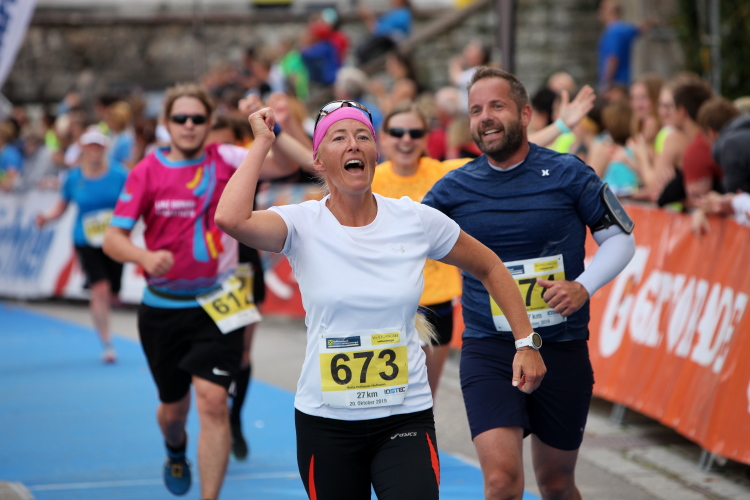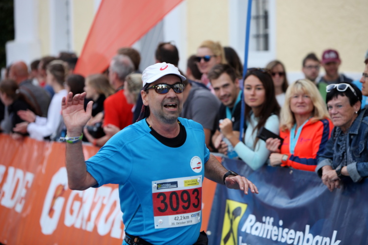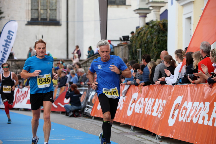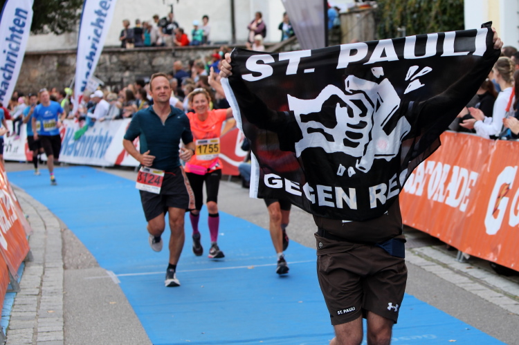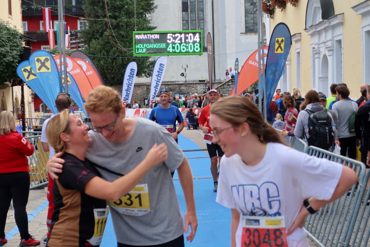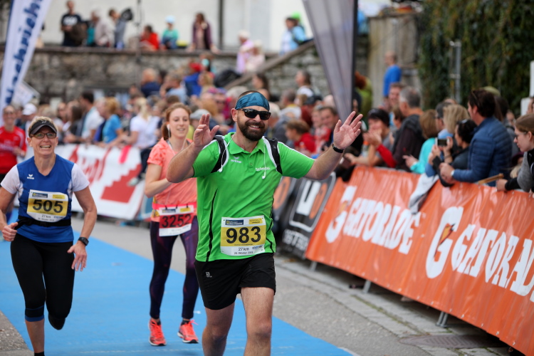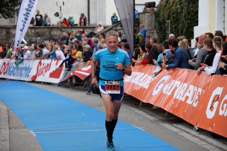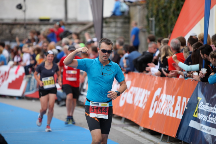 Aber wie immer bei einem Marathon ist auch hier die Erlösung so gewiss wie das Amen in der Kirche. Der Weg über den menschen- und fahnengesäumten Kirchplatz und über den blauen Teppich hinweg dem Zielbogen entgegen ist ein wahrlich eindrückliches Erlebnis und rundet diesen wunderbaren Lauftag in adäquater Weise ab. Irgendwie verstehen kann ich nun, warum es die Veranstaltung schafft, alljährlich so viele Starter neu und auch wieder zu begeistern. Und es bedeutet schon einiges, wenn ich als Marathonläufer sage: Das nächste Mal würde ich den 27er laufen. Denn gerade und vor allem der ist eine richtig „runde Sache“.