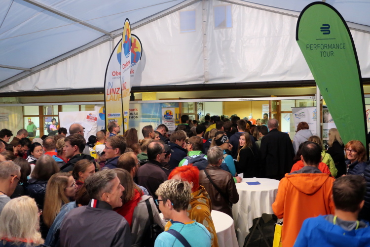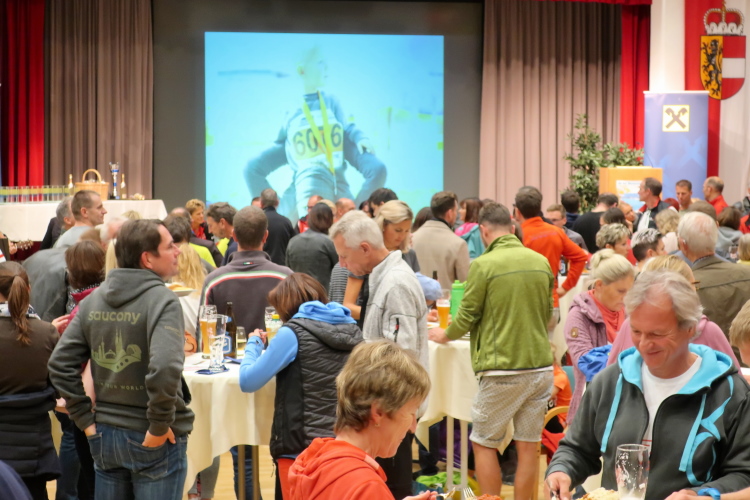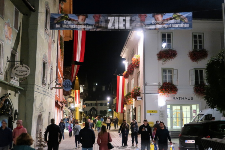 Die Wege aller Läufer führen zunächst nach St. Wolfgang, dorthin, wo der Puls der gesamten Veranstaltung schlägt. Malerisch ist die dörfliche Kulisse, die sich zwischen See und grünem Bergland schmiegt. Im Expozelt neben dem Kongresshaus im Ortszentrum bekomme ich am Samstag die Startunterlagen samt Goody Bag mit allerlei Sponsorengaben. Damit ist das Pre-Race-Programm jedoch keineswegs erschöpft. Ab 18 Uhr heißt es in den Hallen des Kongresshauses "Griaß Eich": Bei überaus leckerer Pasta, stilgerecht auf Porzellan statt Plastik serviert, und freiem Getränk, untermalt von Live-Musik und Großleinwandbildern aus 48 Jahren Wolfgangseelauf, kann man sich auf das Laufereignis einstimmen. Beeindruckend ist der Andrang, was kein Wunder ist bei – über alle angebotenen Distanzen gerechnet - fast 6.000 Teilnehmern, immerhin mehr als das Doppelte der Einwohnerzahl des Ortes.