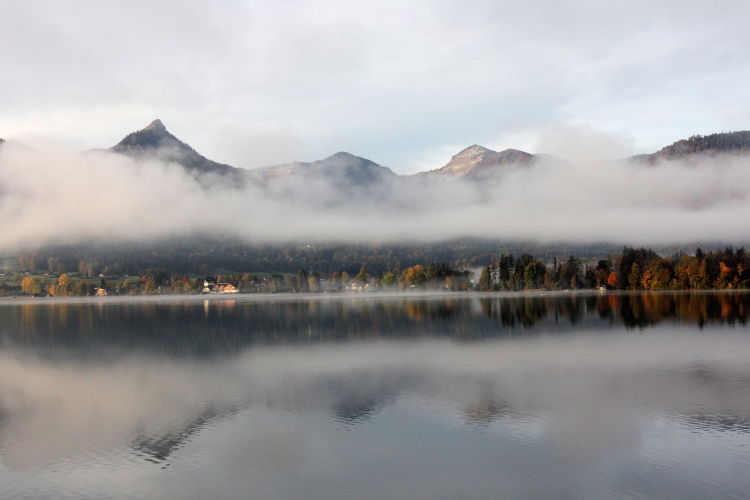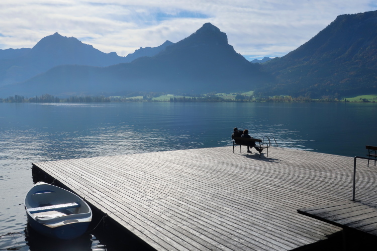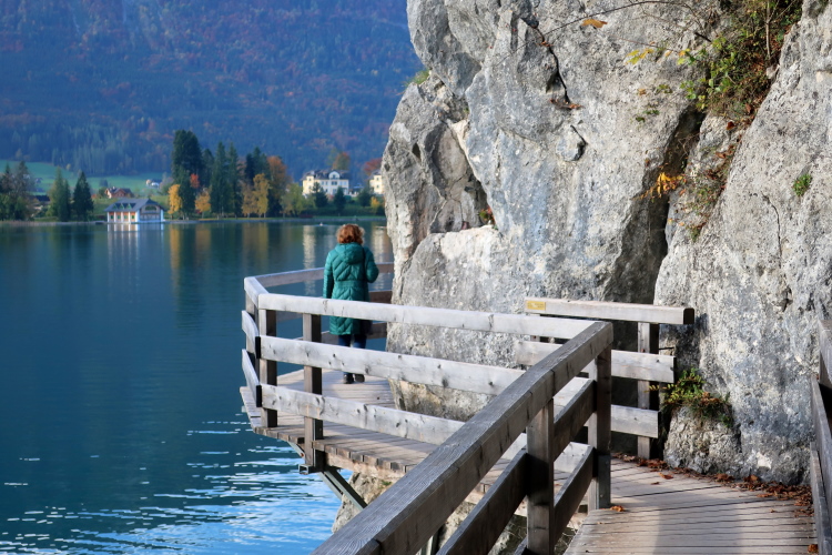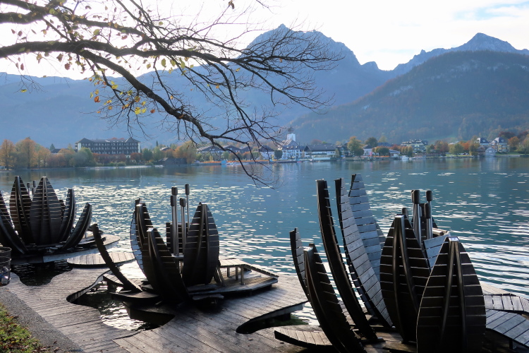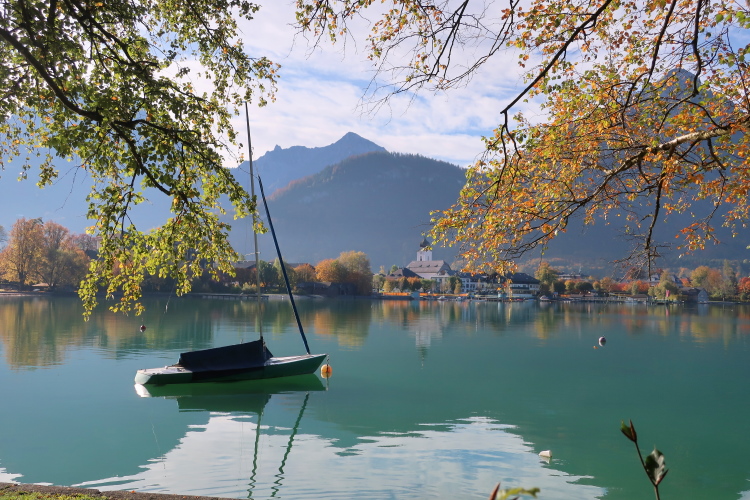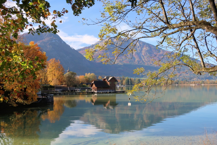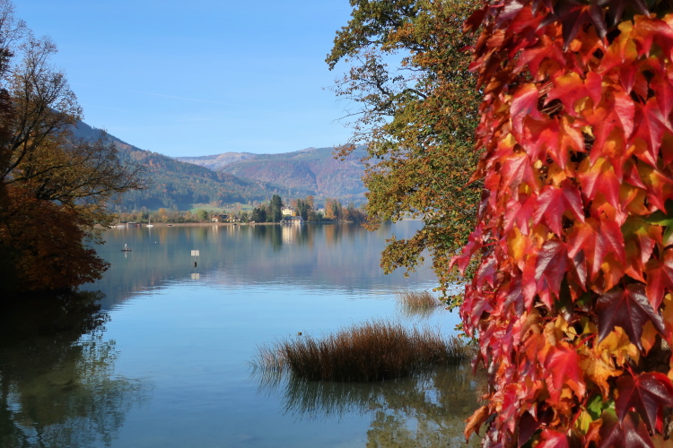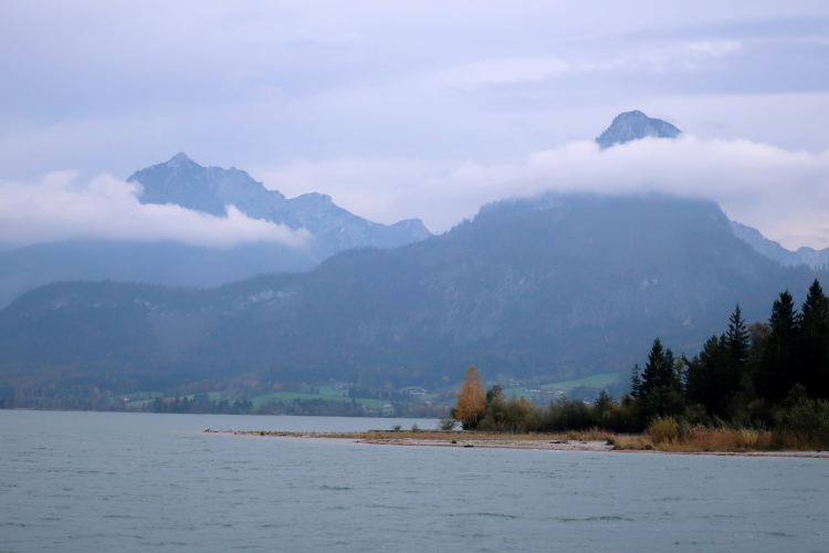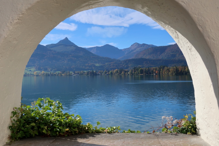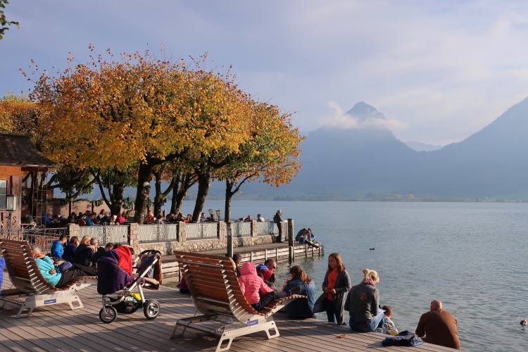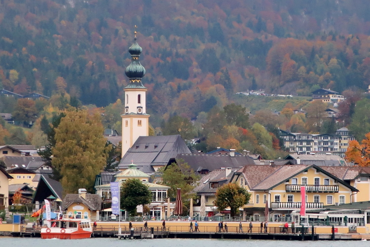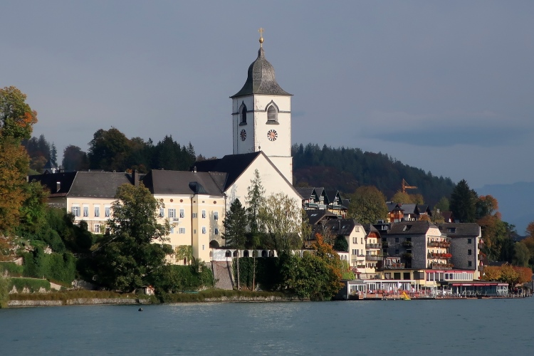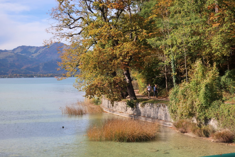Nicht das schönste Wegstück ist allerdings jenes, das uns, einem ufernahen Gehweg folgend, nun weitere drei Kilometer bis nach St. Wolfgang führt. Herrlich ist zwar – über und Böschung hinweg - der Blick auf den See zur Linken, weniger idyllisch mutet allerdings die parallel führende Zufahrtsstraße zur Rechten an, über die die motorisierten Besucher, mittlerweile auch viele aus Fernost, in St. Wolfgang einfallen. Zugegebenermaßen ist das Verkehrsaufkommen um diese Zeit jedoch überschaubar.